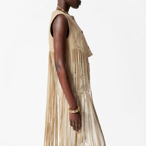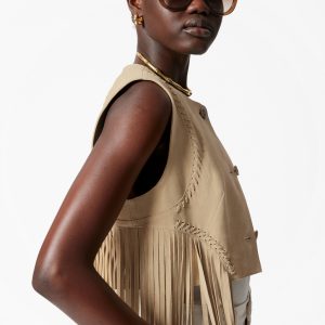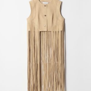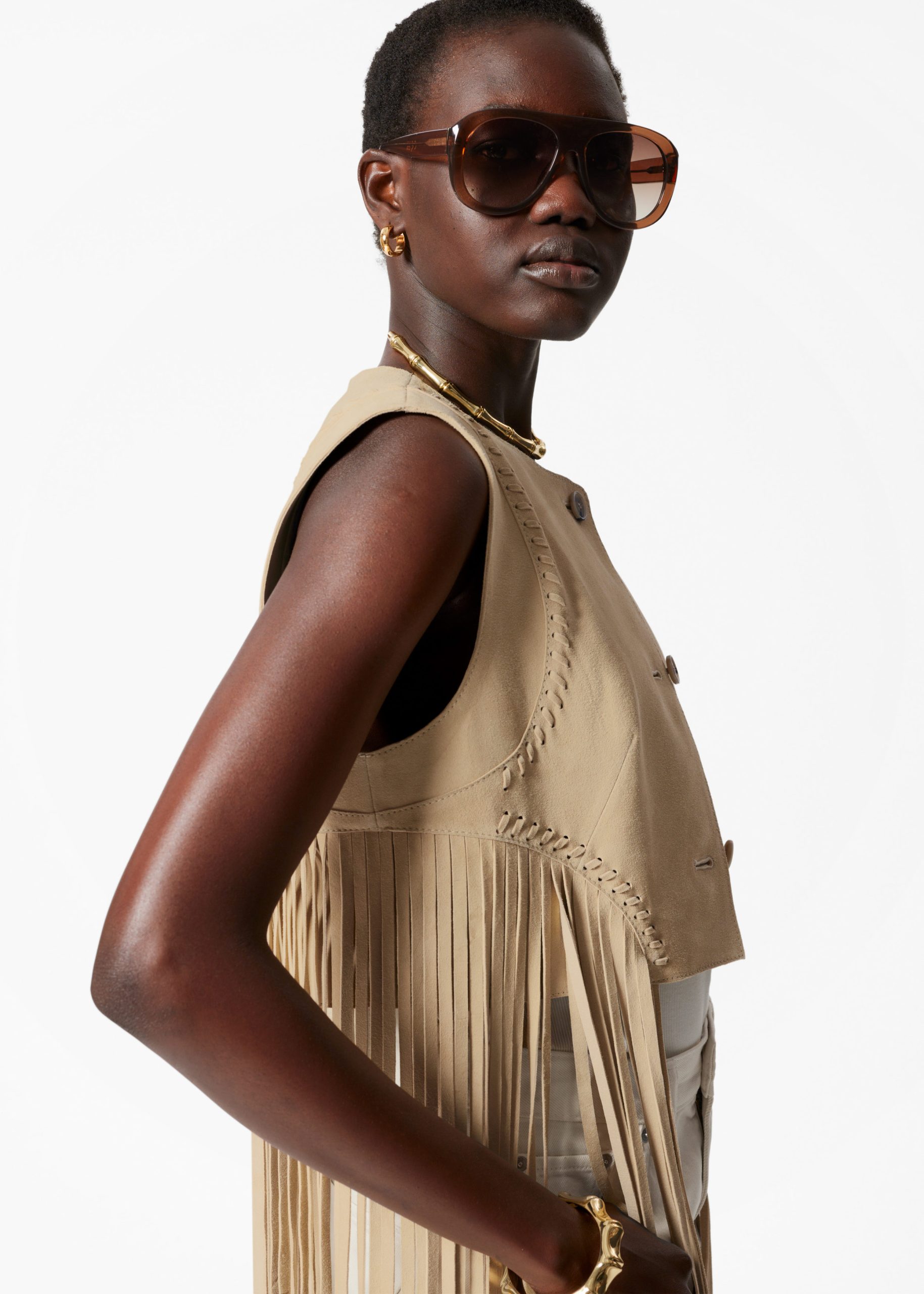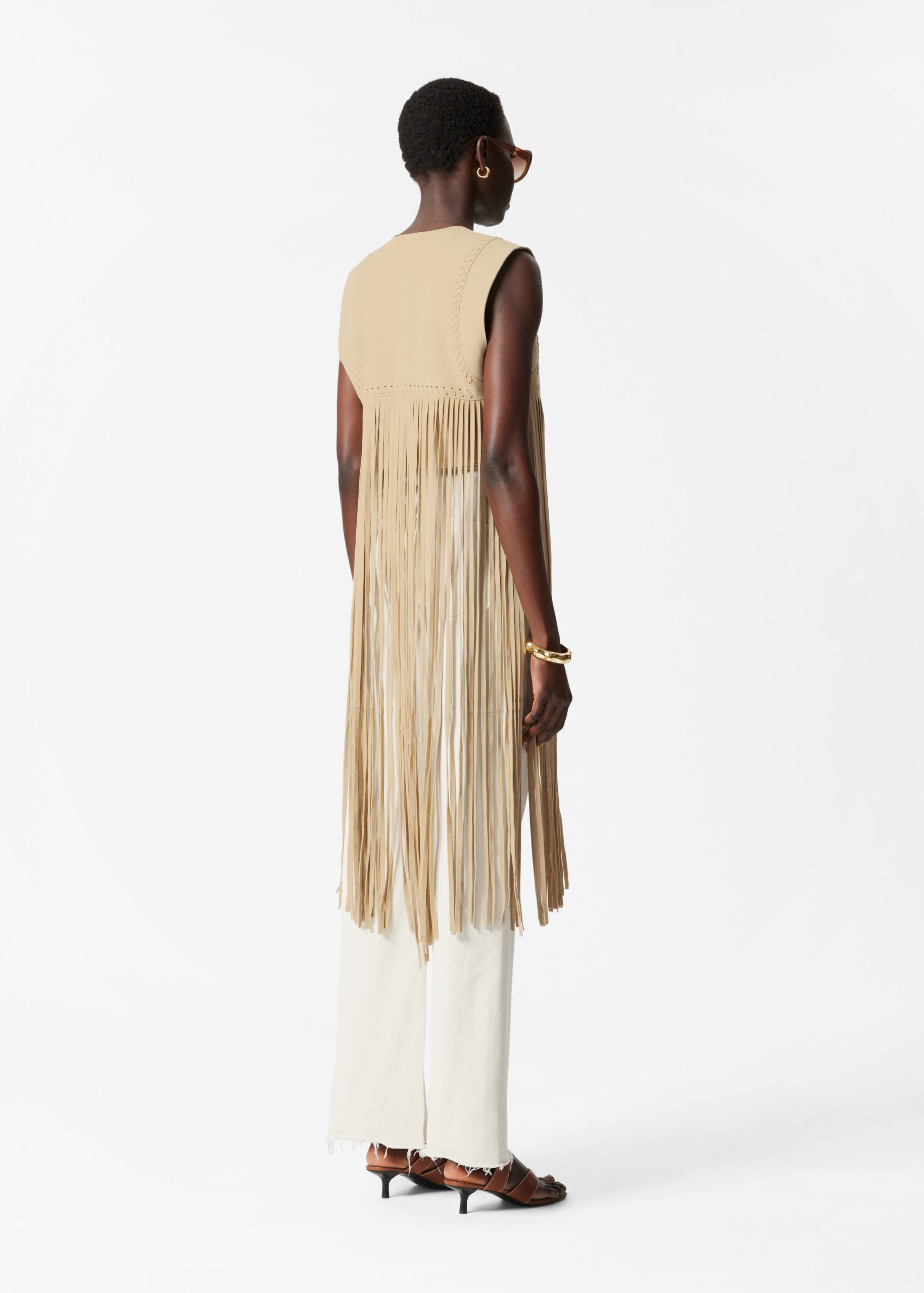 This cropped vest offers a modern take on Western Americana. Crafted from premium goat suede, it has a lightweight feel and matte finish. Detailed with thick, topstitched seams, and long fringes that cascade down the leg, adding movement and dramatic impact. Traced with three button closures along the front.