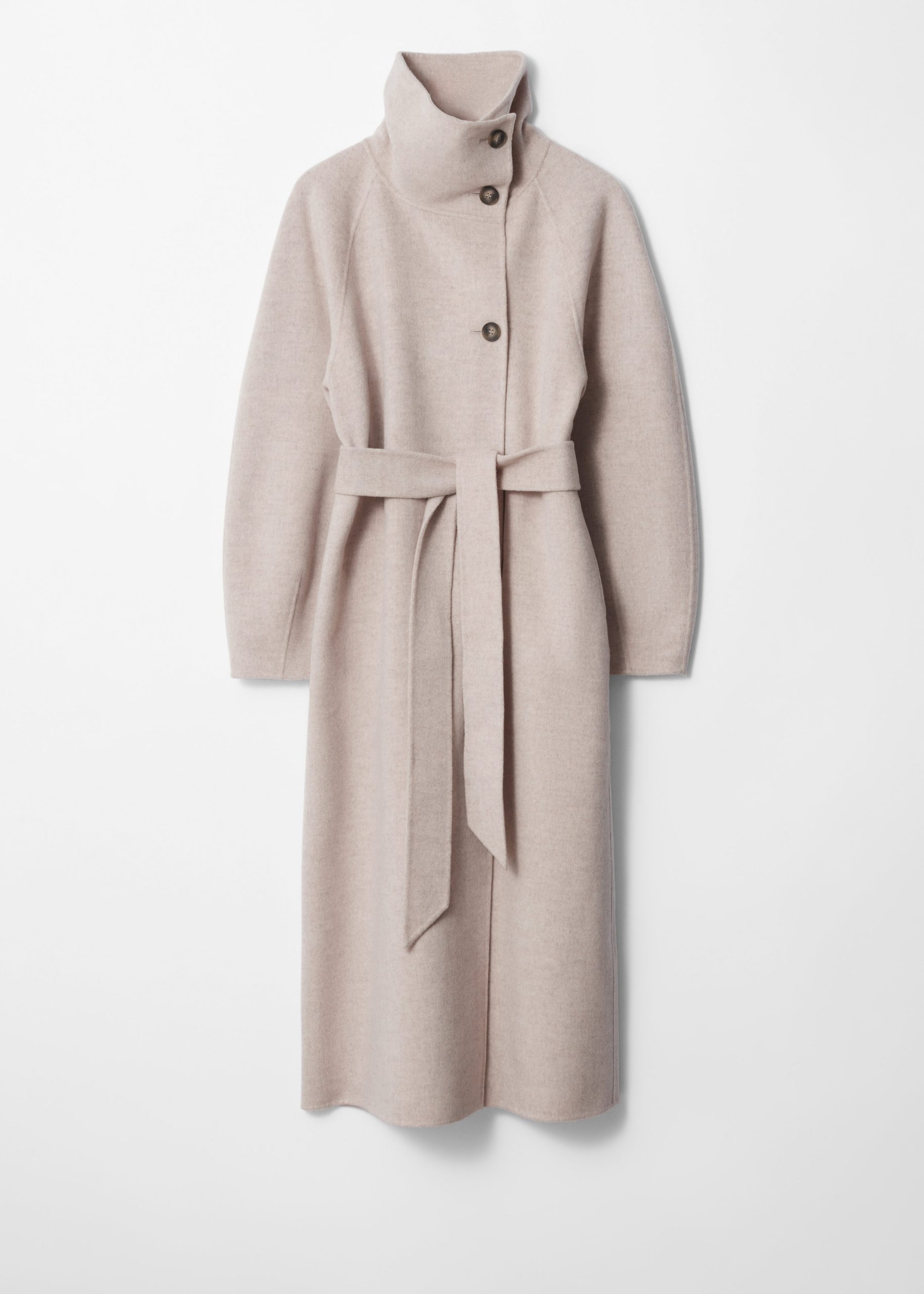 Long-sleeve coat crafted from a wool blend. Designed with a funnel collar, an overlapping button placket and a tonal belt.