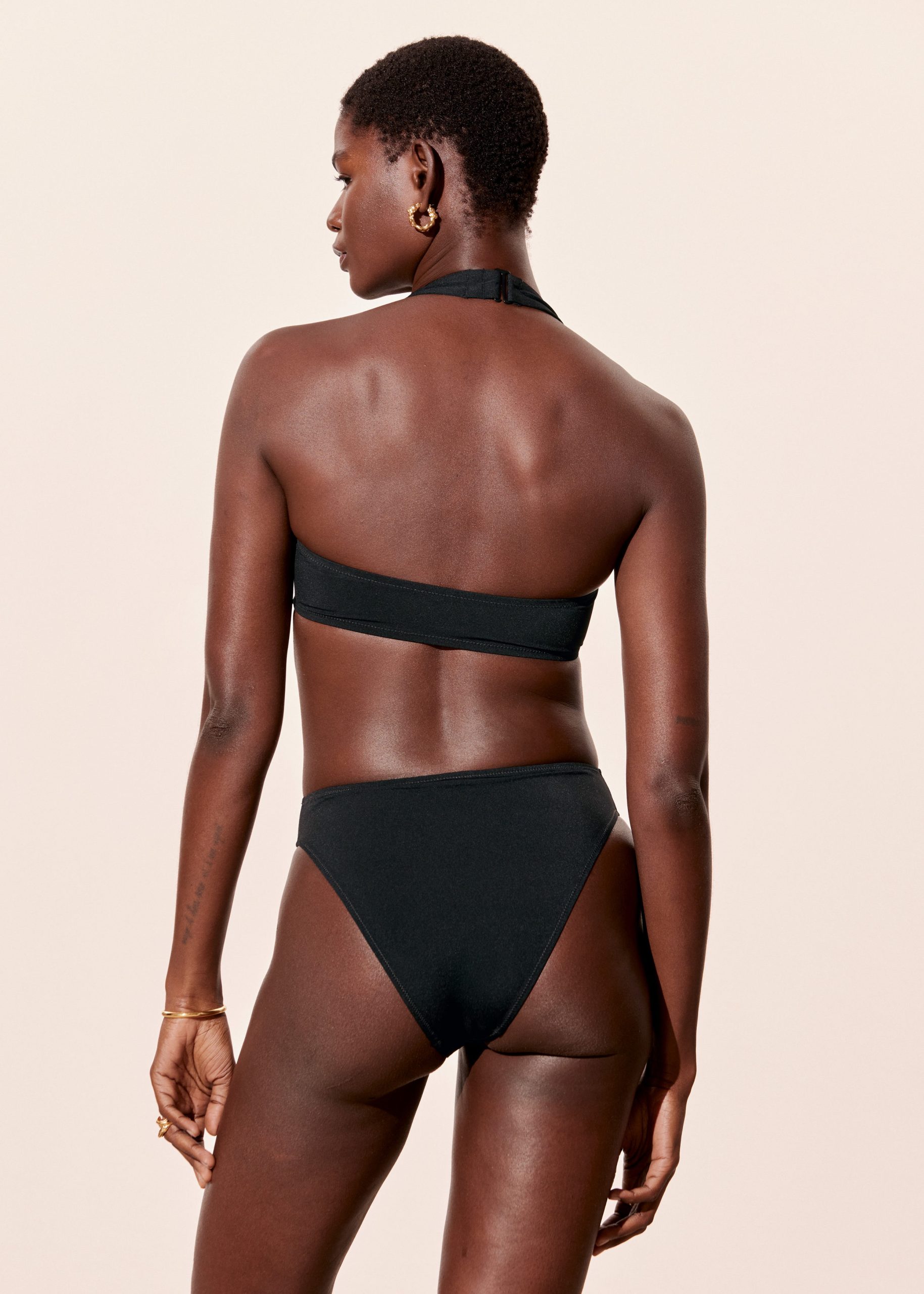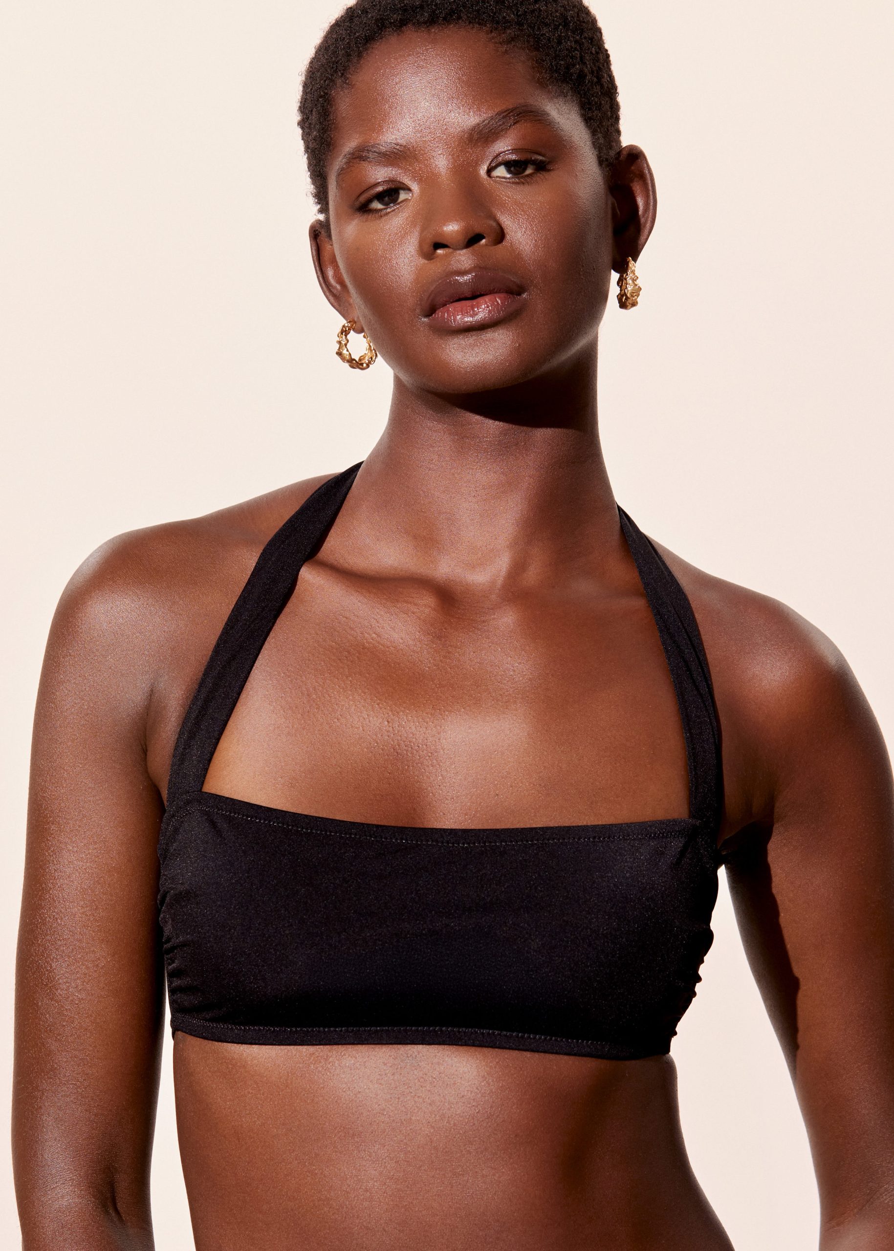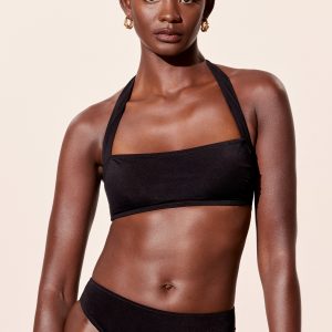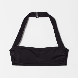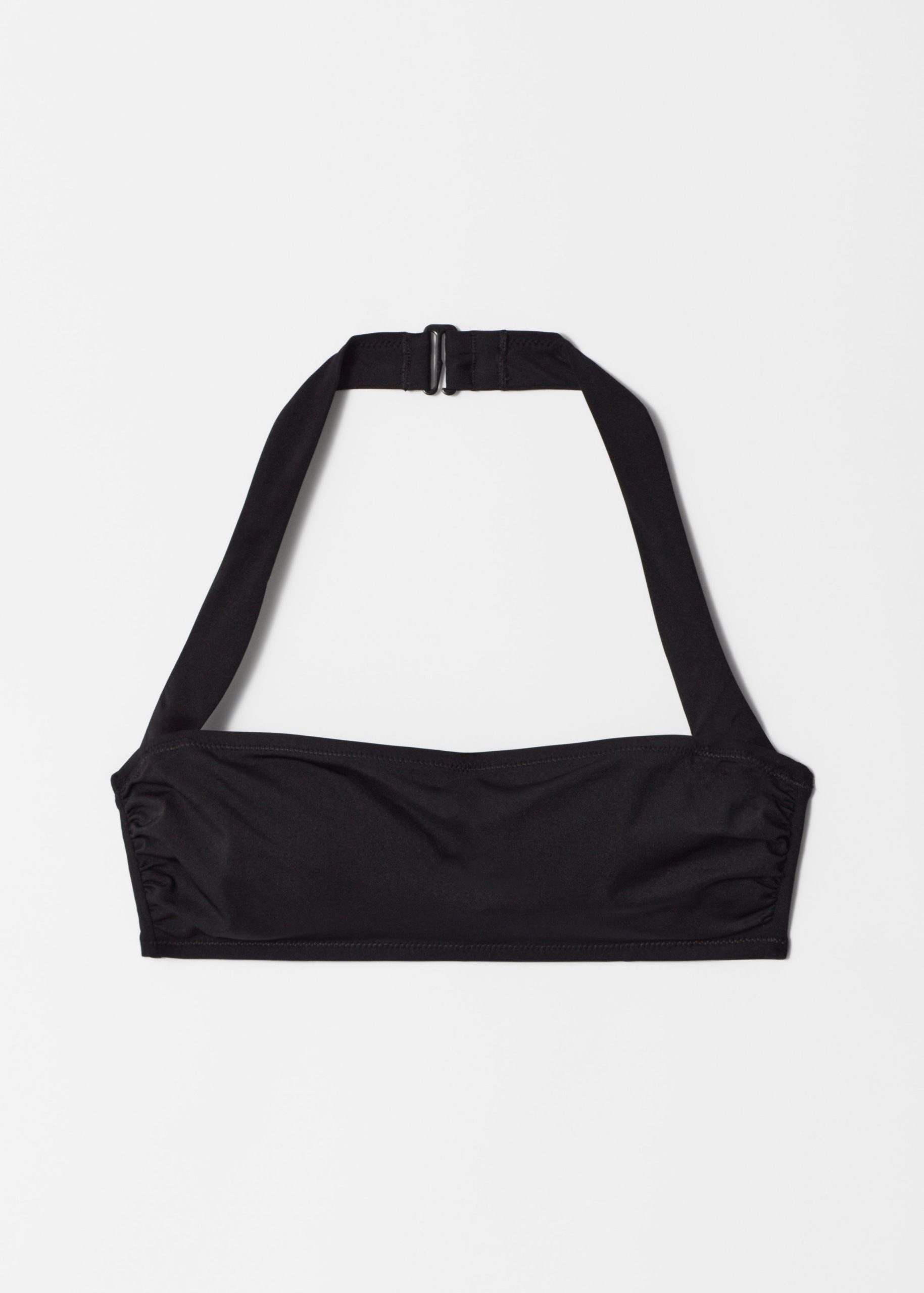 Halterneck bikini top designed with a straight neckline with subtle gathers, and wide adjustable straps. Finished with light padding for added support, and an adjustable hook at the back and neck.Â
