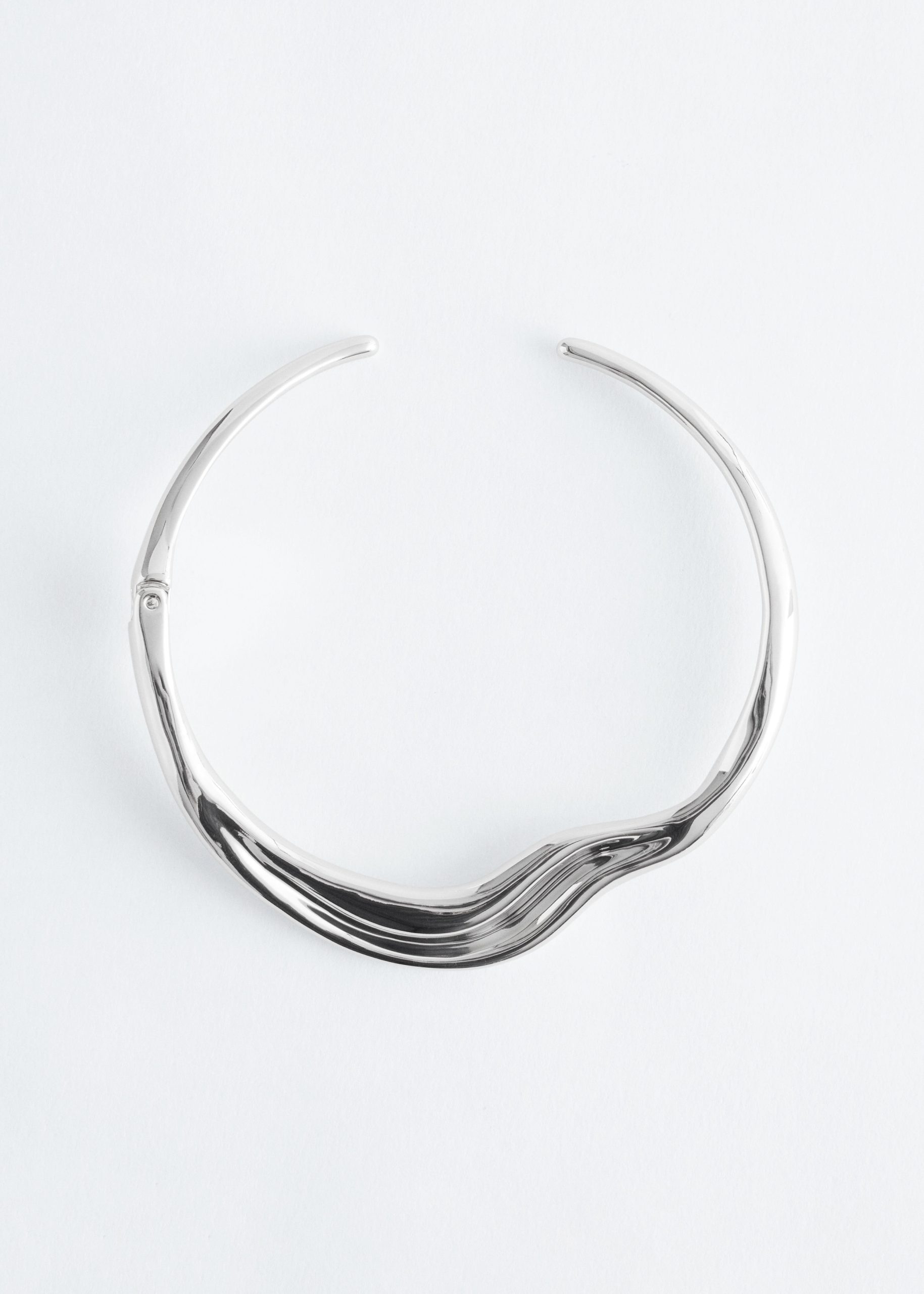 This high-shine choker necklace has an irregular form, featuring a wider, wavy shape at the front with a carved-out texture. Itβs designed with an open-ended silhouette and a hinged closure for easy on and off.