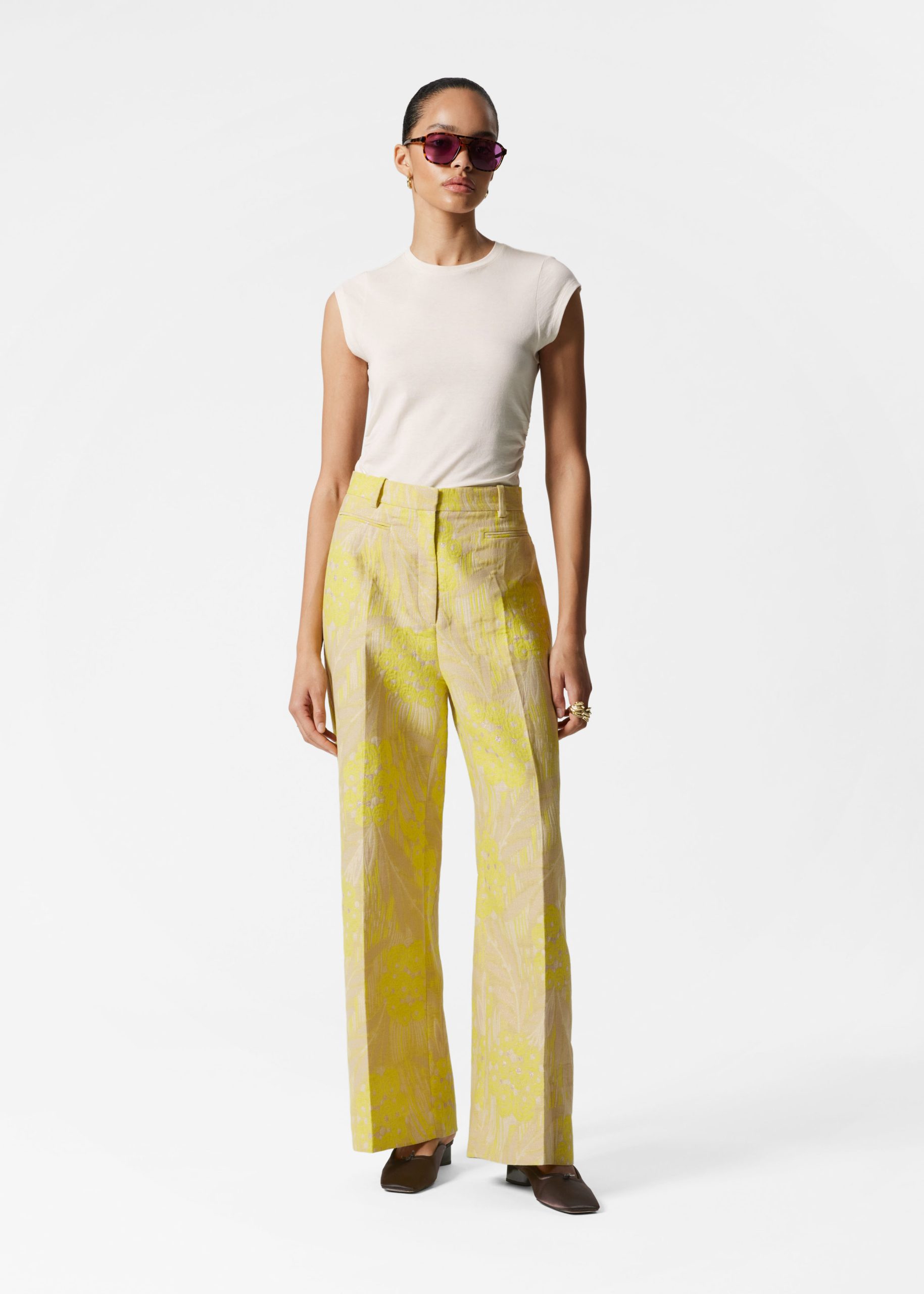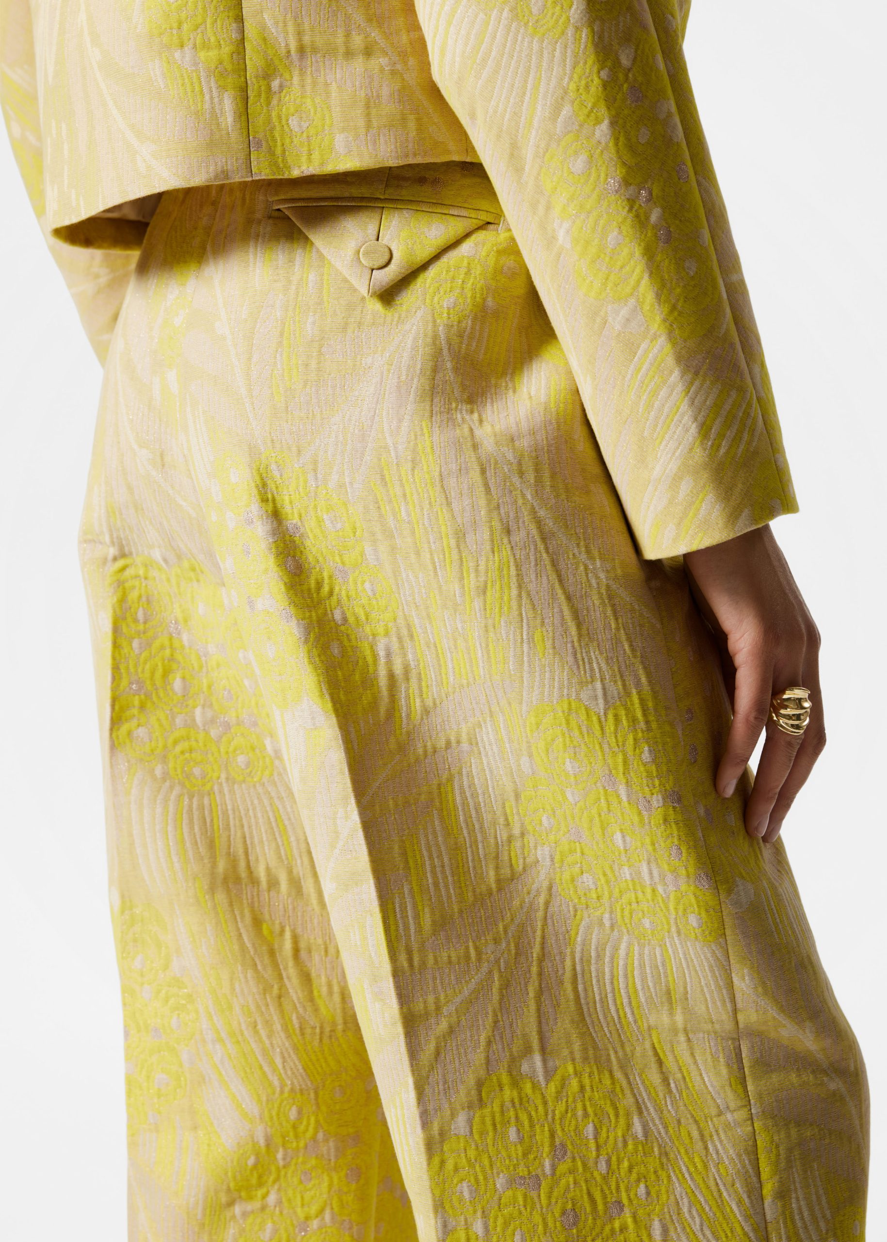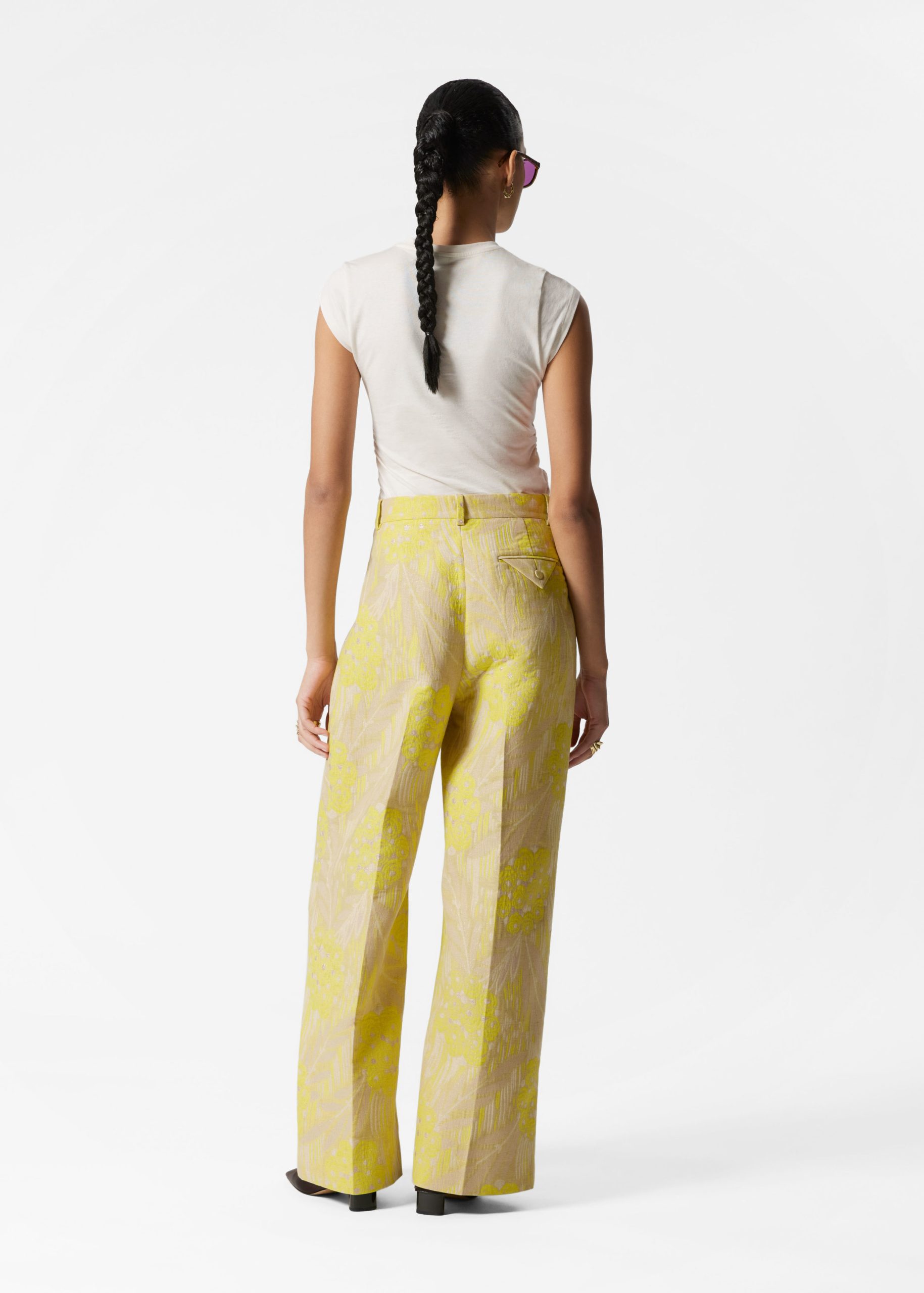 Tailored straight-leg trousers detailed with press creases and a jacquard pattern finish. Featuring duo front welt pockets, and a single welt back pocket with a triangle detail.