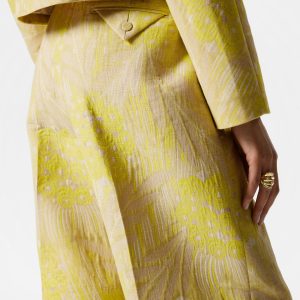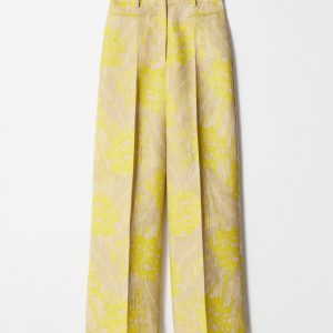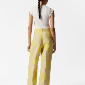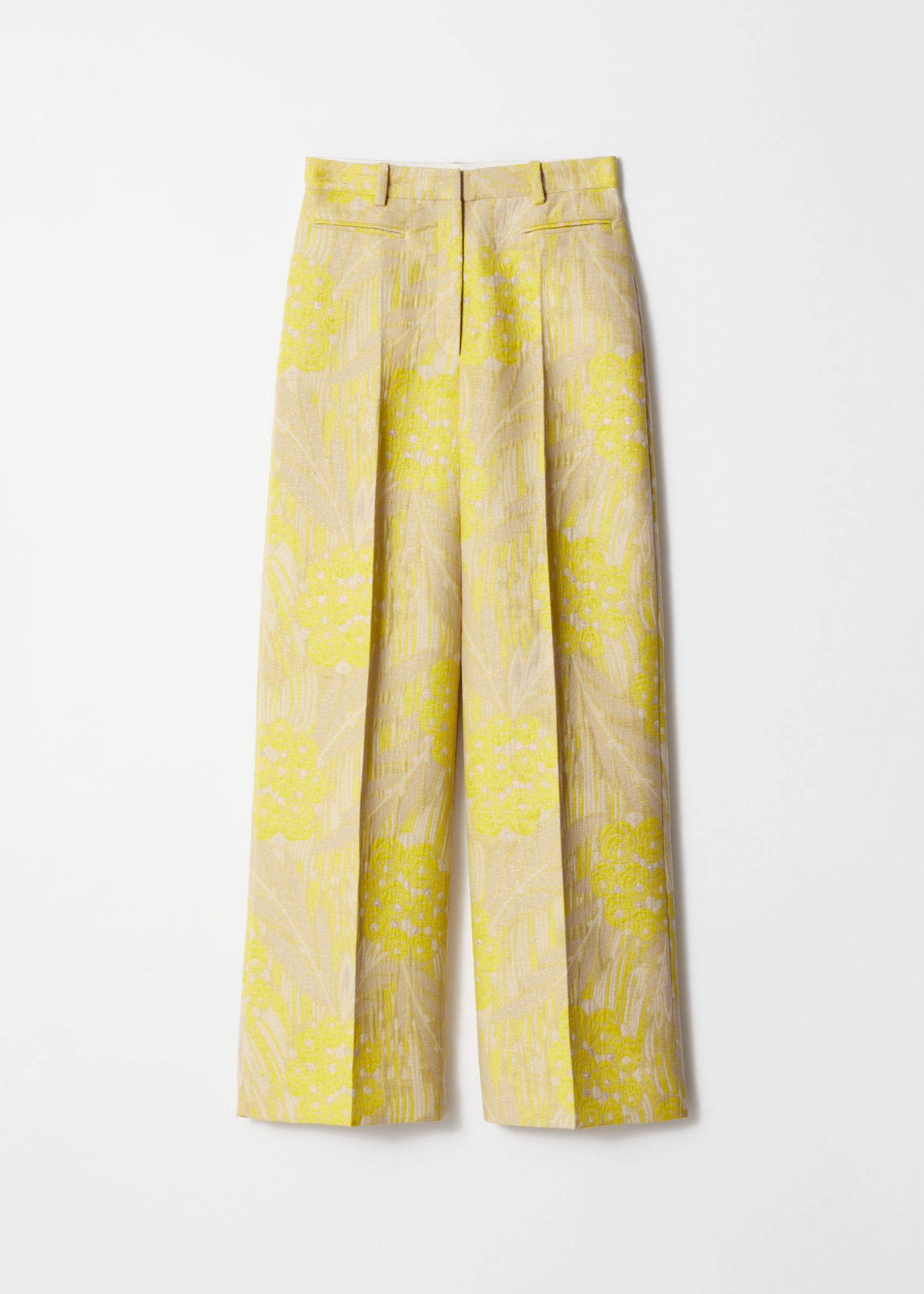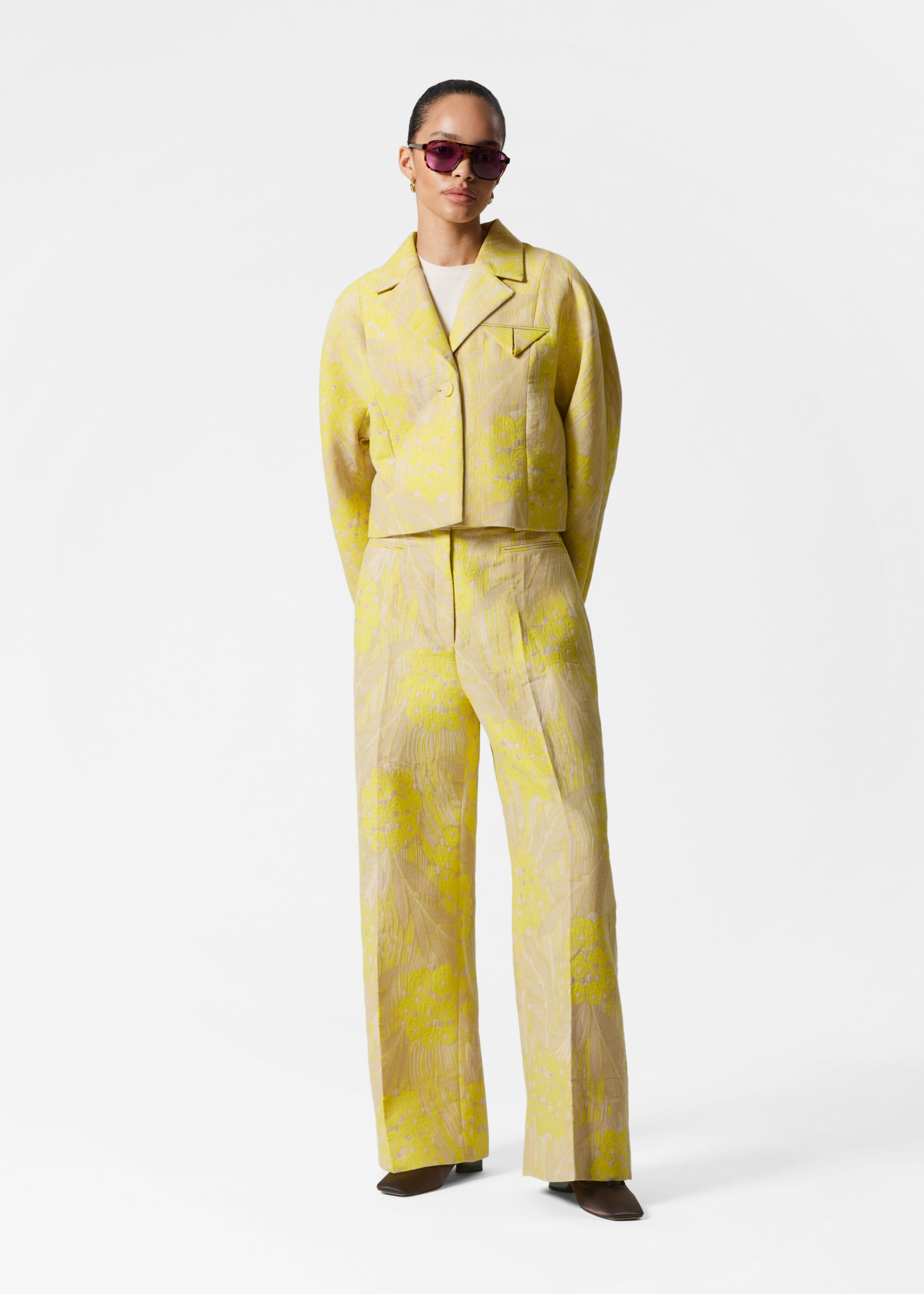 Tailored straight-leg trousers detailed with press creases and a jacquard pattern finish. Featuring duo front welt pockets, and a single welt back pocket with a triangle detail.