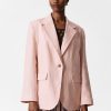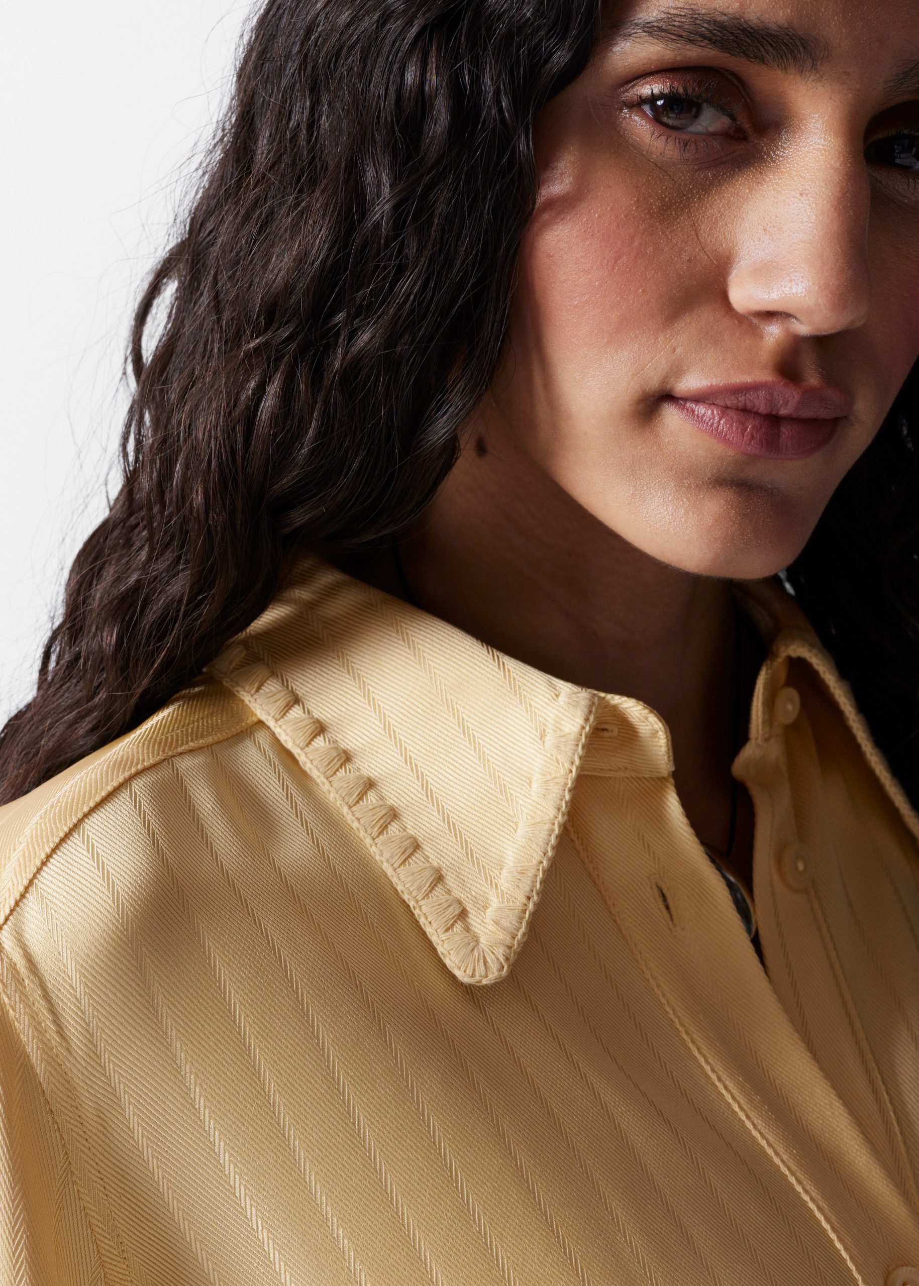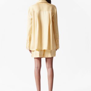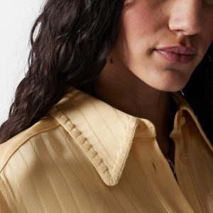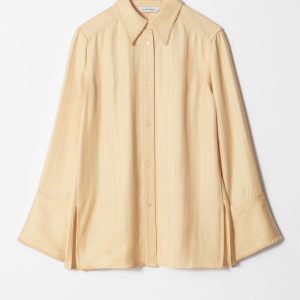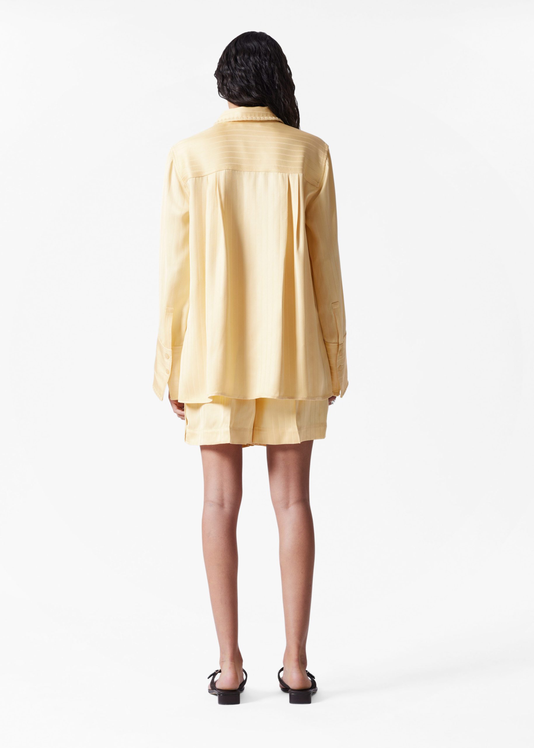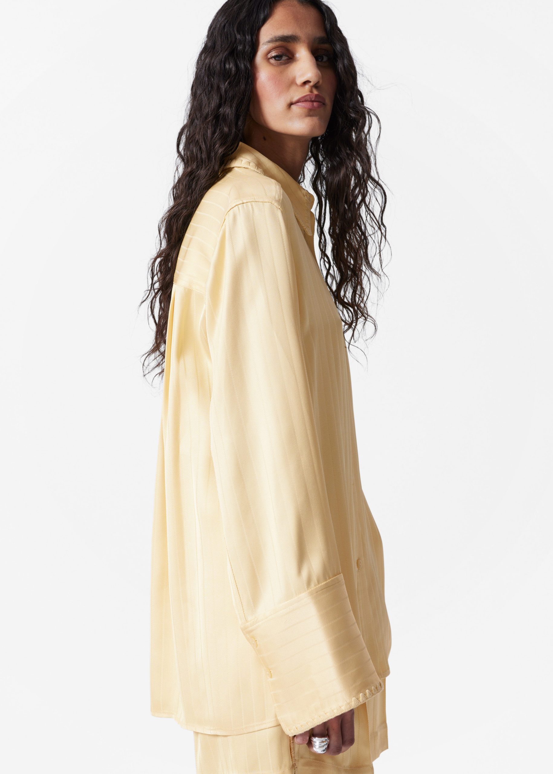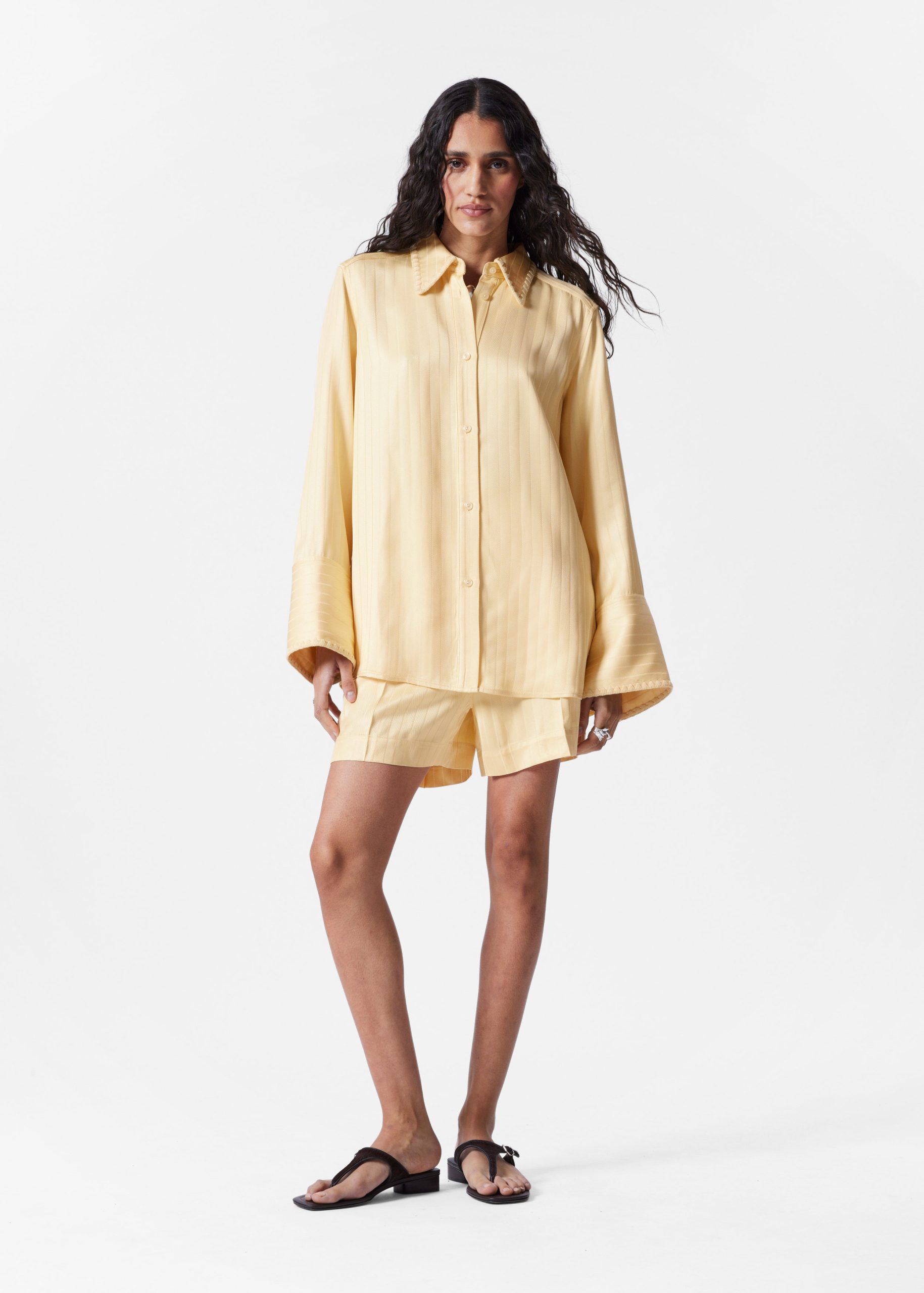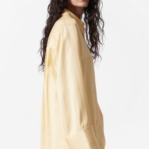 Shirt crafted from a jacquard striped fabric with a silky finish. Designed in a flowy silhouette featuring a classic collar, whipstitched seams, wide buttoned cuffs, and side slits at the hem. Pair with the matching jacquard shorts for an effortless co-ord look.