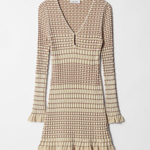 Crafted from a structured knit, this long-sleeve mini dress features a tactile grid texture in contrasting tones. Designed in a slim silhouette, it’s detailed with a v-neckline, a subtle keyhole button closure, and softly fluted hems accented with delicate frills. Style it with strappy sandals on warm-weather days.