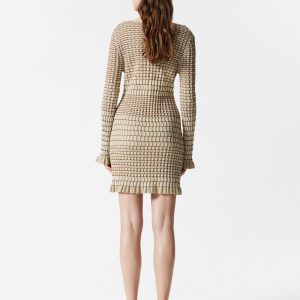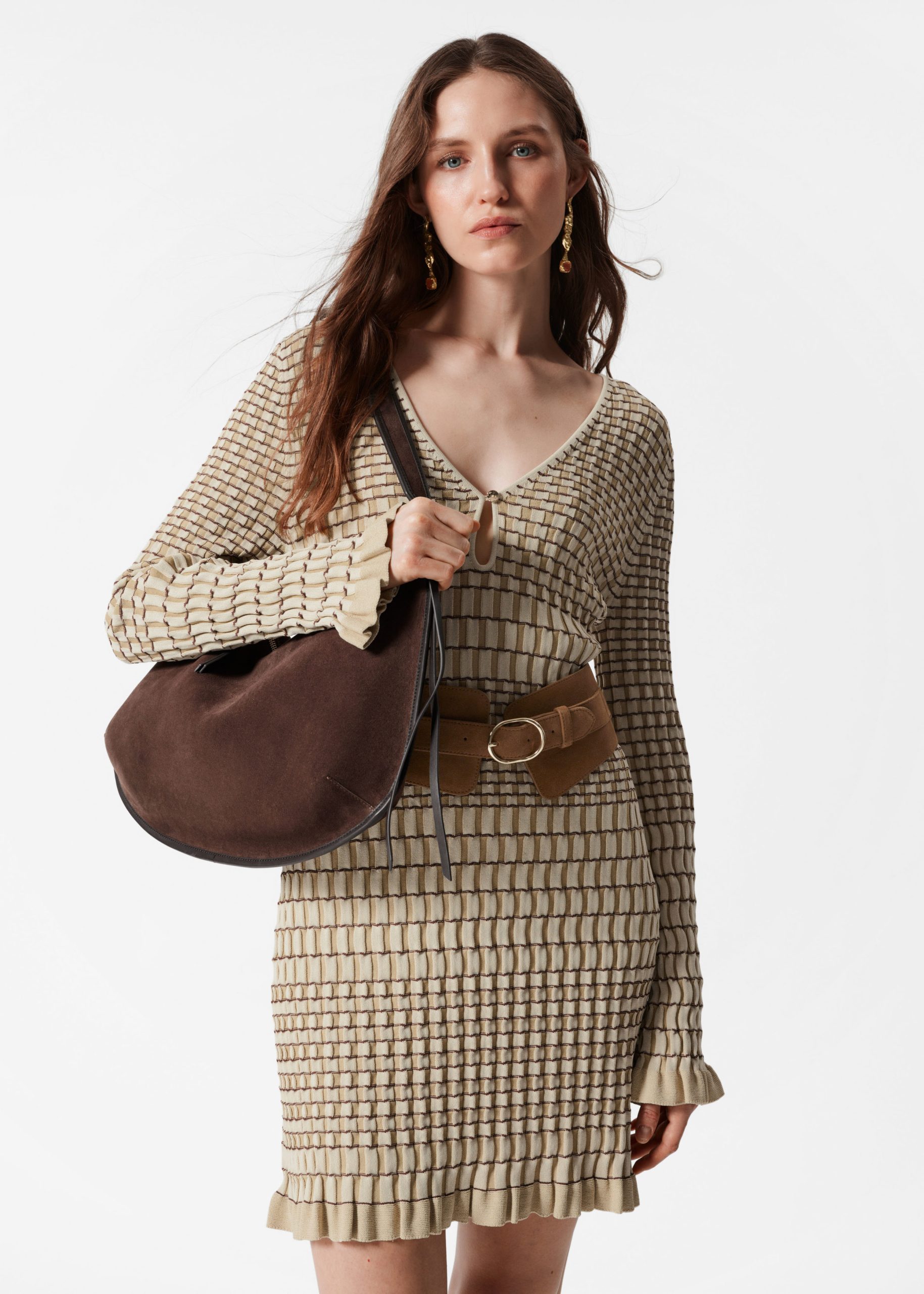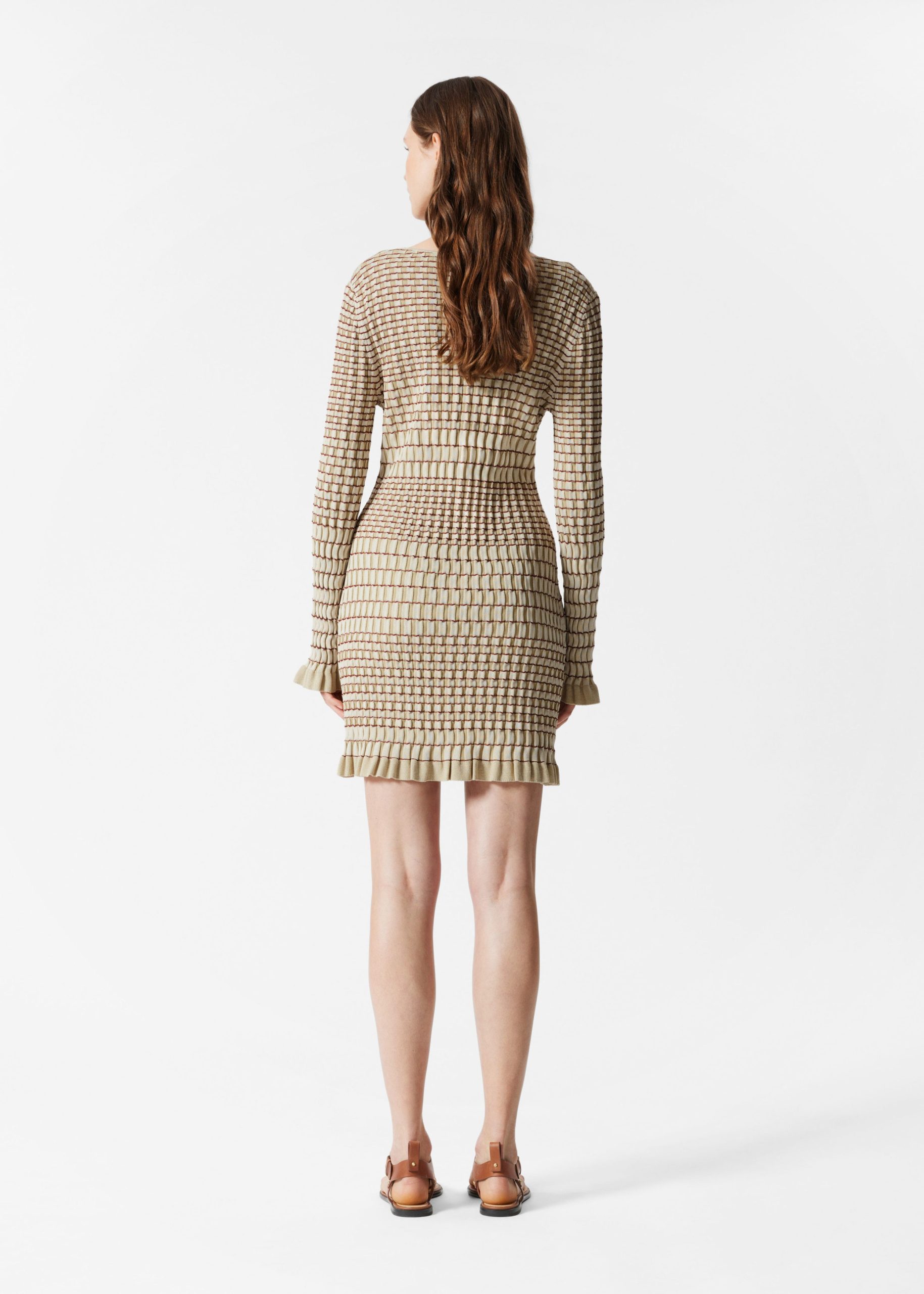 Crafted from a structured knit, this long-sleeve mini dress features a tactile grid texture in contrasting tones. Designed in a slim silhouette, it’s detailed with a v-neckline, a subtle keyhole button closure, and softly fluted hems accented with delicate frills. Style it with strappy sandals on warm-weather days.