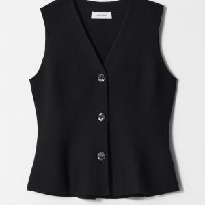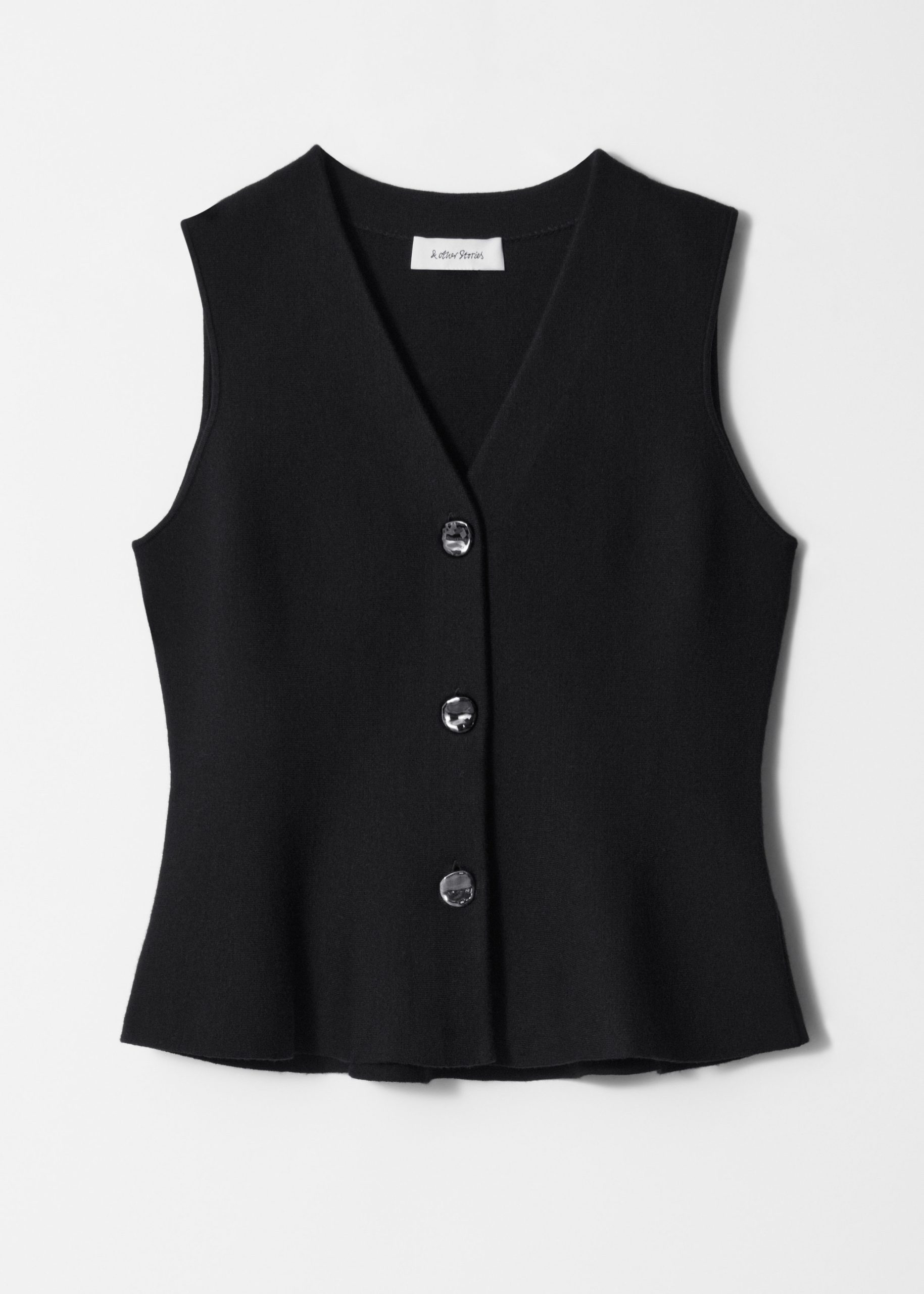 This knitted vest top is cut in a fitted peplum silhouette with a classic v-neck and a subtle flare at the hem. The minimalist design is elevated by silver-plated buttons down the front. Pair it with a tonal skirt for a sleek co-ord look, or dress it down with jeans.
