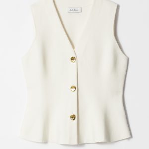 This knitted vest top is cut in a fitted peplum silhouette with a classic v-neck and a subtle flare at the hem. The minimalist design is elevated by gold-plated buttons down the front. Pair it with a tonal skirt for a sleek co-ord look, or dress it down with jeans.