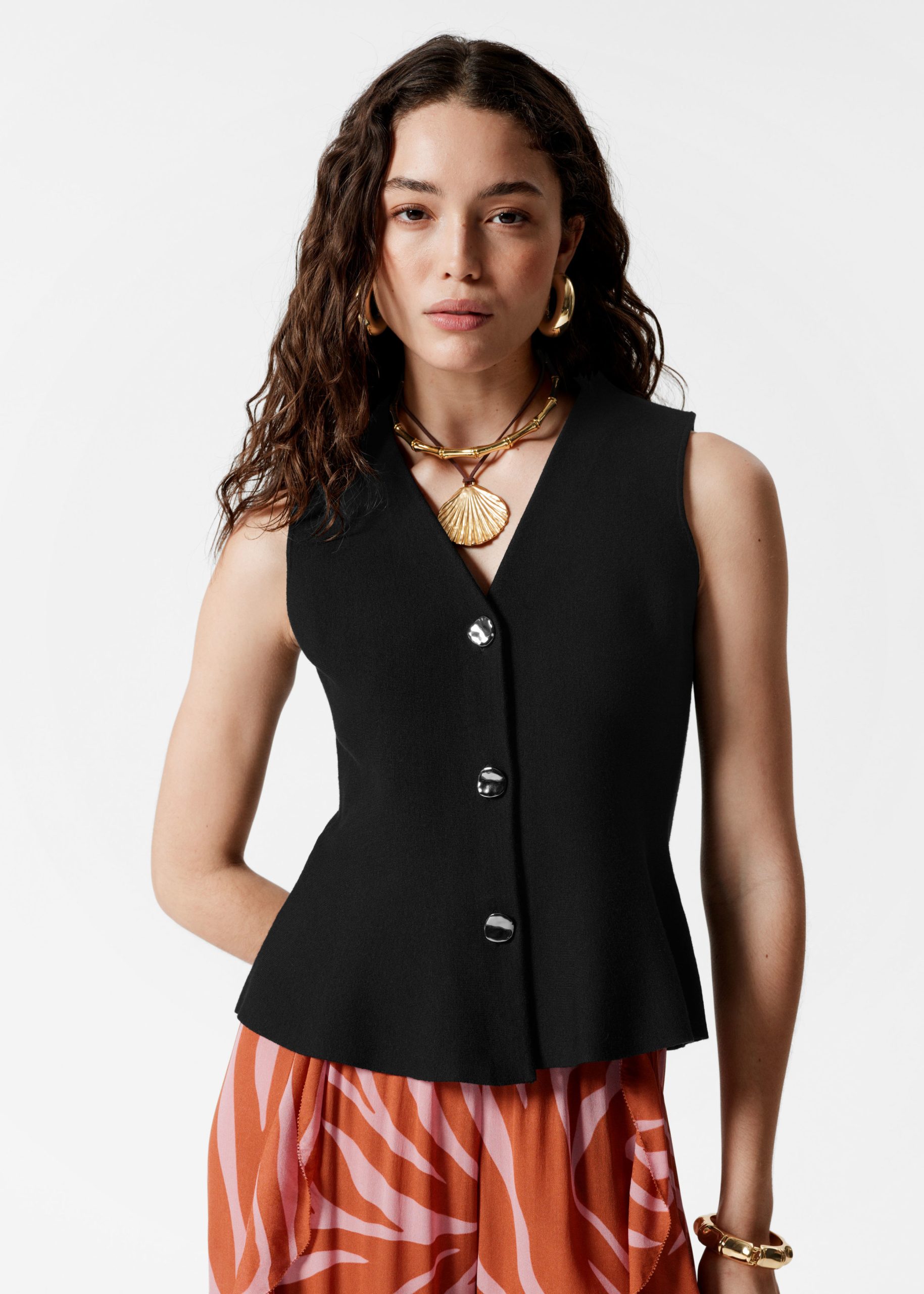 This knitted vest top is cut in a fitted peplum silhouette with a classic v-neck and a subtle flare at the hem. The minimalist design is elevated by silver-plated buttons down the front. Pair it with a tonal skirt for a sleek co-ord look, or dress it down with jeans.