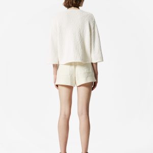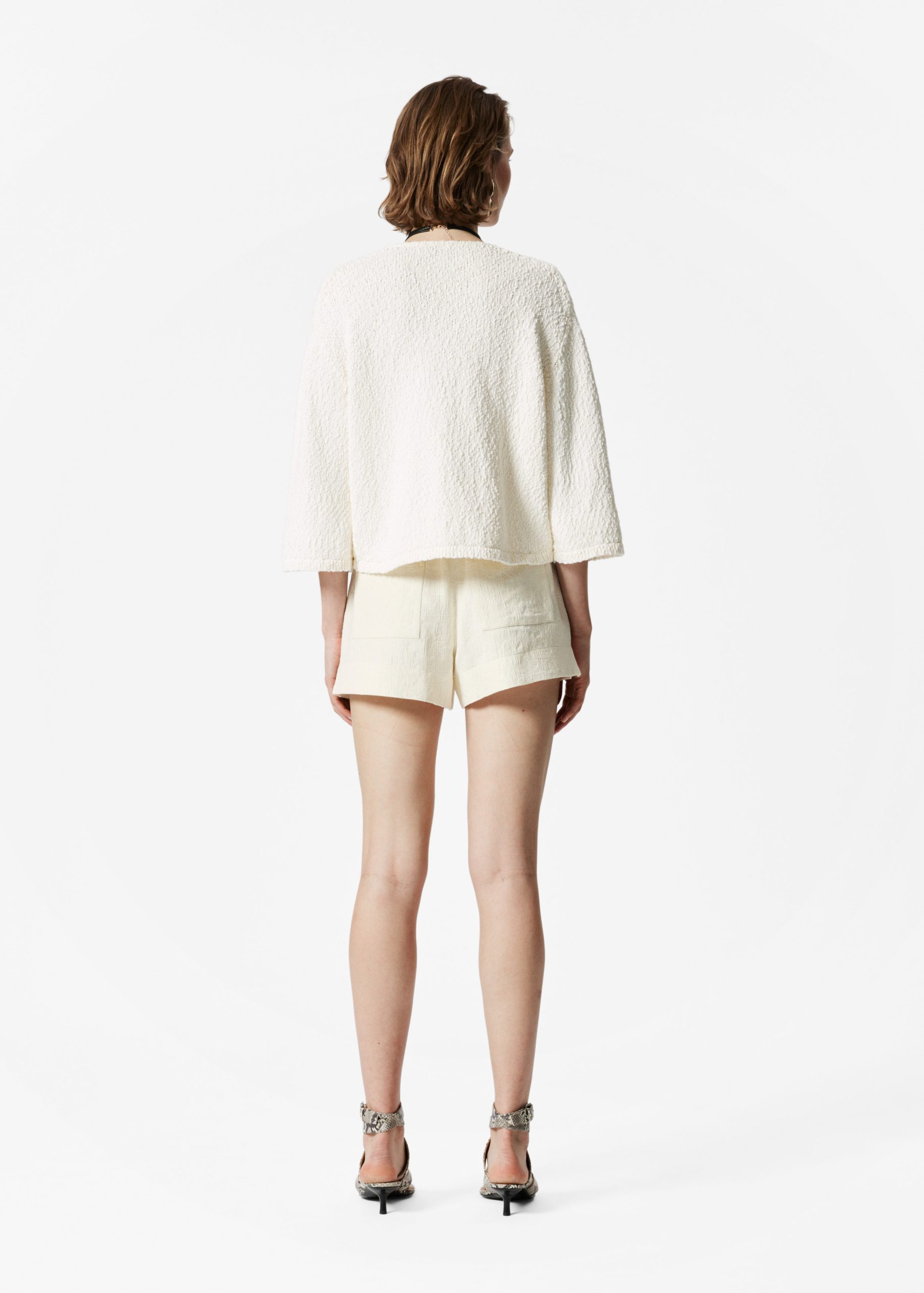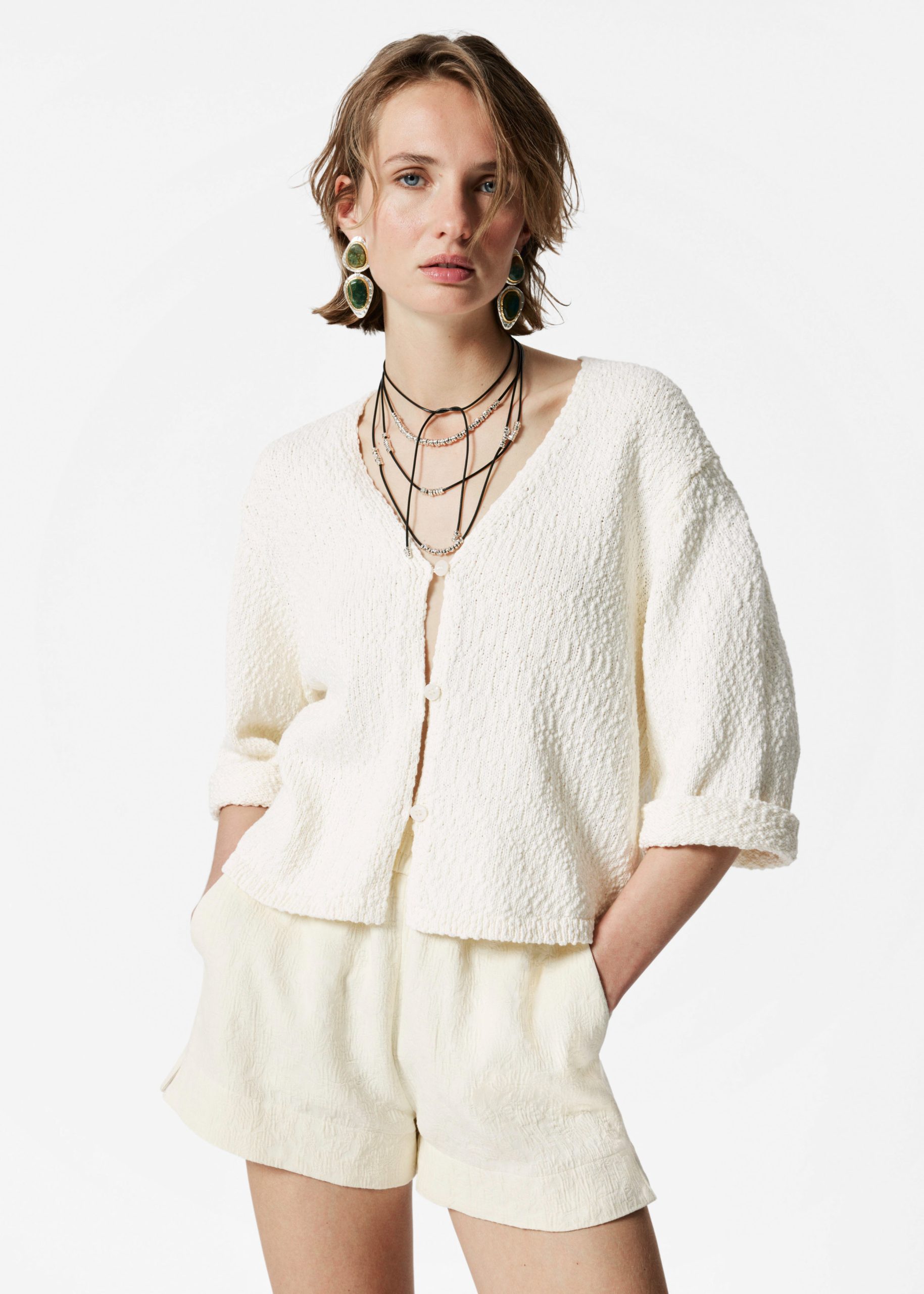 This cardigan brings elevated casual wear to the forefront. Knitted from pure cotton, it lends a lightweight and textured finish. The relaxed, cropped silhouette is complemented by three-quarter sleeves and a classic v-neckline, fastened with three button closures.Â