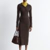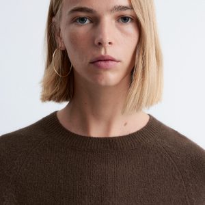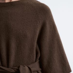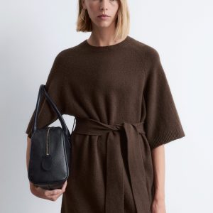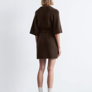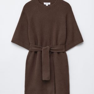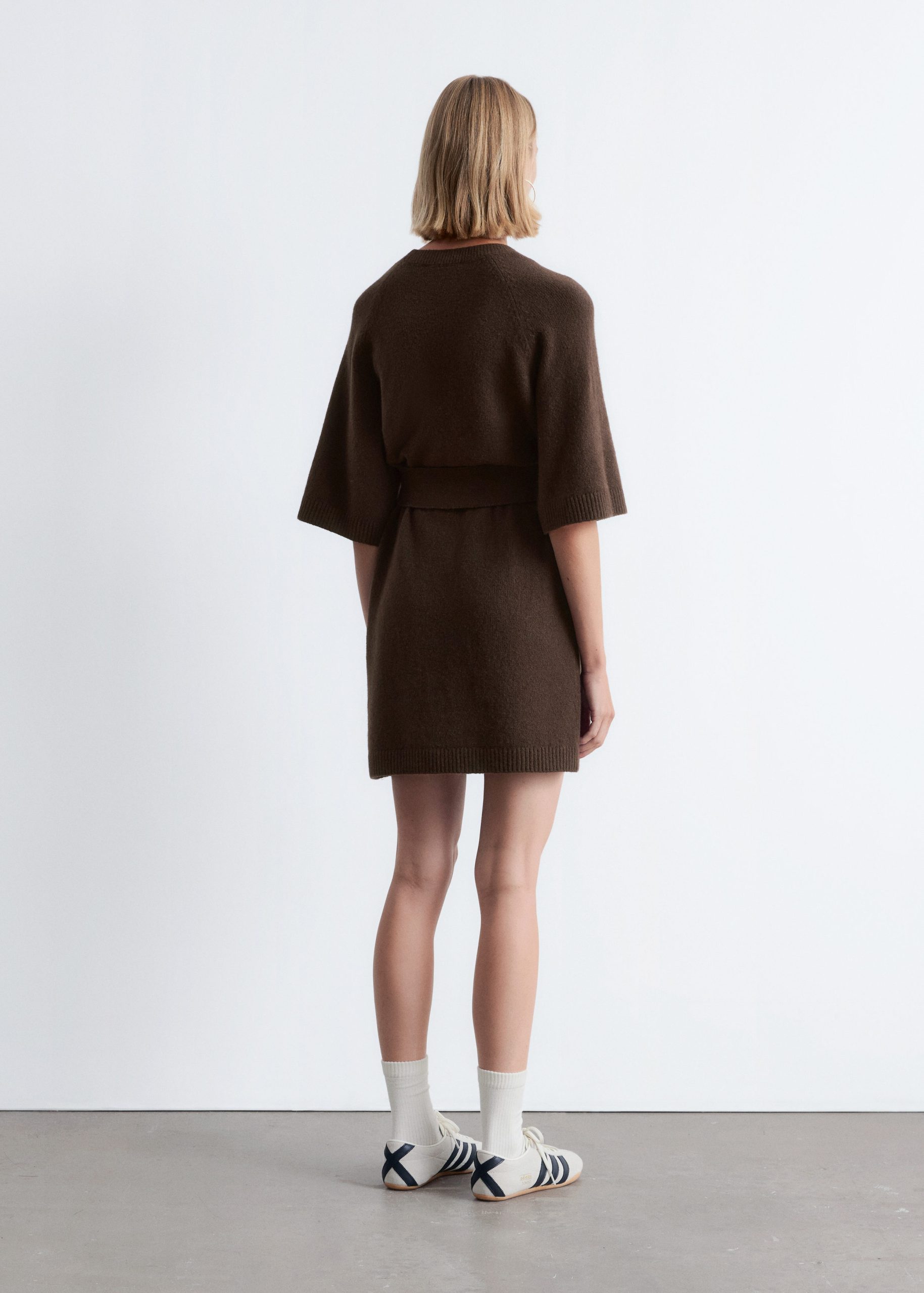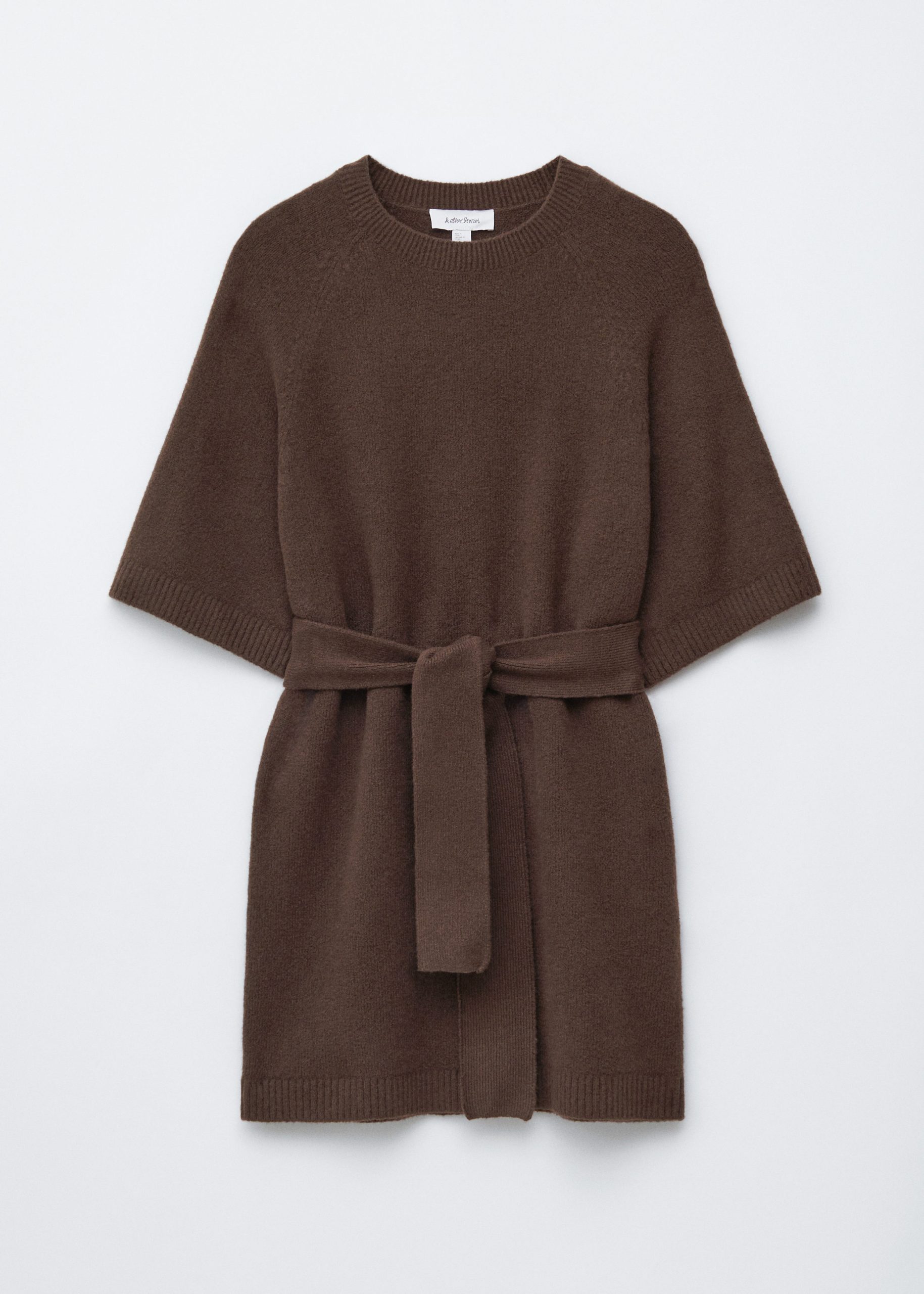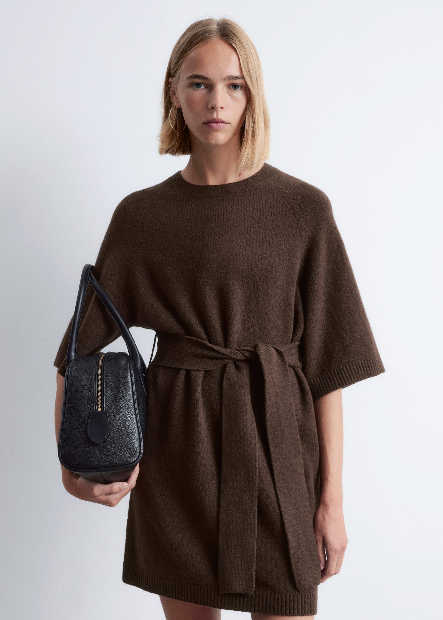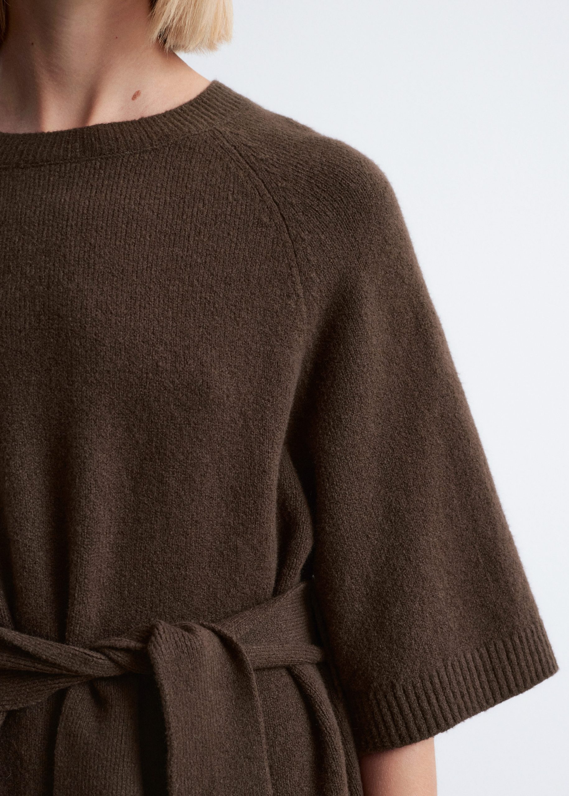 Knitted from a soft cotton-wool blend, this t-shirt dress is cut in a straight silhouette and features short raglan sleeves, ribbed trims, and a matching self-tie belt to define the waist. Style it with knee-high boots.