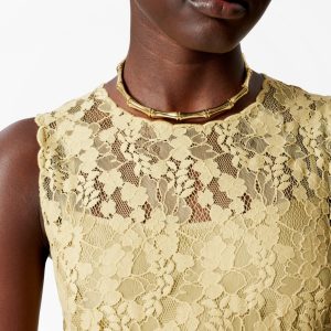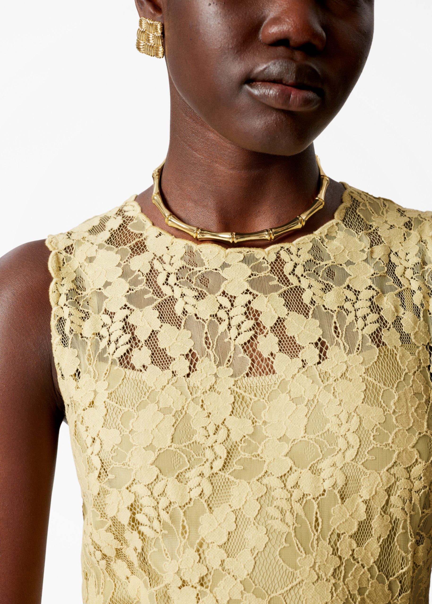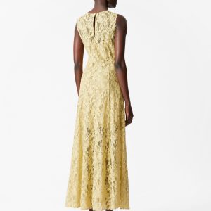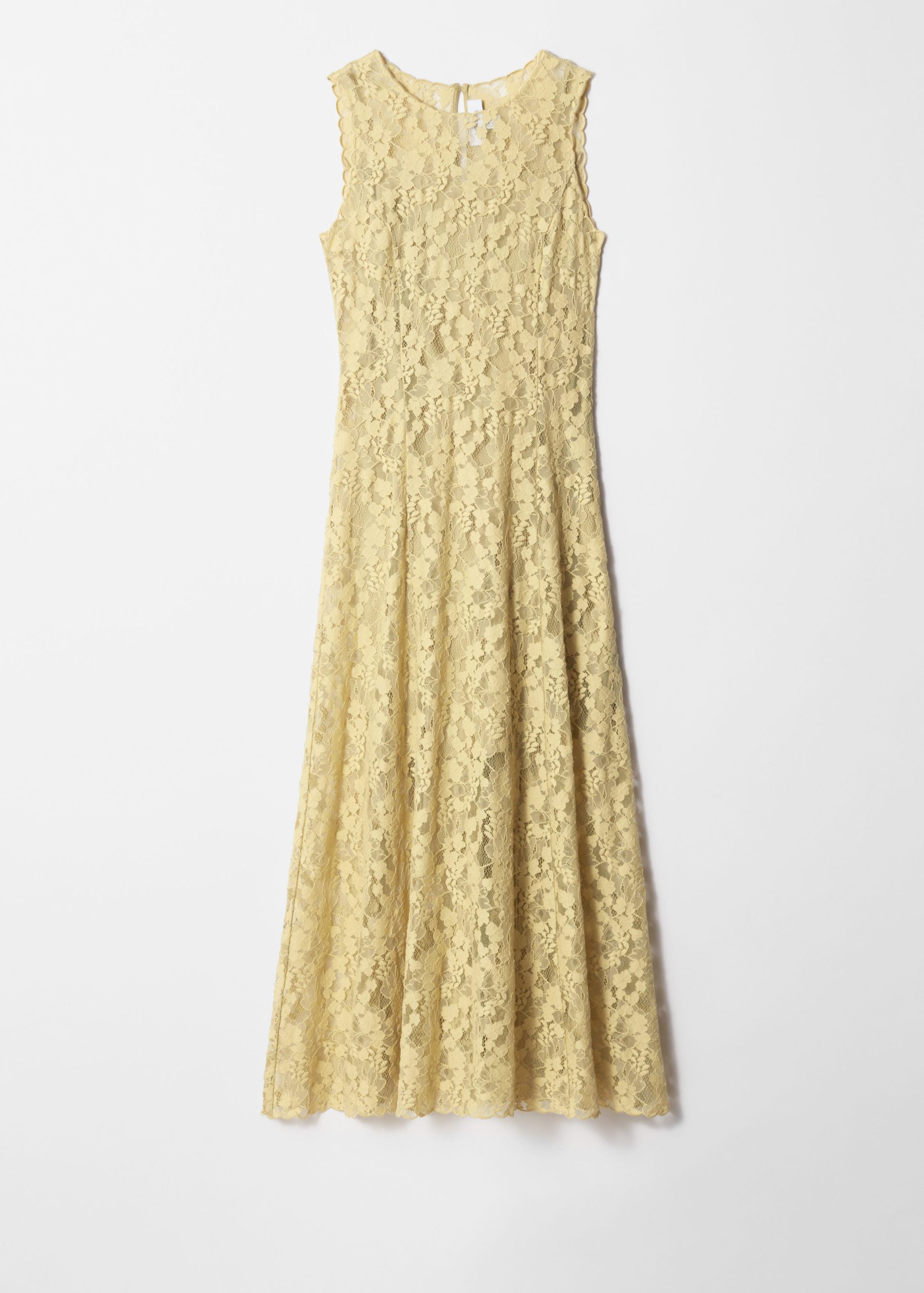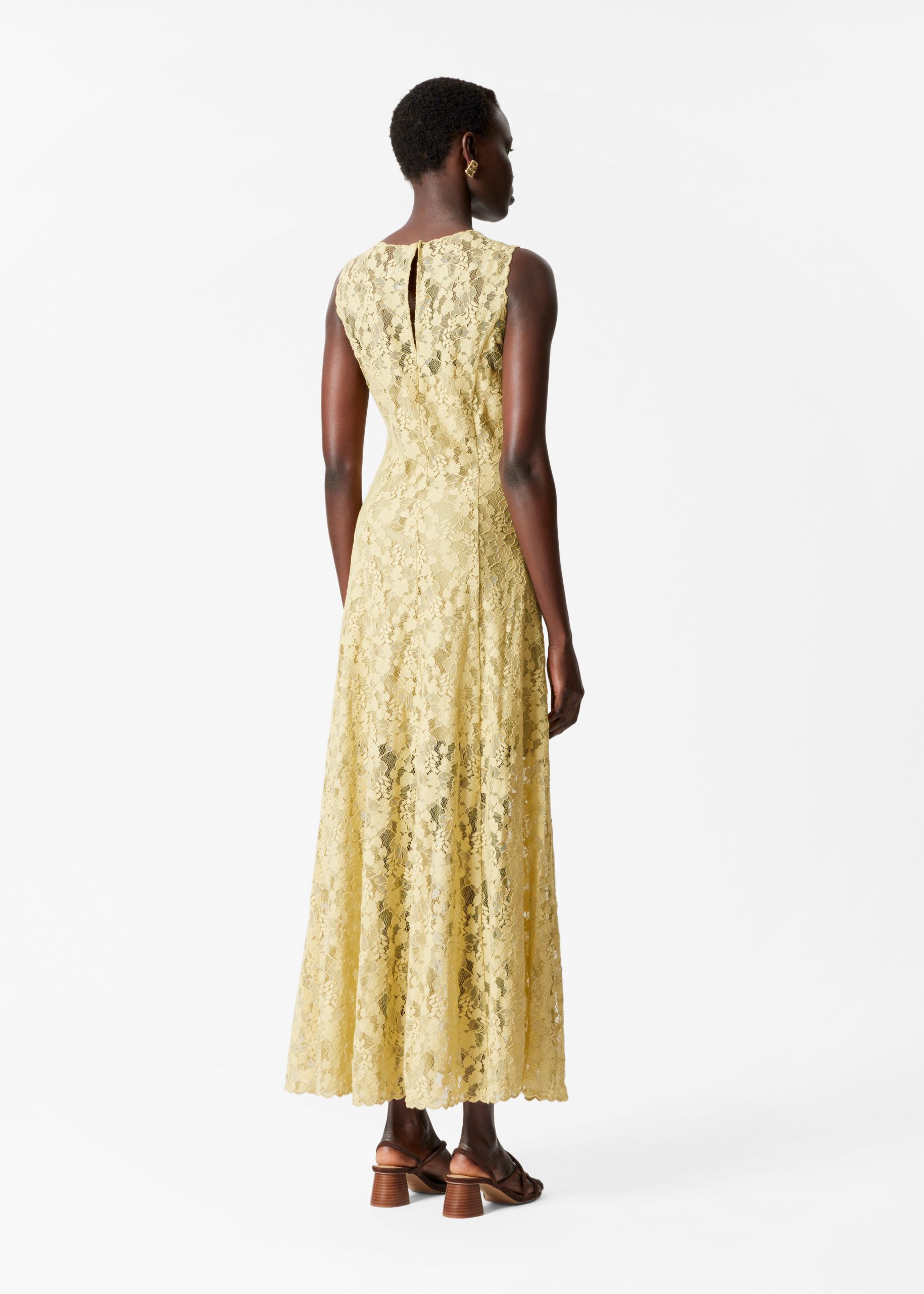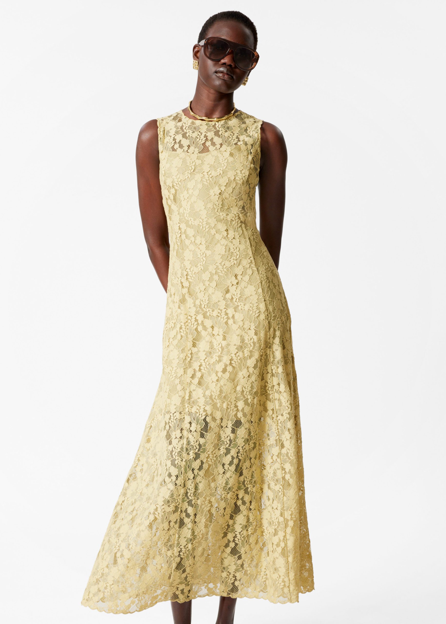 Designed for summer soirées and festive occasions, this sleeveless maxi dress is crafted from a delicate lace cotton-blend. It’s cut in a long, A-line silhouette, accented by scalloped embroidered trims, and features a satin slip dress underneath for added coverage. Finished with a keyhole button closure at the back.