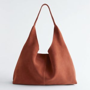 Tote bag crafted from smooth suede with a matte finish and a decorative seam in the middle. This style is detailed with magnetic closure and an inner pocket.