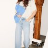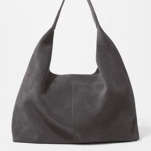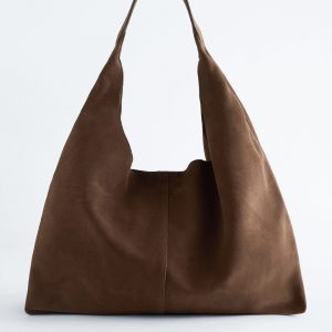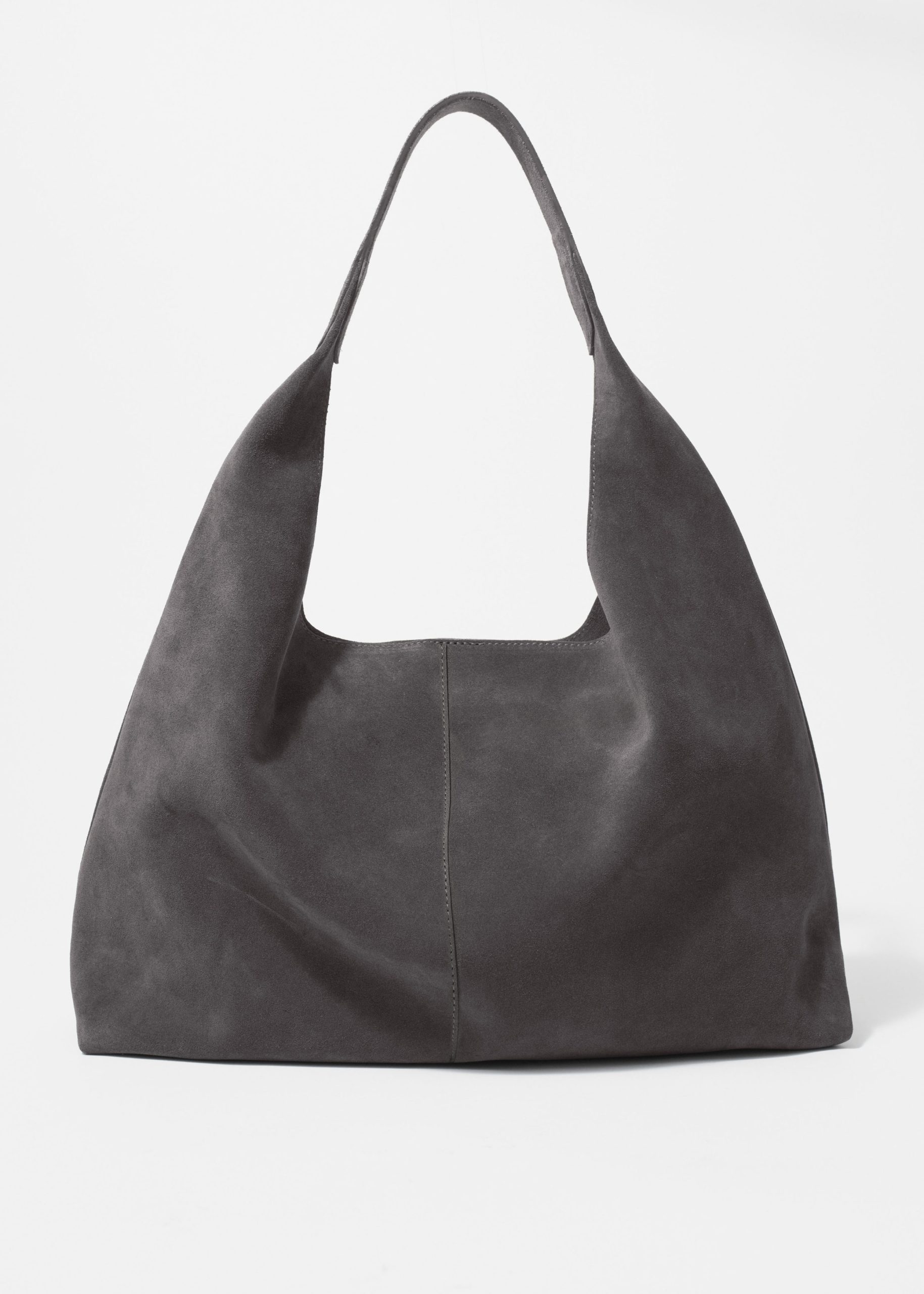Tote bag crafted from smooth suede with a matte finish and a decorative seam in the middle. This style is detailed with magnetic closure and an inner pocket.