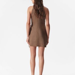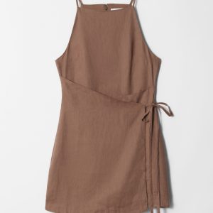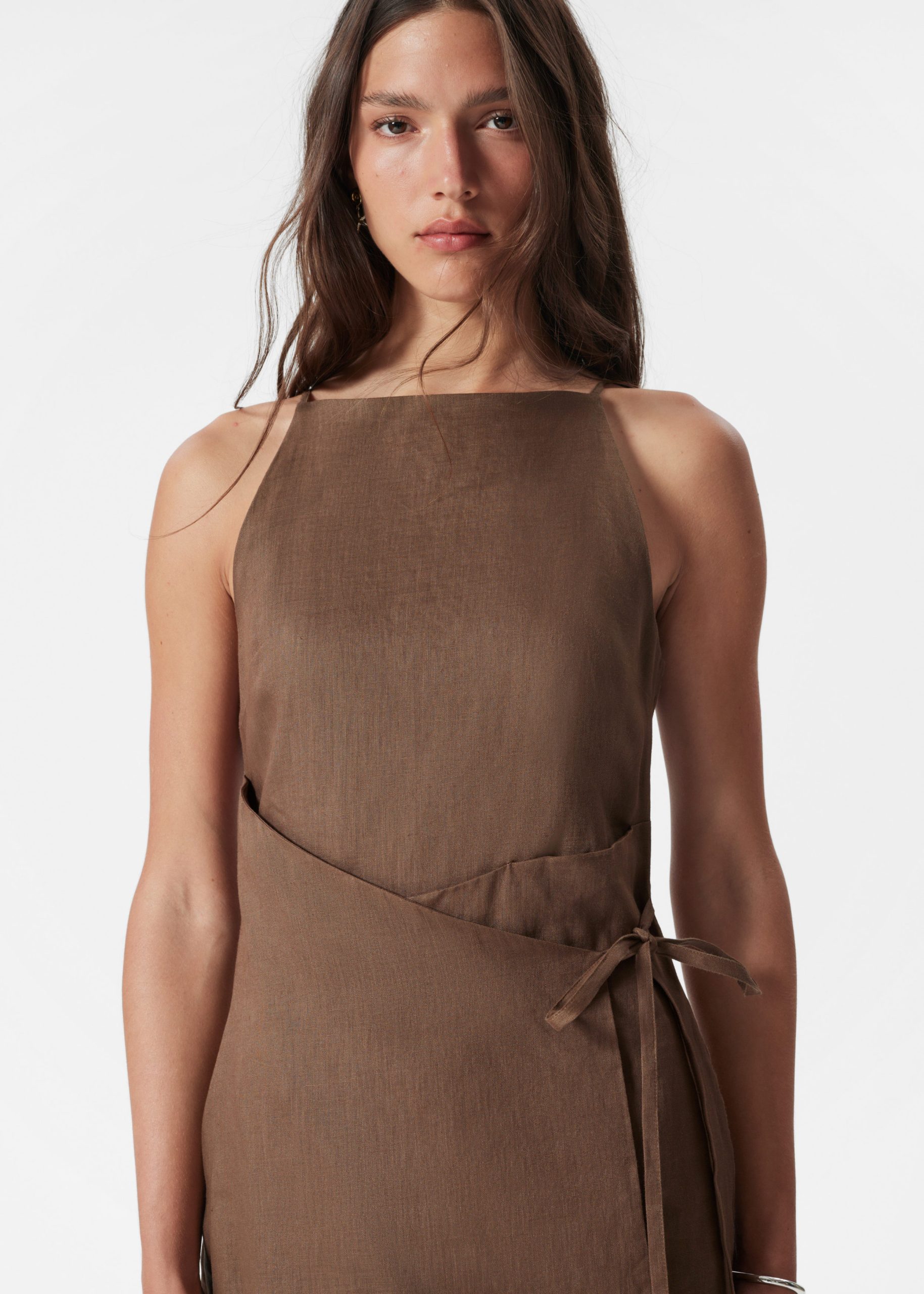 Designed for balmy summer days, this mini dress is crafted from a lightweight, breathable linen fabric. Cut in a fitted silhouette, it features a high neck, thin shoulder straps, and a wrapover design secured by slender tie-bands at the waist. Style it with strappy sandals and a straw beach bag.
