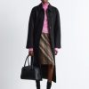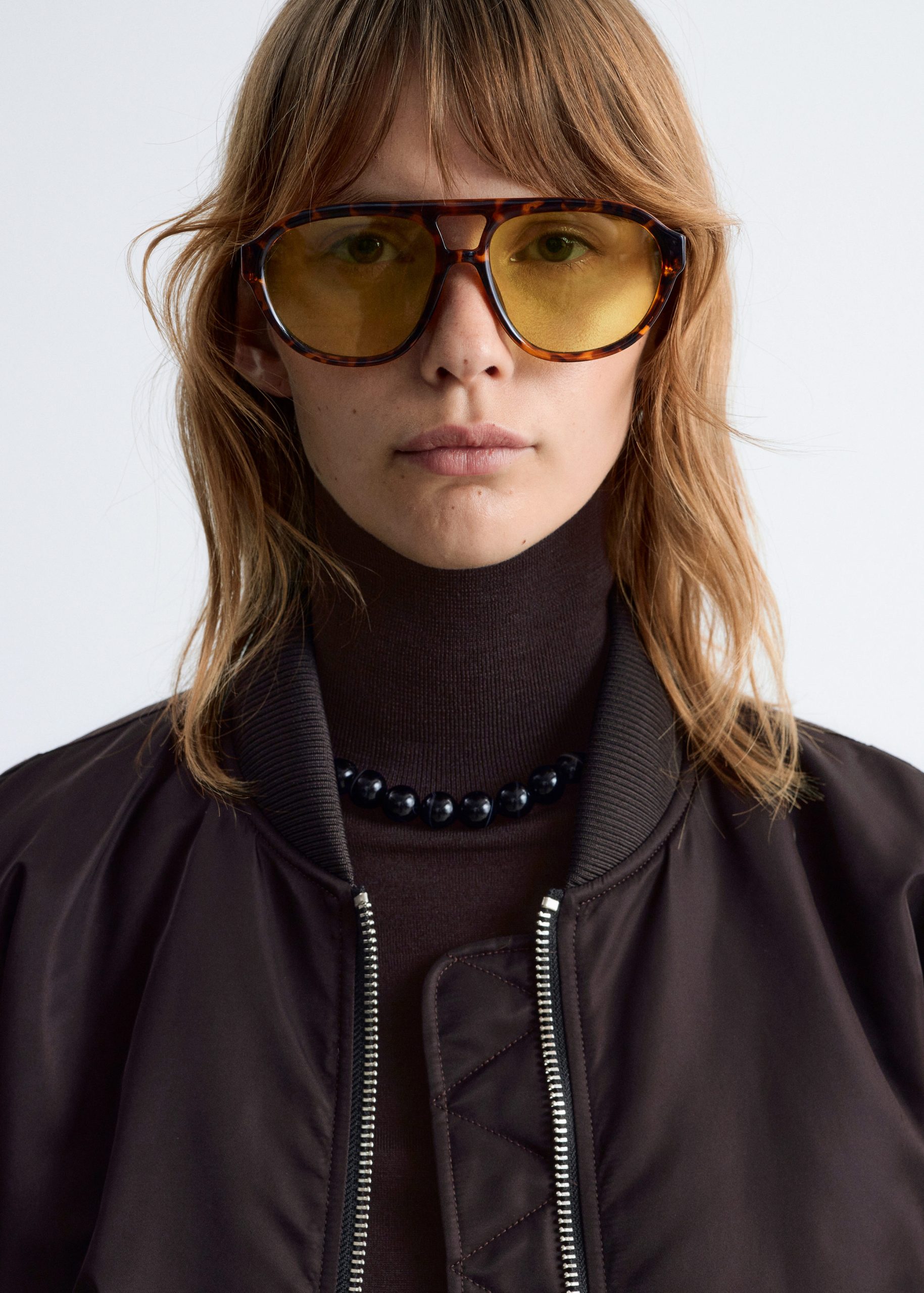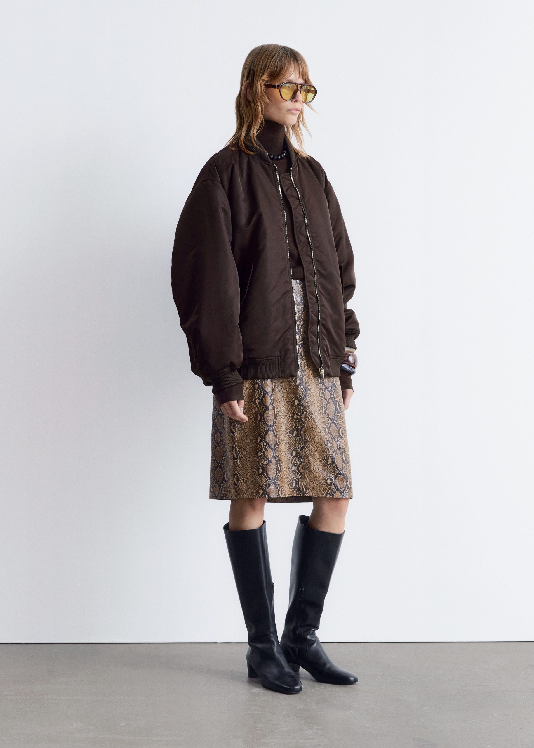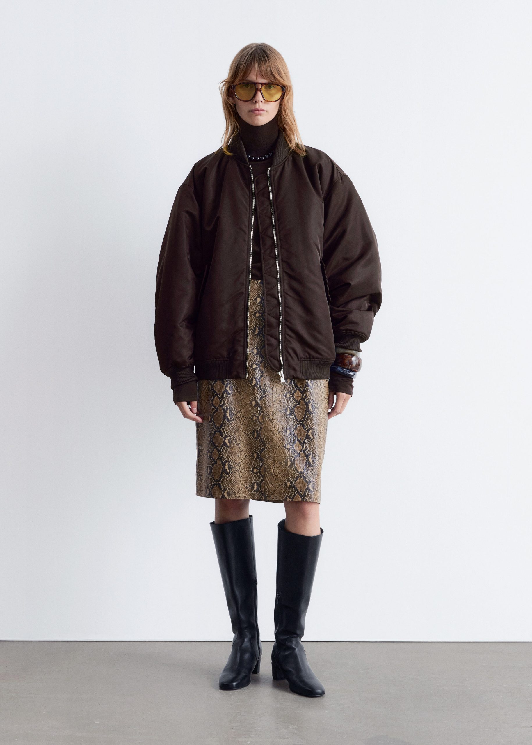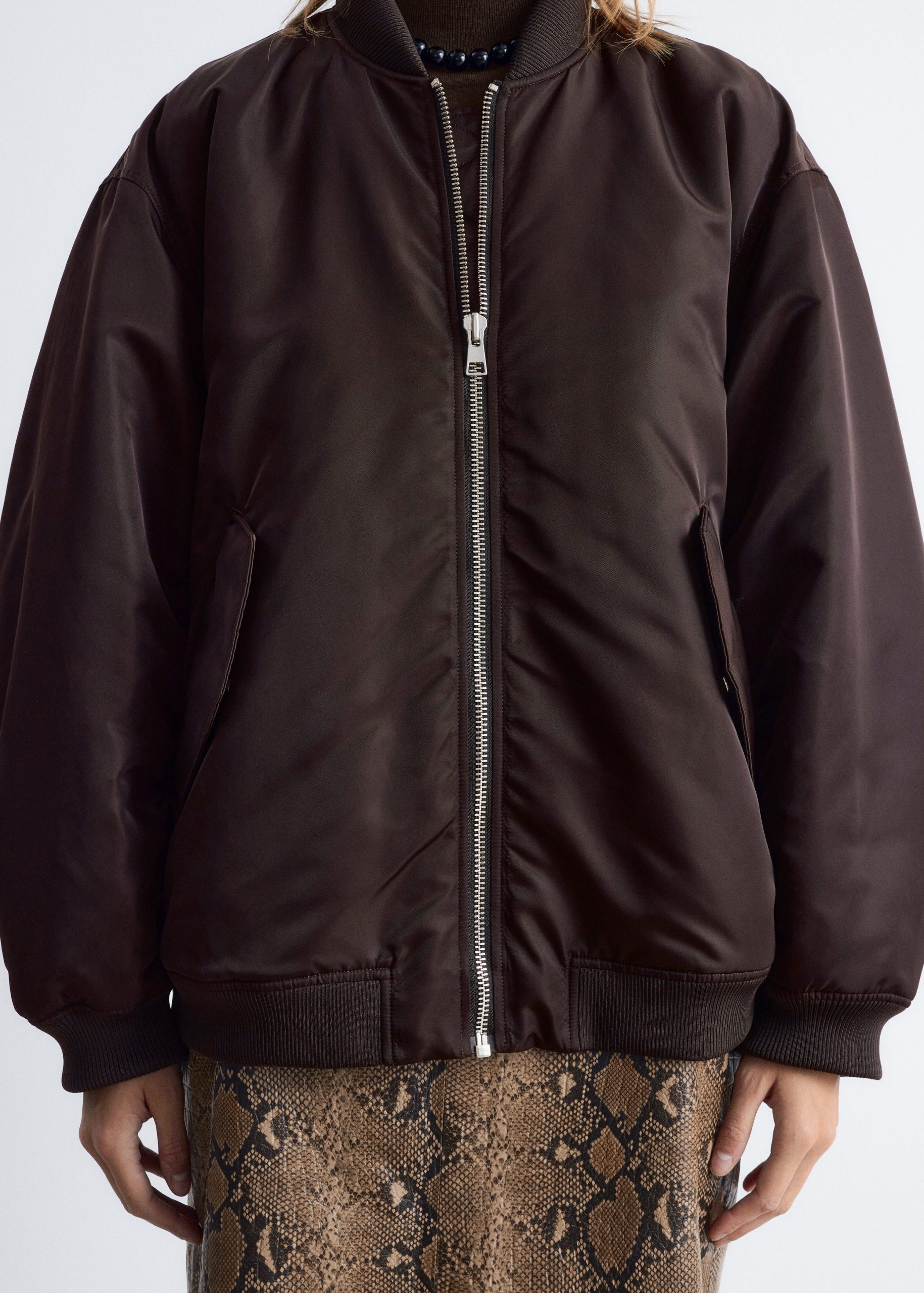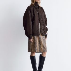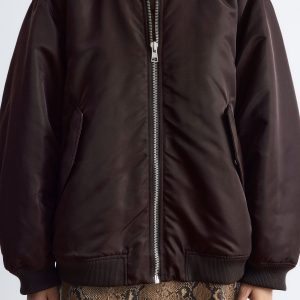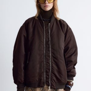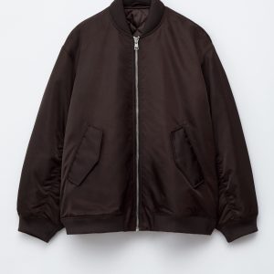 This bomber jacket features a long, boxy silhouette with all-over padding for added warmth. It’s detailed with a ribbed collar, hem, and cuffs, as well as topstitched seams at the sleeves that create subtle puckering. Finished with slanted flap pockets at the front and a zip closure.