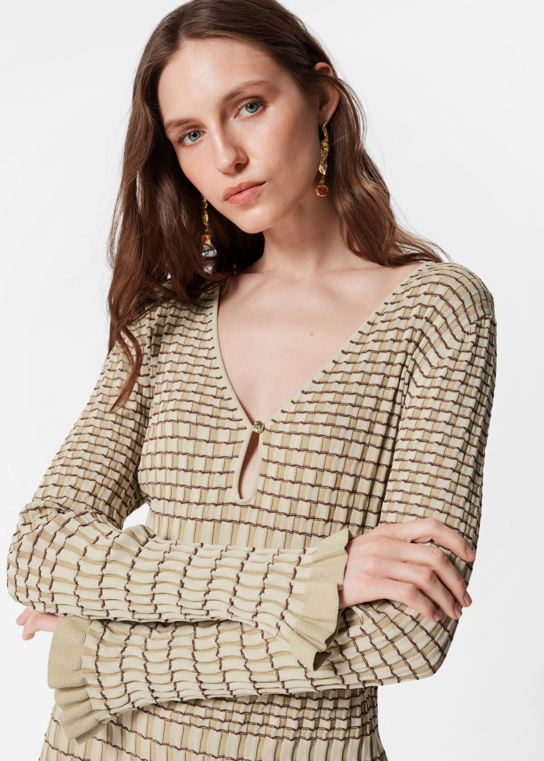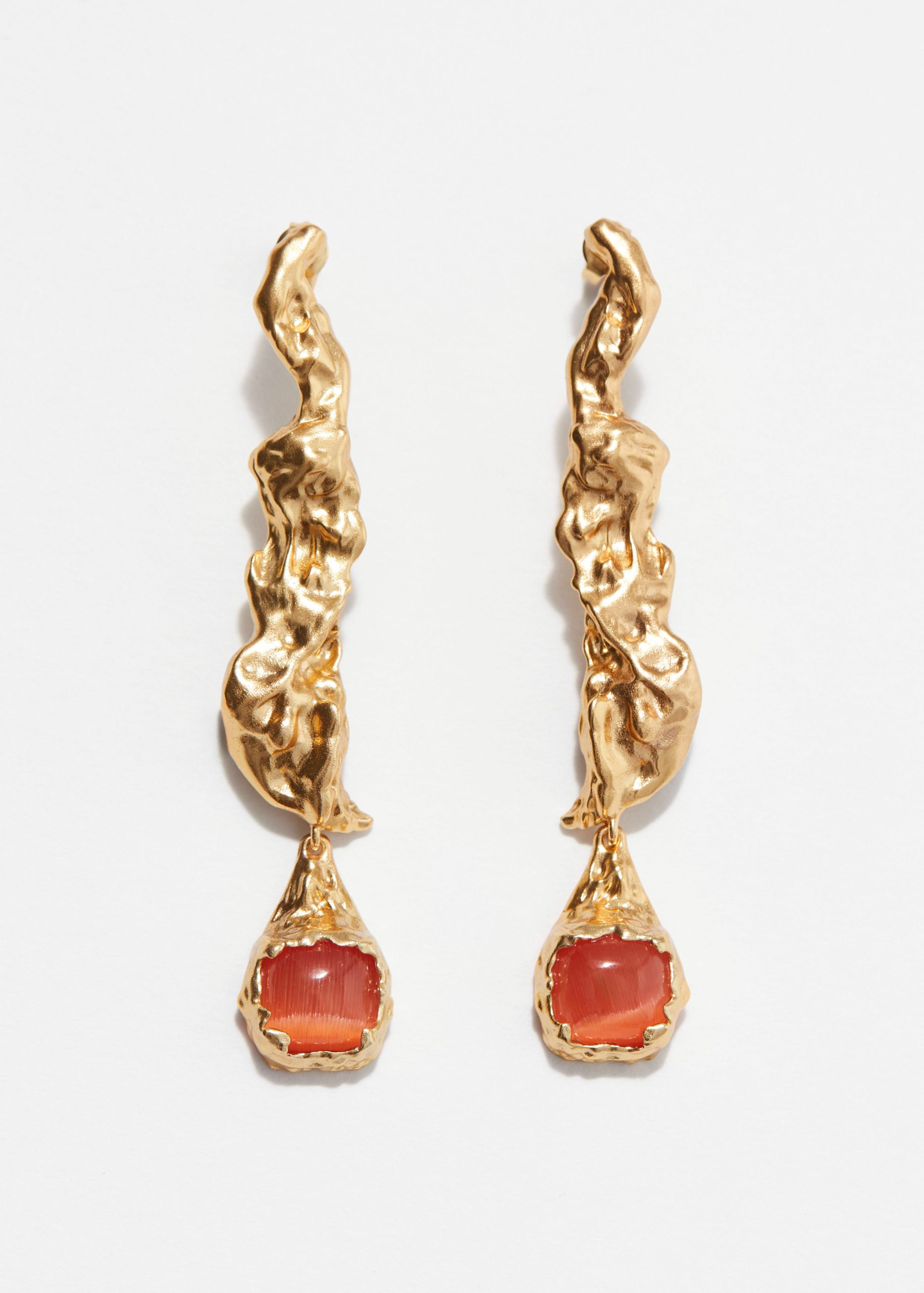 These long earrings feature a drop pendant with a vibrant glass crystal at its centre. Crafted in India from polished brass with an irregular surface, they evoke a rustic feel that contrasts beautifully with the delicate crystal.