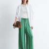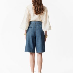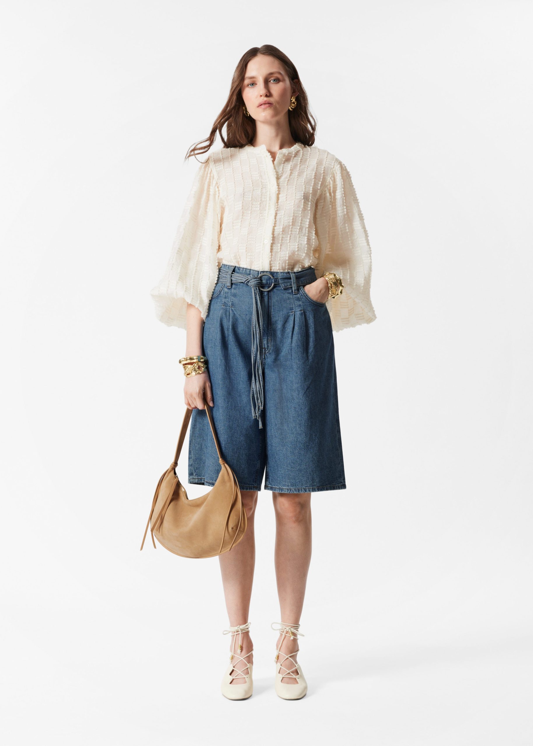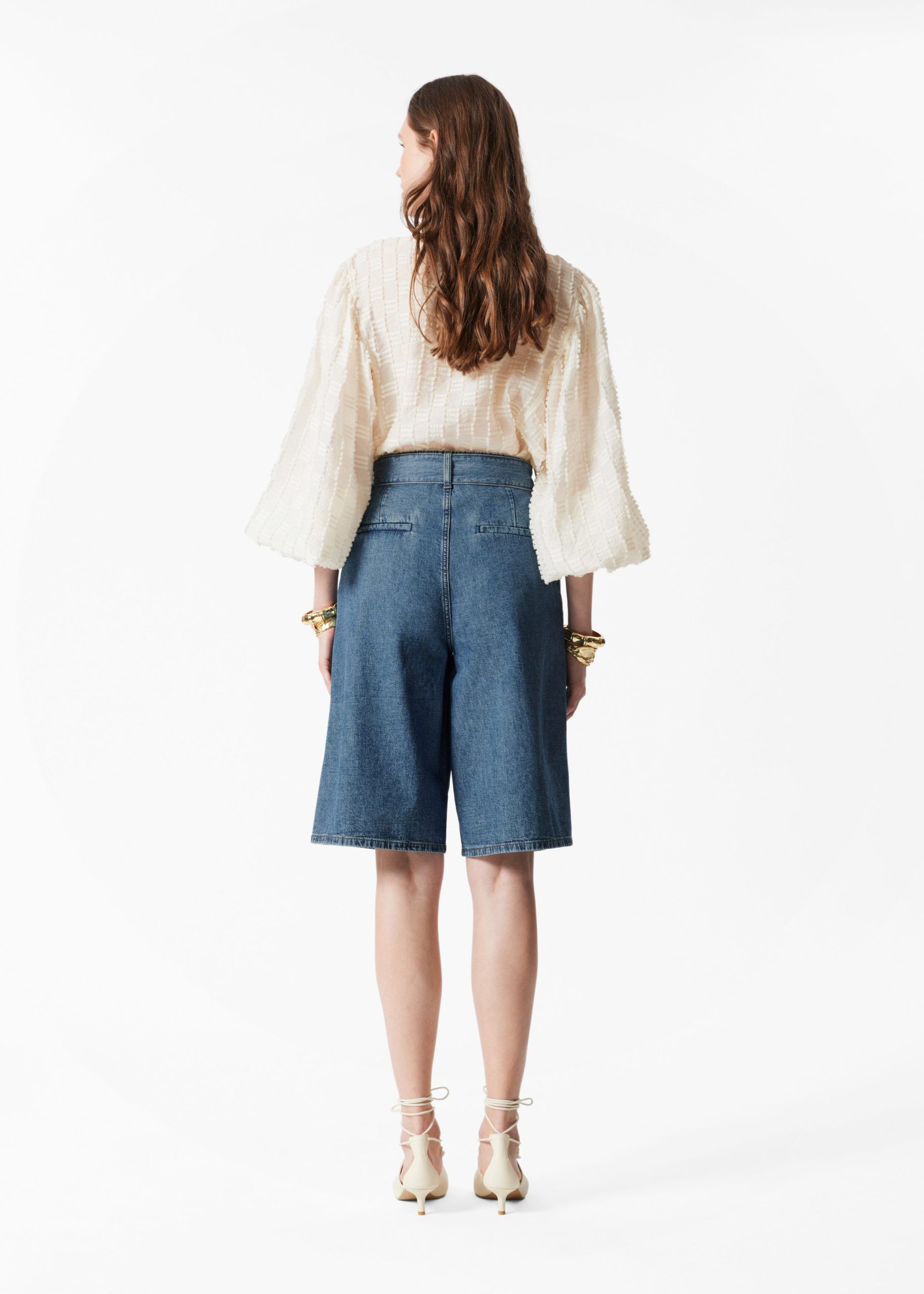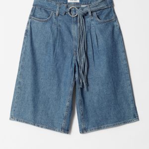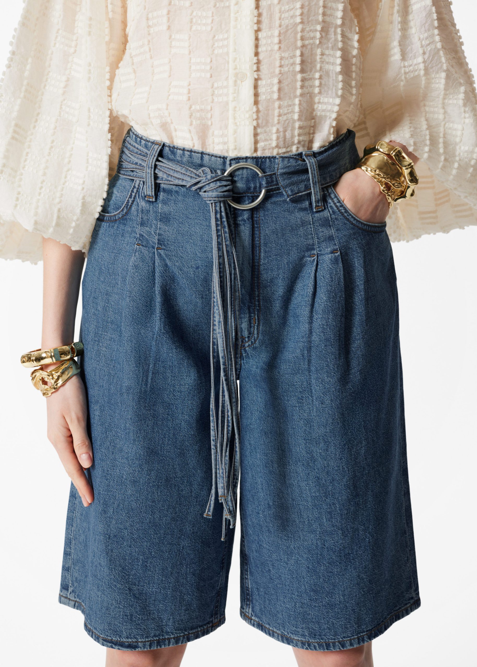 These denim shorts are crafted from rigid, pure cotton and designed in a long Bermuda silhouette that cuts off at the knee. They feature a high waist with fixed pleats and a built-in belt with a metallic buckle and denim fringes that cascade down the front. Style them with strappy heels and a t-shirt.
