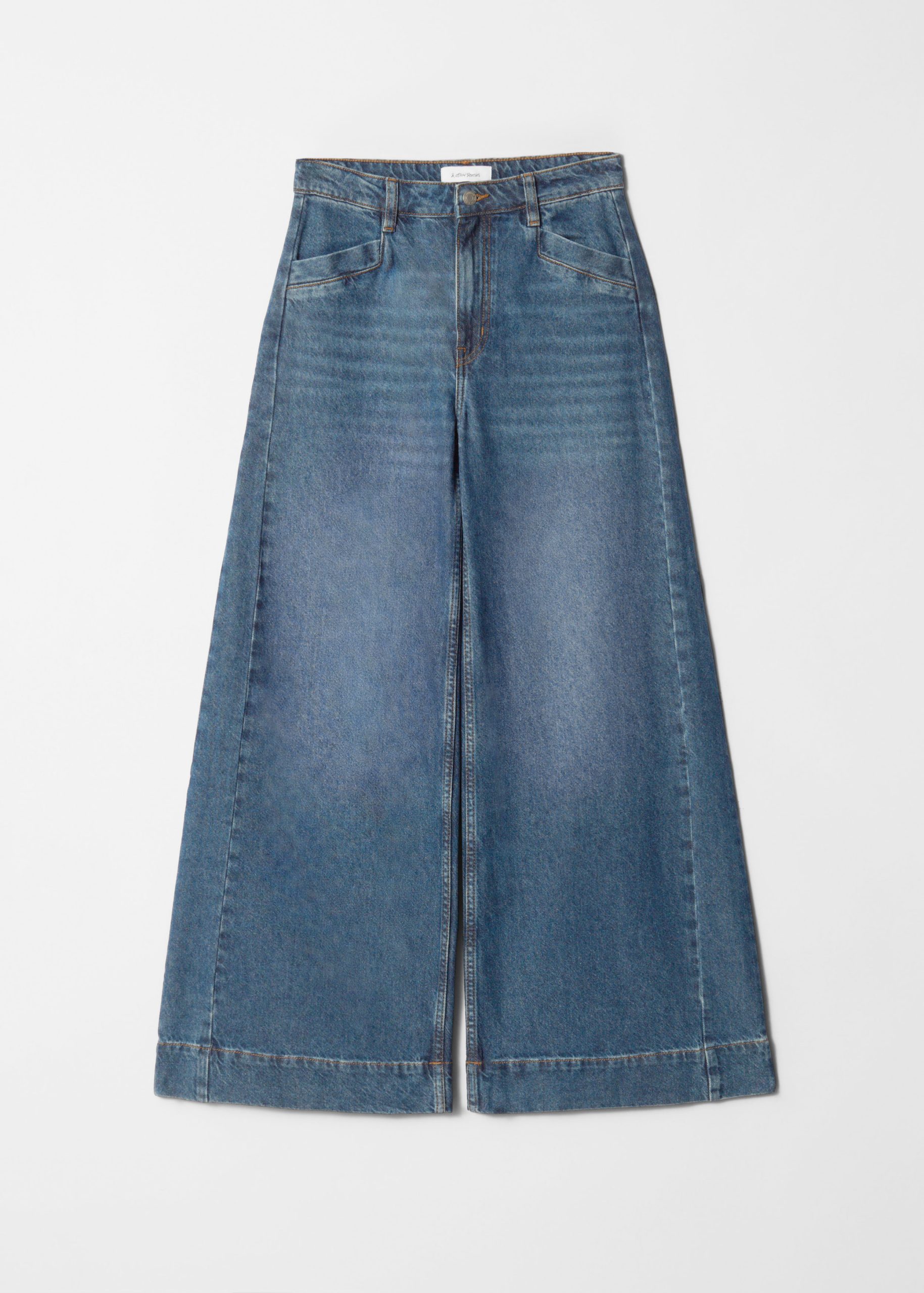 High waisted jeans featuring a wide, long silhouette. Designed with side panel details along the legs and a wide topstitched hemline.Â