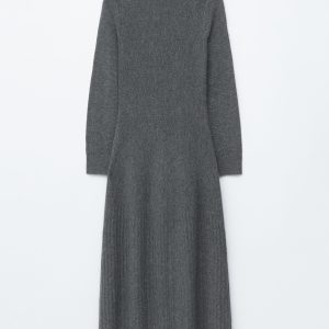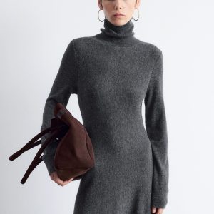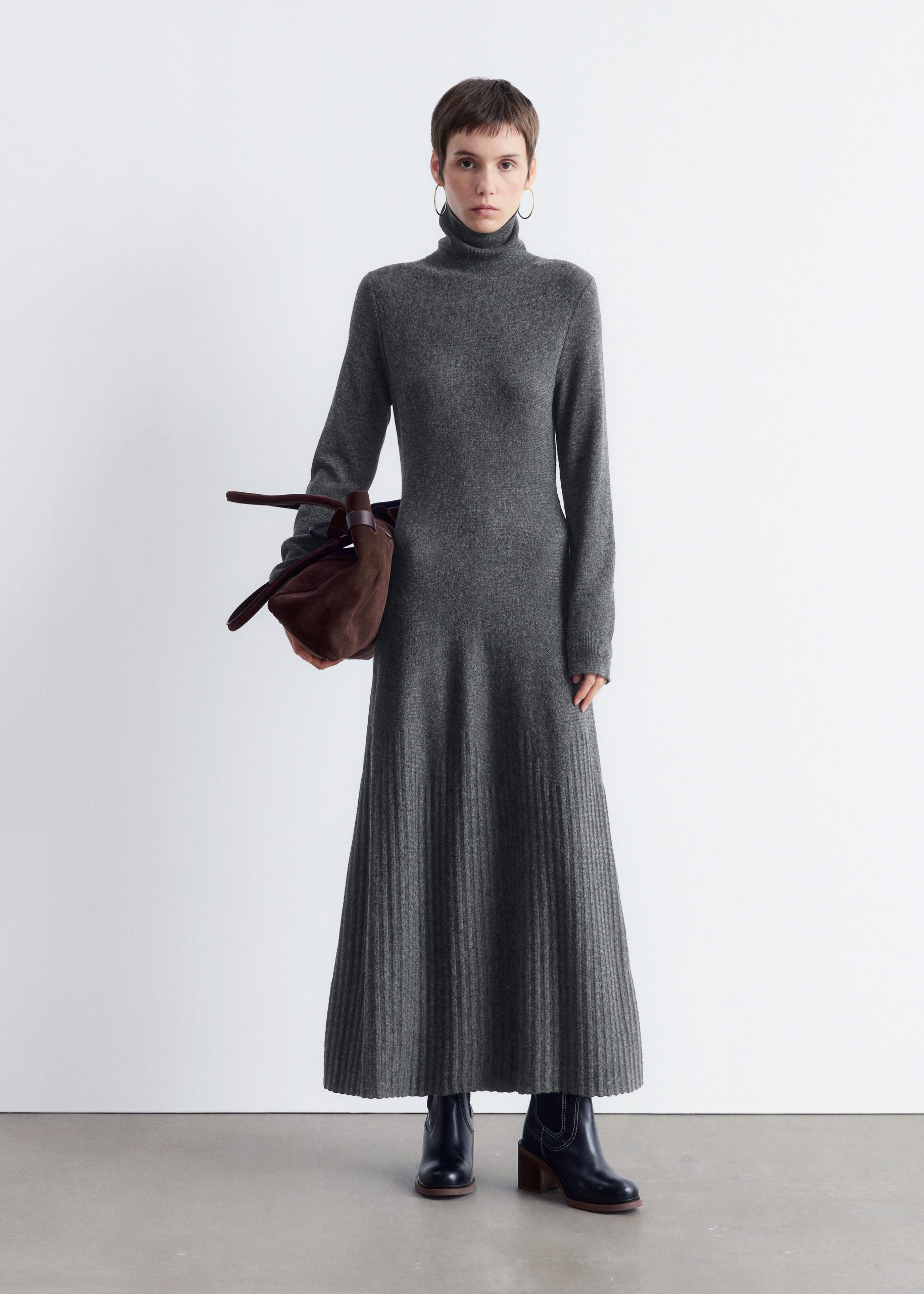 This maxi dress is knitted from 100% merino wool. It features a folded turtleneck and a fitted silhouette that flares into an A-line skirt, accented by a rib-detailed hem.