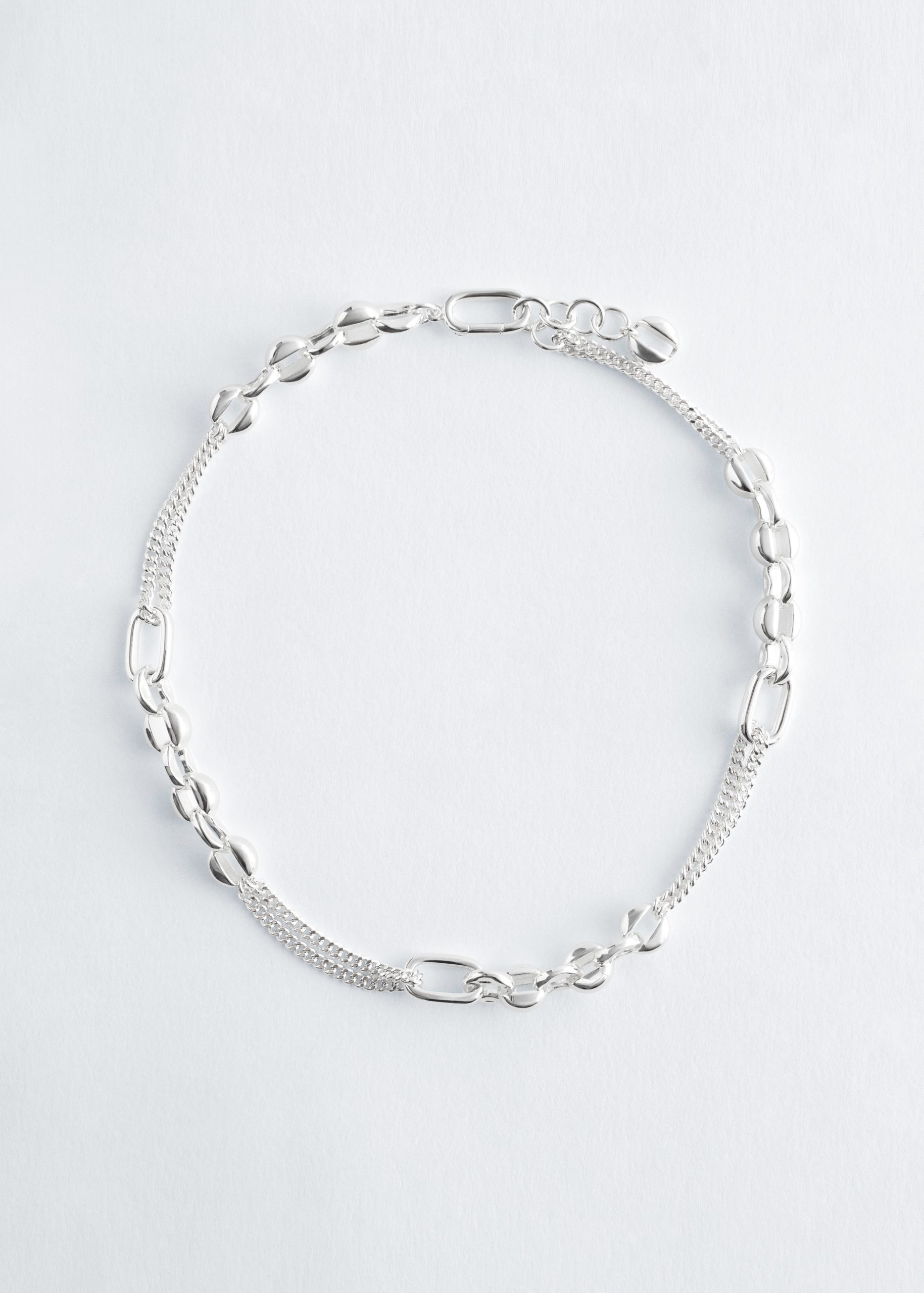 This playful necklace is composed of interlocking round and elongated links. Finished with O-ring closure and a generous extension chain for desired fit.