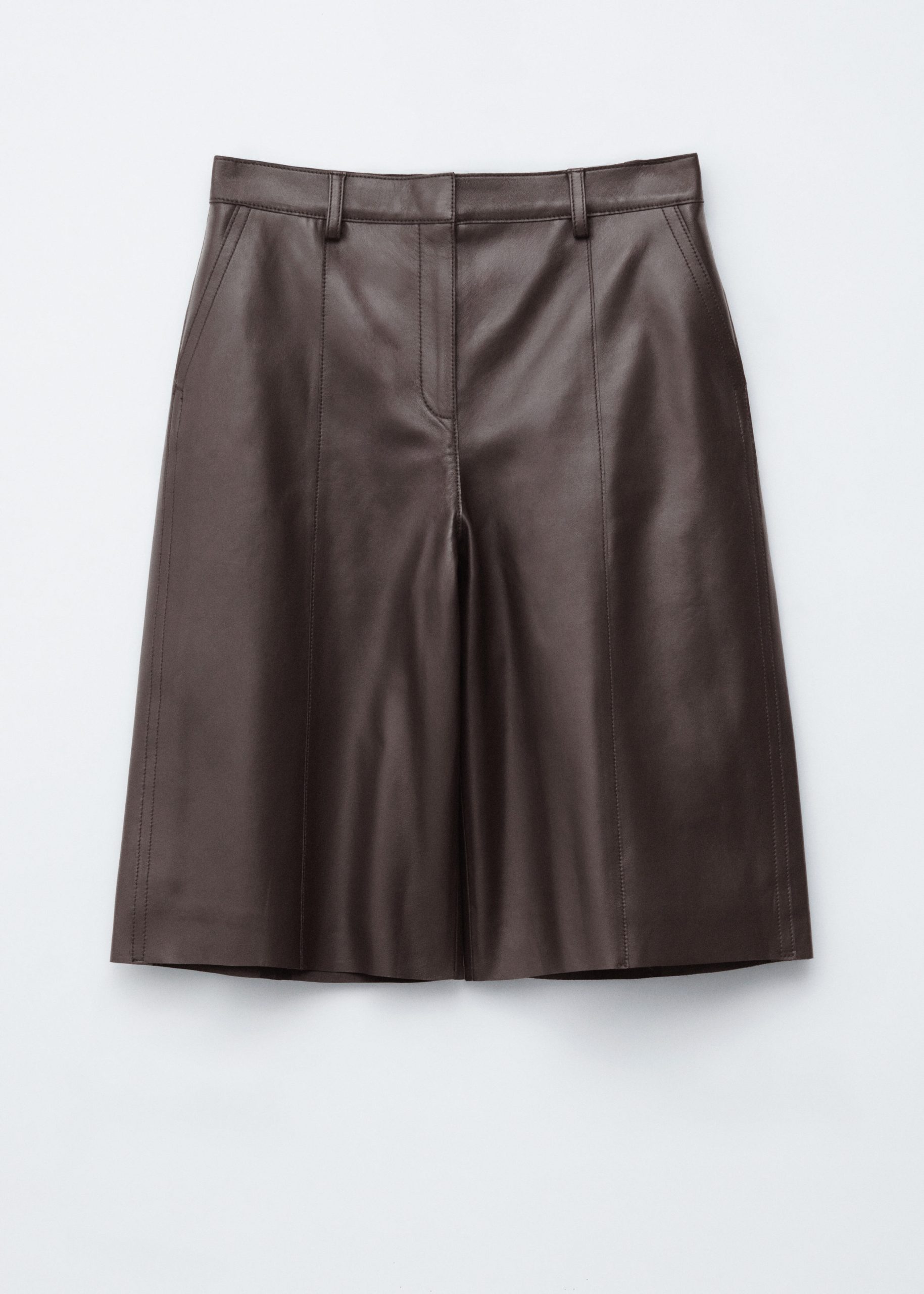 Crafted from 100% nappa leather, these long Bermuda shorts are cut with a high waist and wide, flared legs that fall to the knee. Detailed with topstitched cut-line seams, side-seam pockets, and a single back welt pocket. Finished with a zip and hook-and bar closure. Pair with the matching leather jacket for a tonal co-ord look.