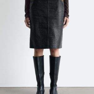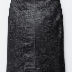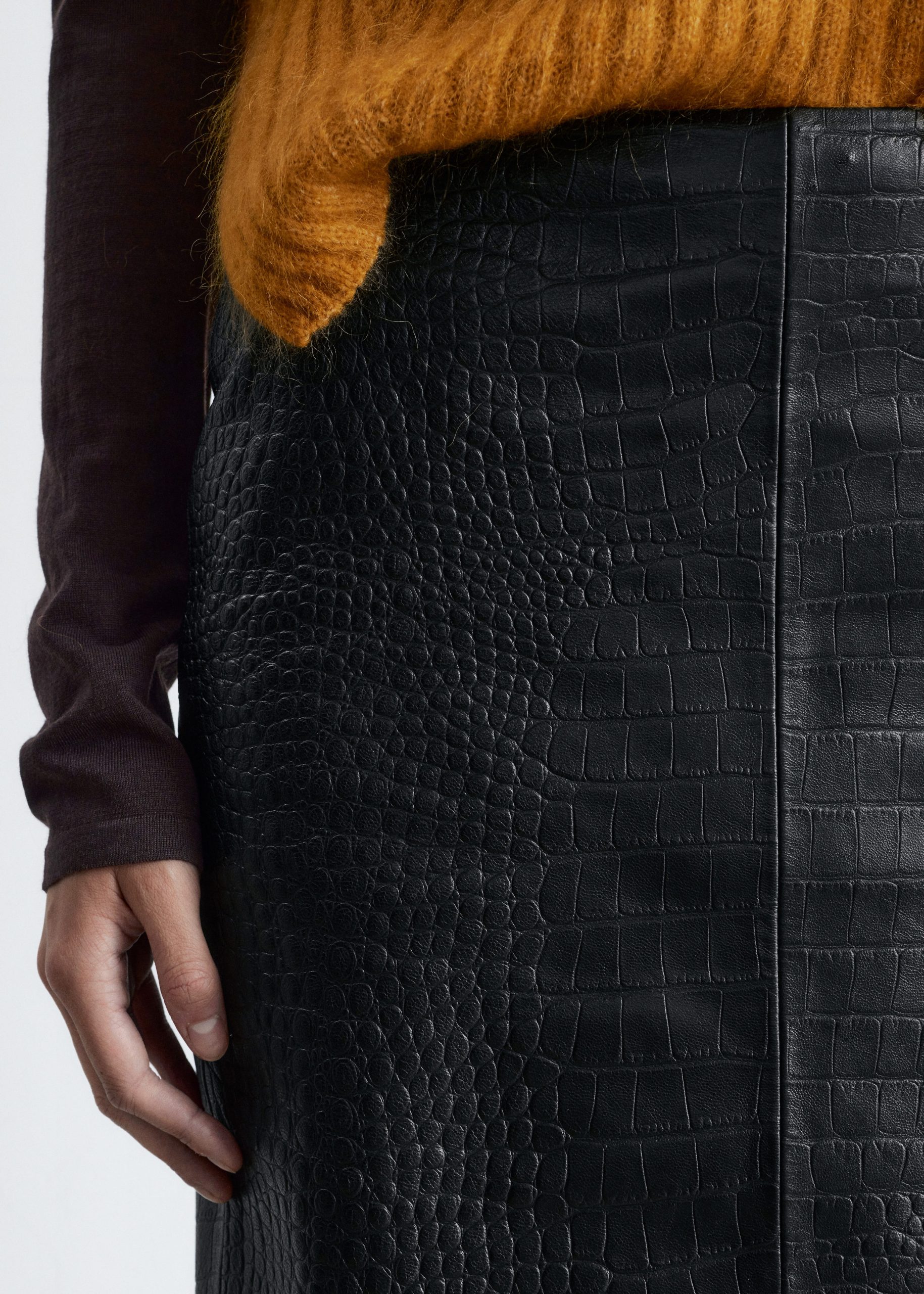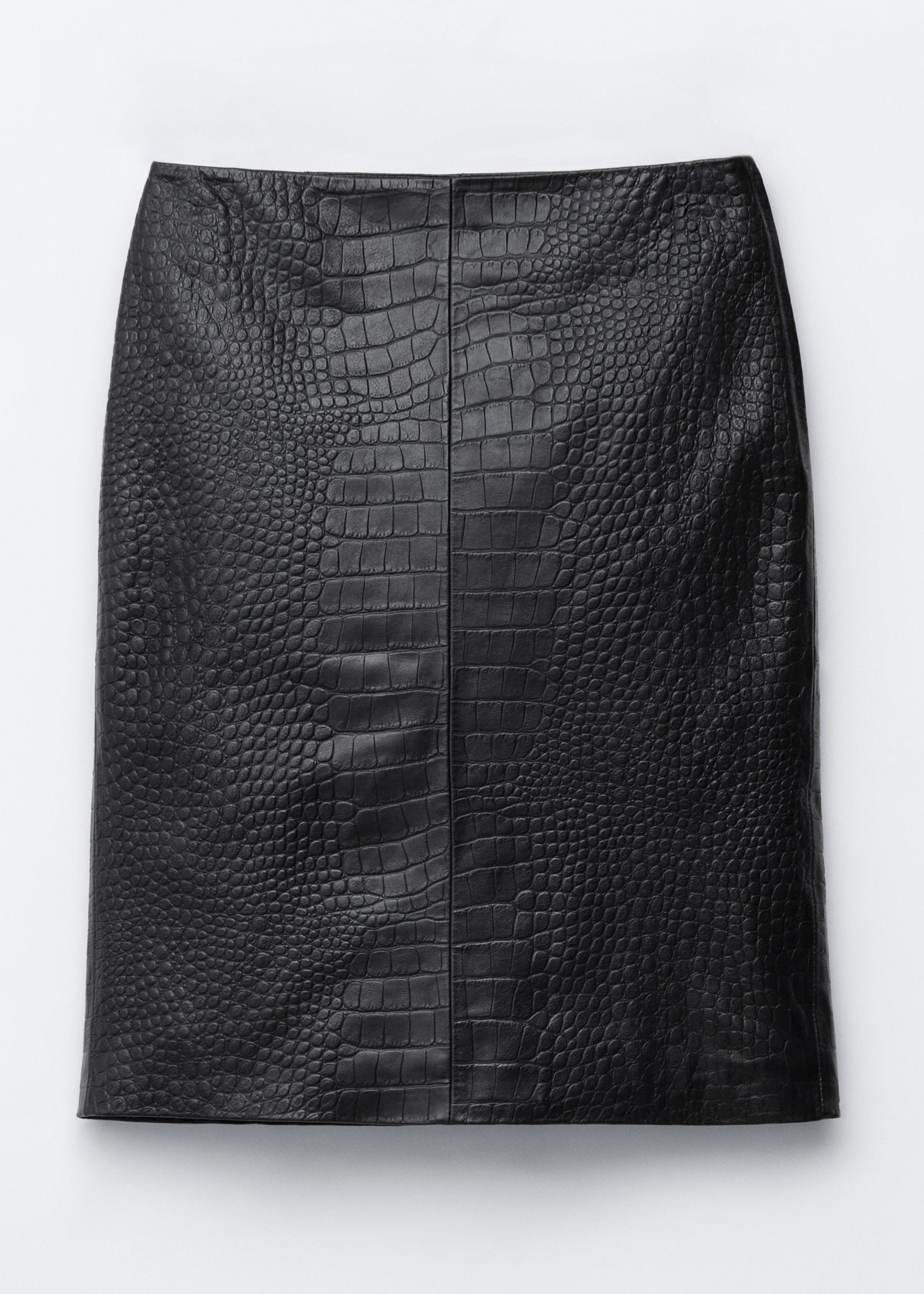 This midi-length pencil skirt is crafted from 100% nappa leather with a textured crocodile finish. It features a regular waist with a concealed side zipper, and a subtle vent at the back hem.
