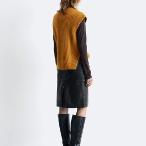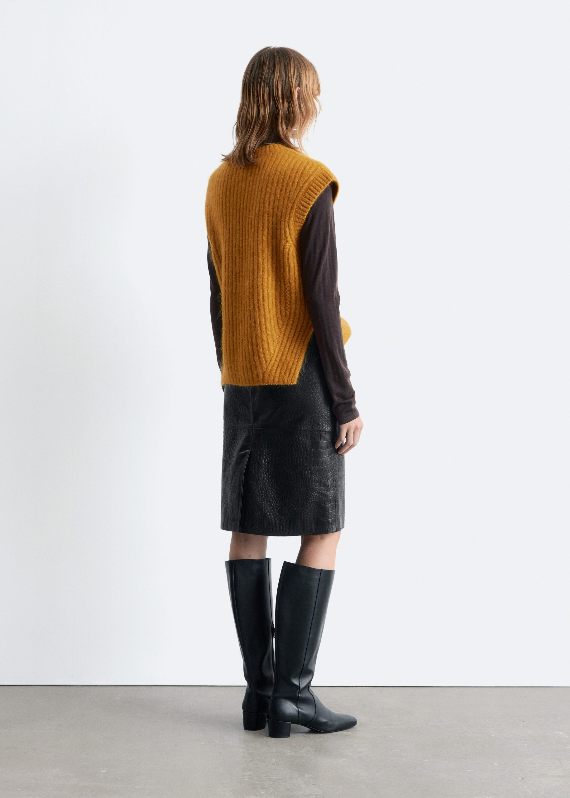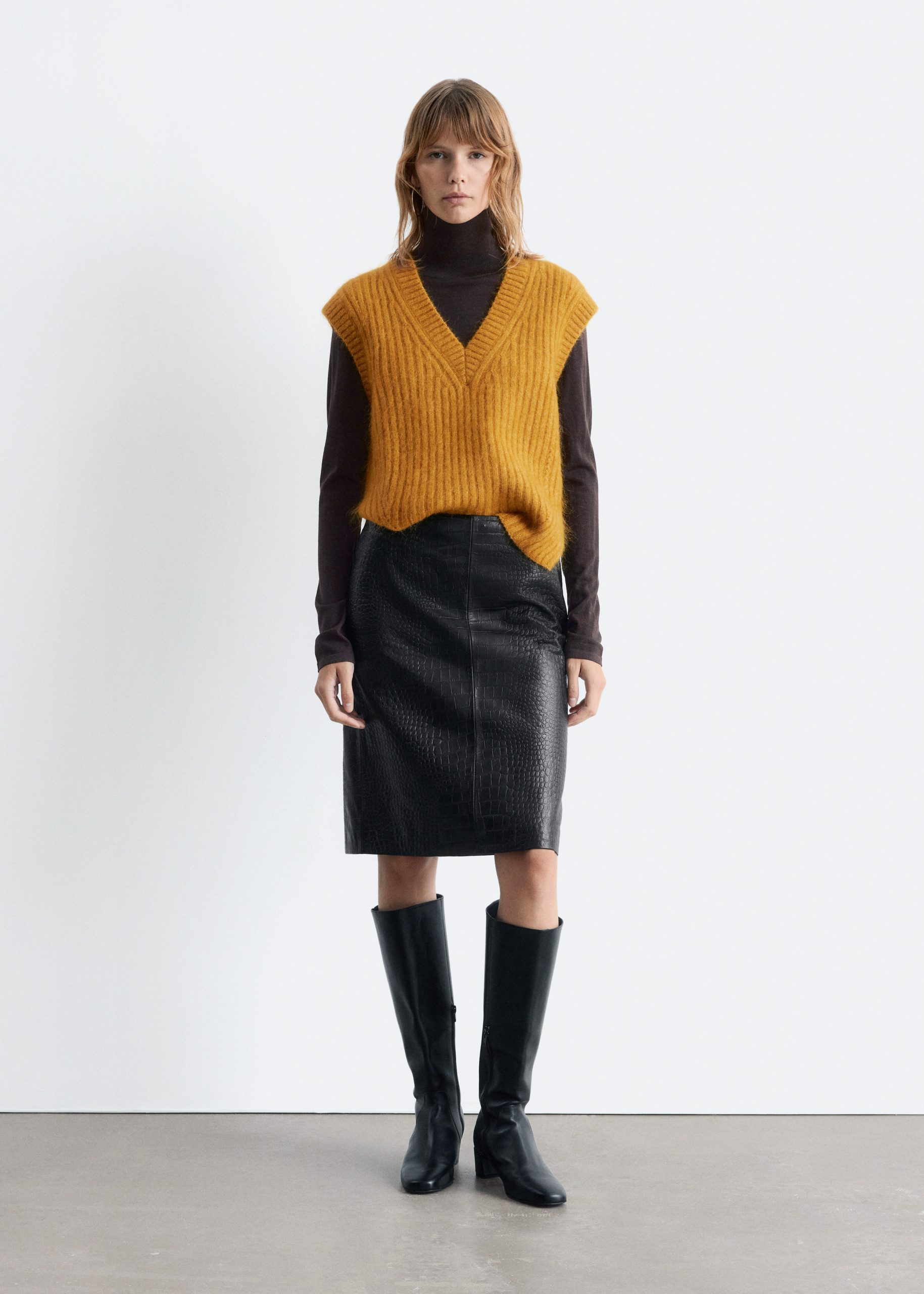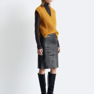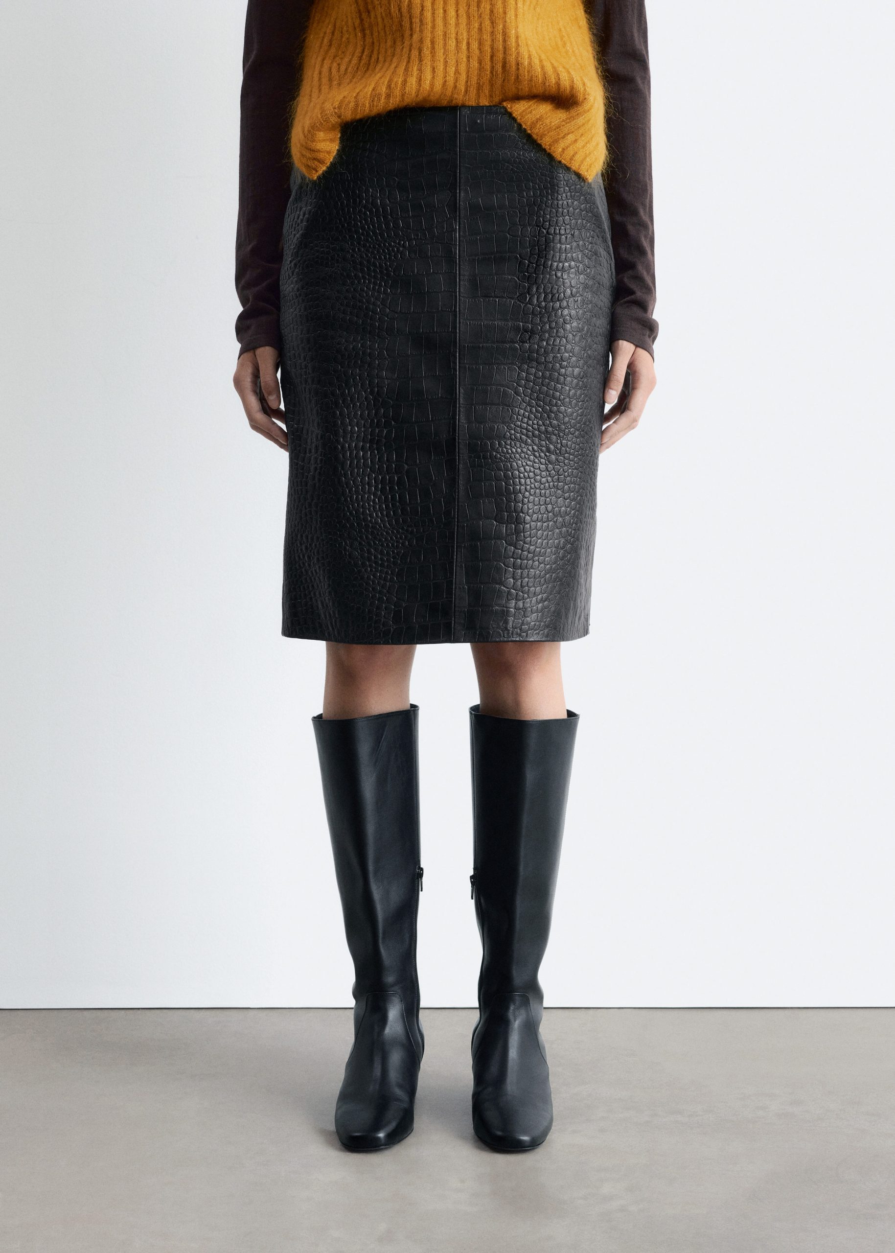 This midi-length pencil skirt is crafted from 100% nappa leather with a textured crocodile finish. It features a regular waist with a concealed side zipper, and a subtle vent at the back hem.