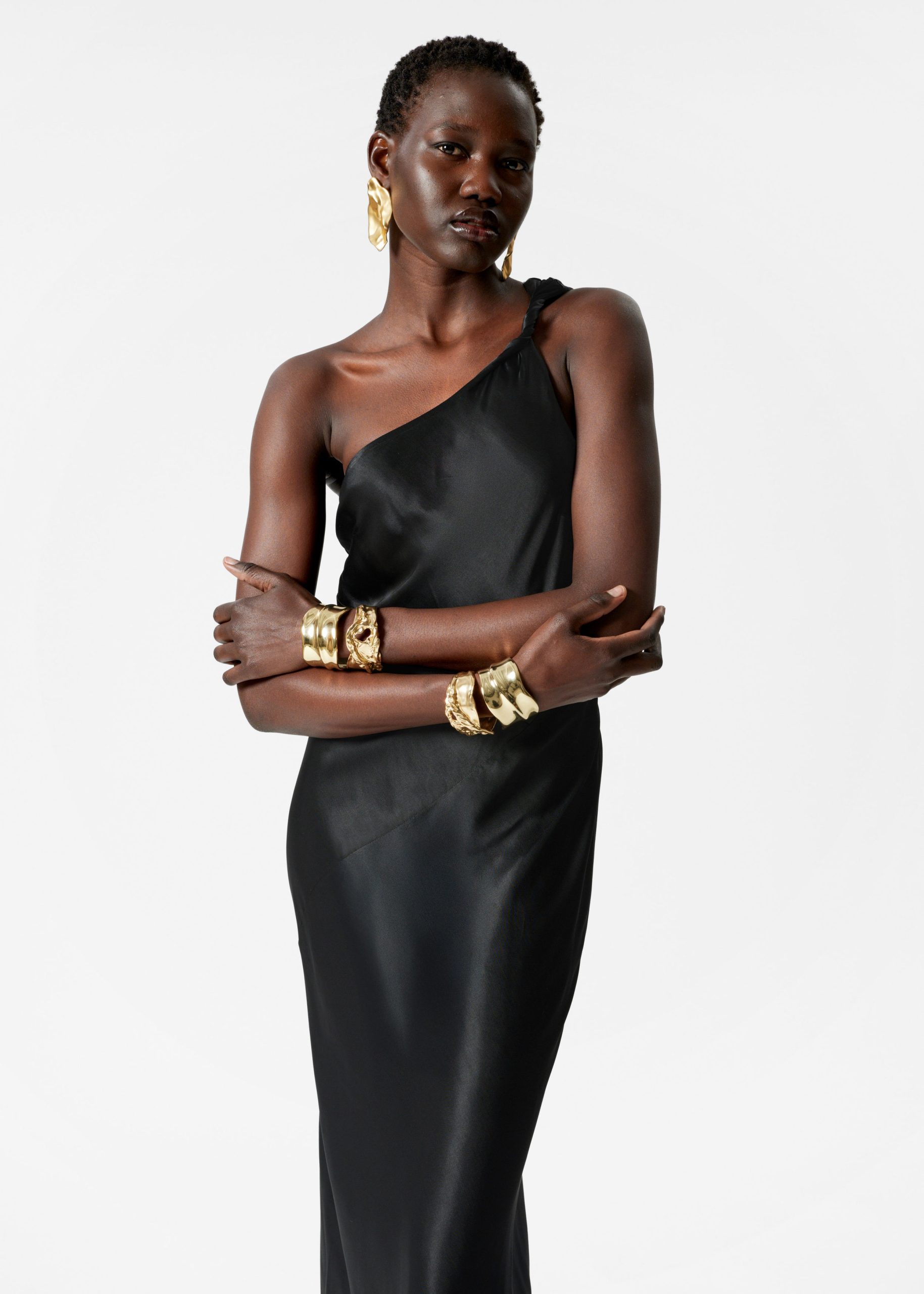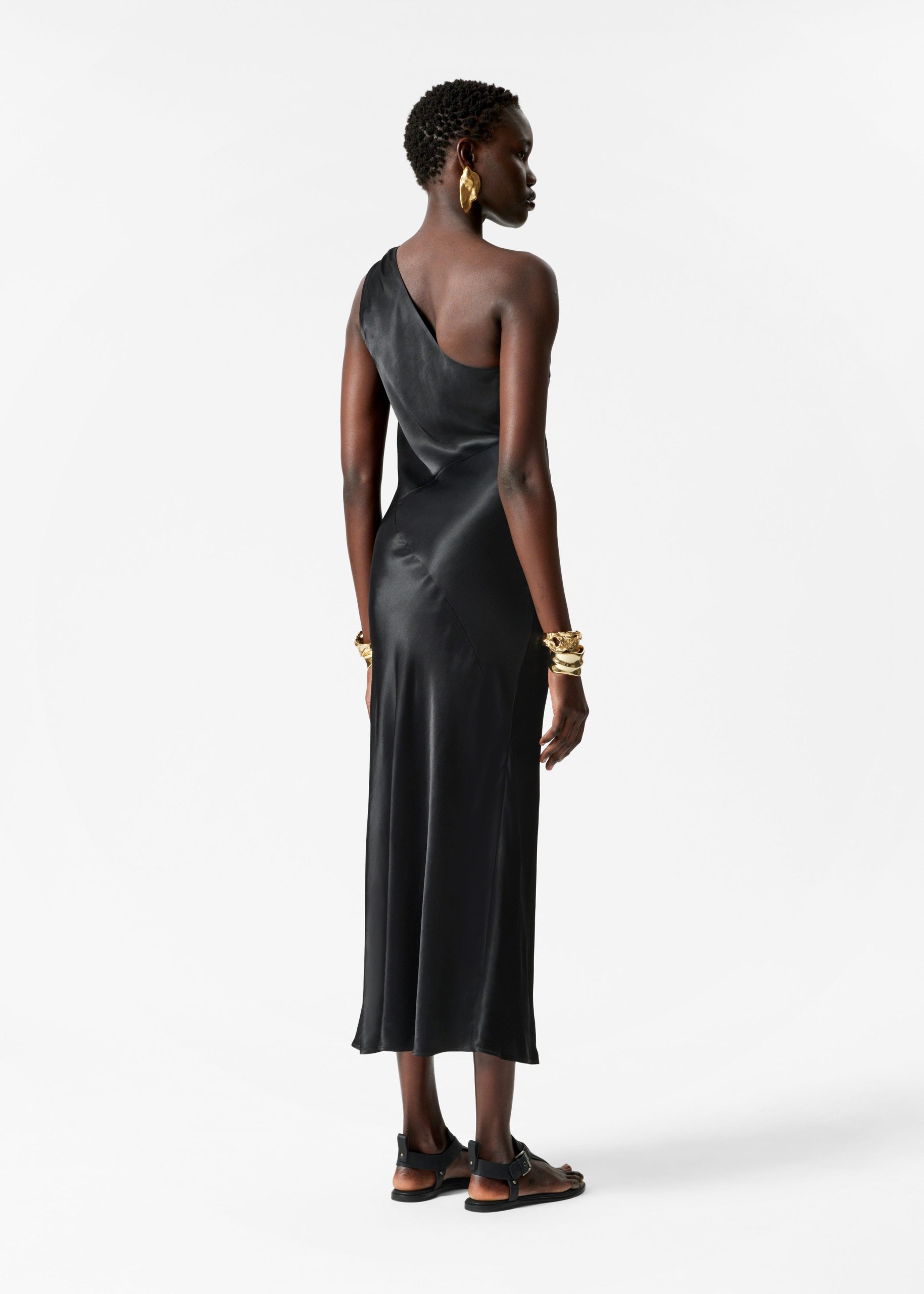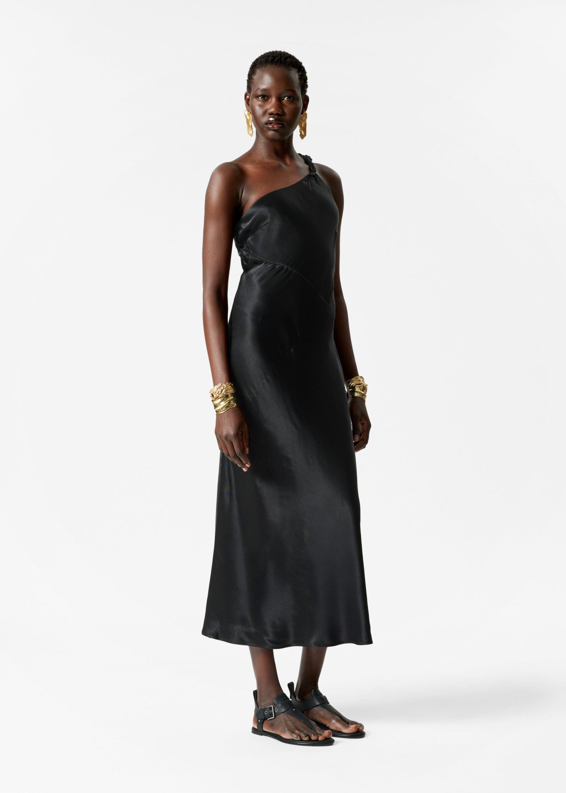 This midi dress is crafted from satin, giving it a supple, glossy finish. Cut in a fluid silhouette, it features a one-shoulder design with a twisted strap. Completed with a concealed side seam zipper. Style it with bold jewellery and strappy heels.