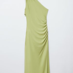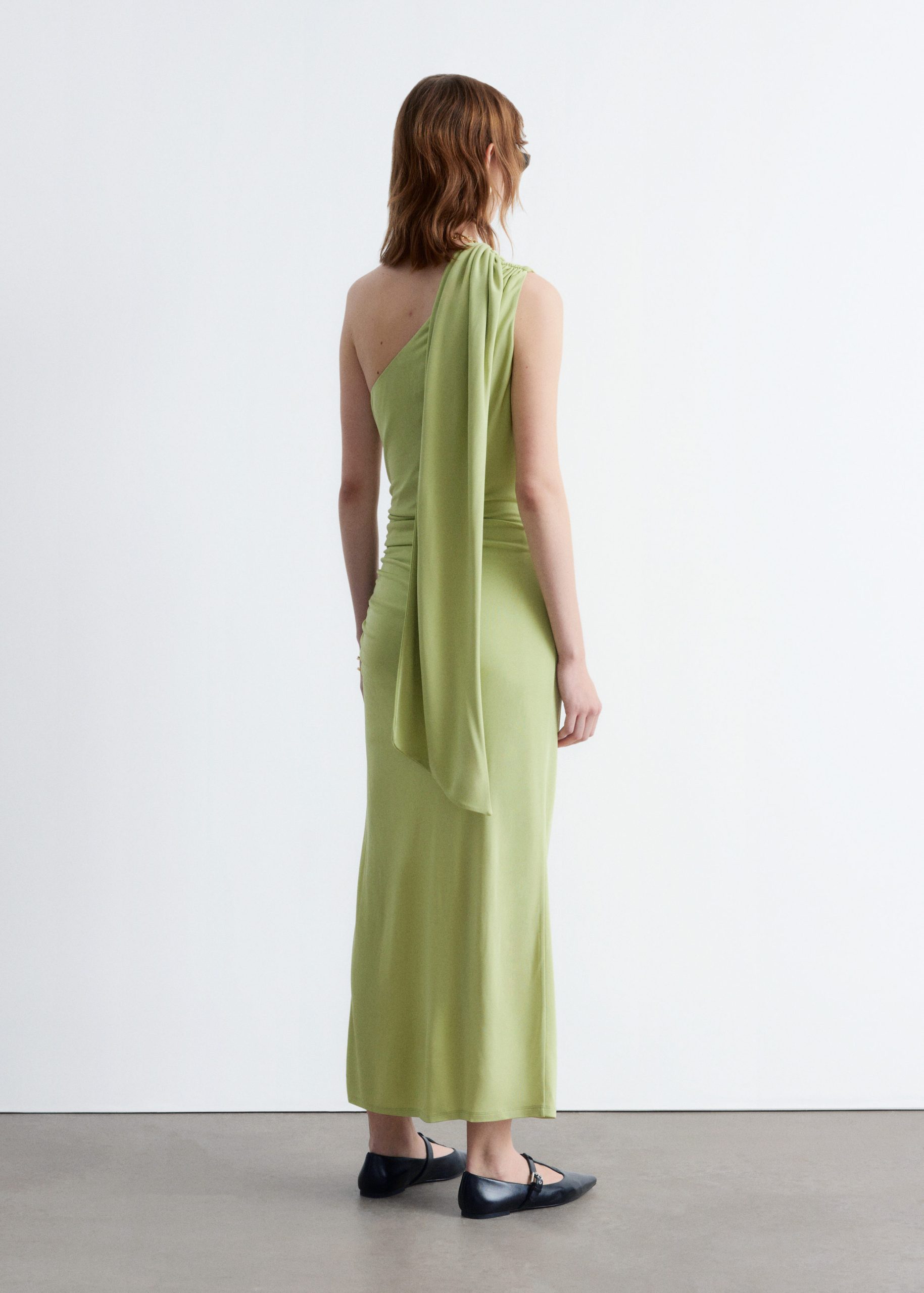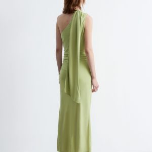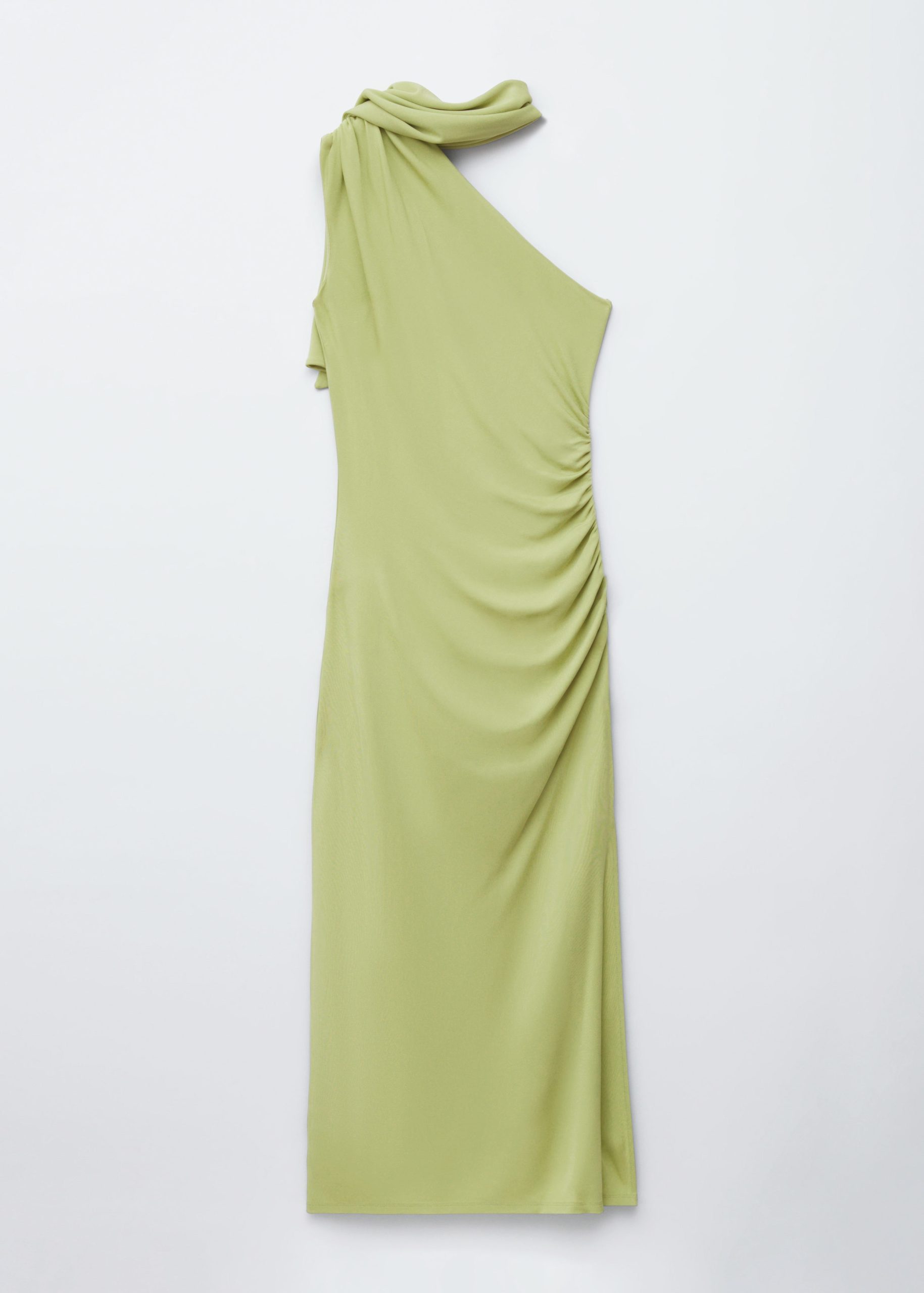 This midi dress is crafted from a soft and stretchy jersey fabric that hugs the body in a slim-fitting silhouette. Cut in a one-shoulder design, it features a built-in scarf-detail that drapes around the neck and cascade down the back. Accented by delicate ruching around the shoulder and waist, and an open slit at the hem. Style with strappy heels and a clutch.