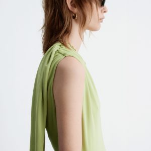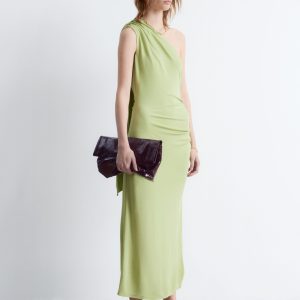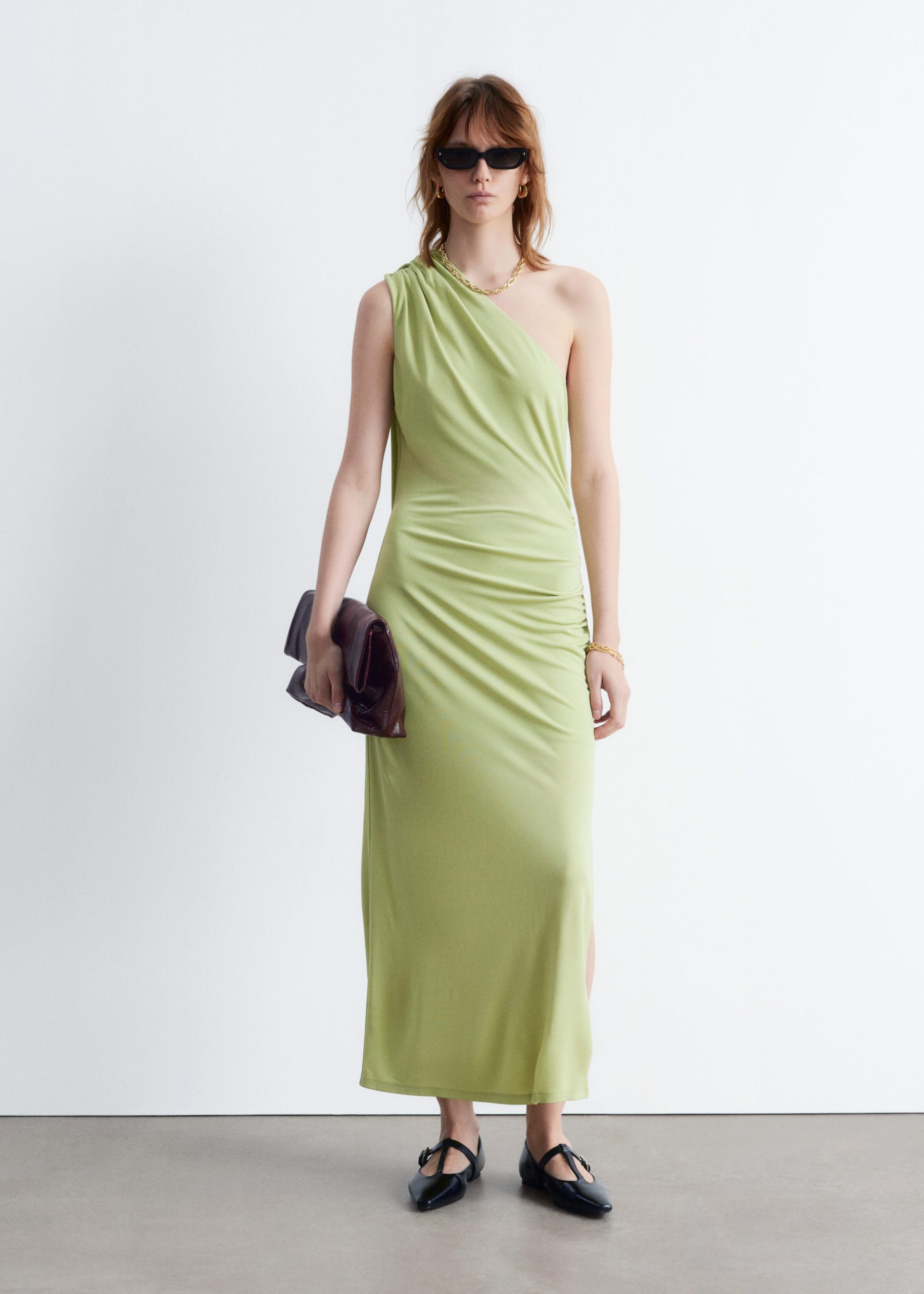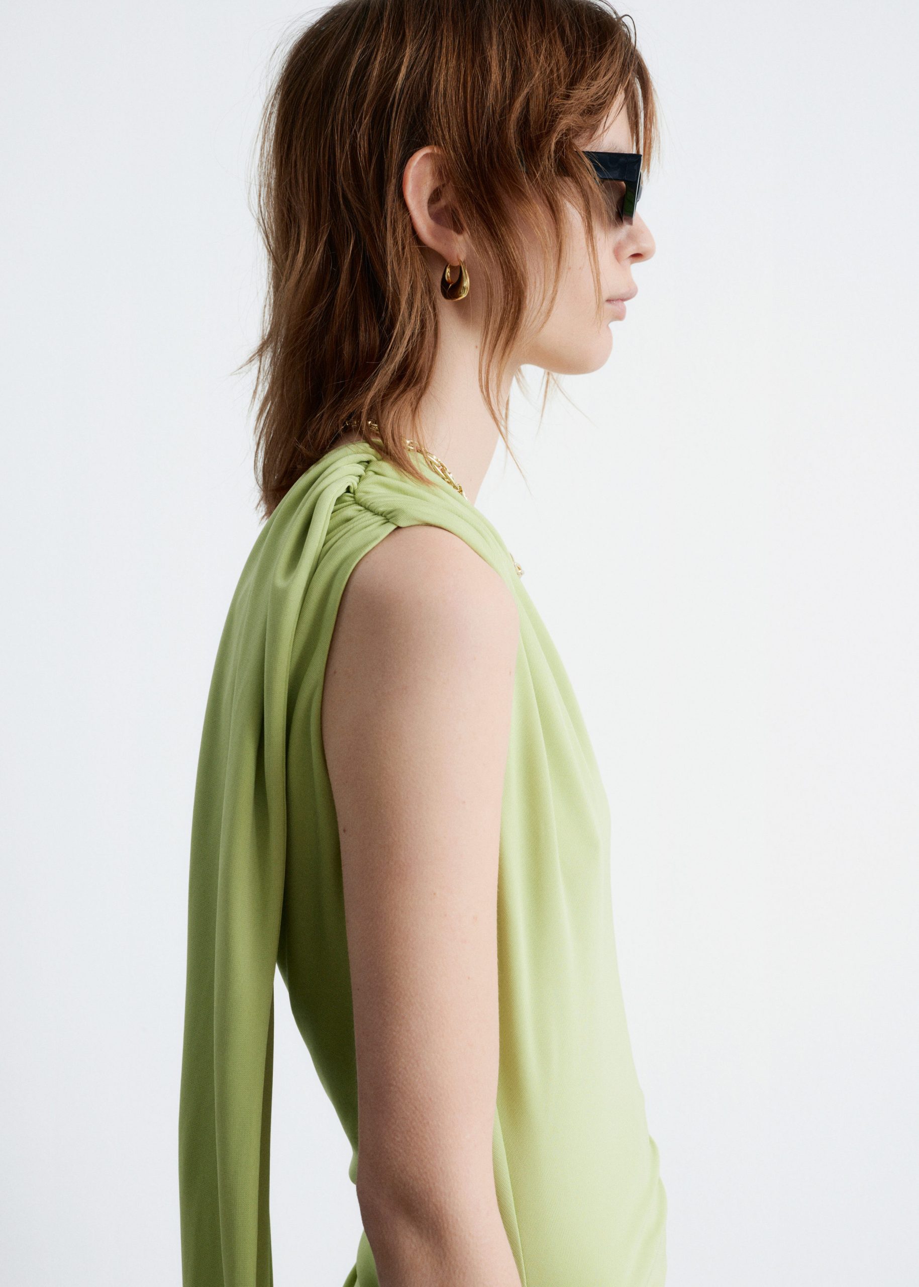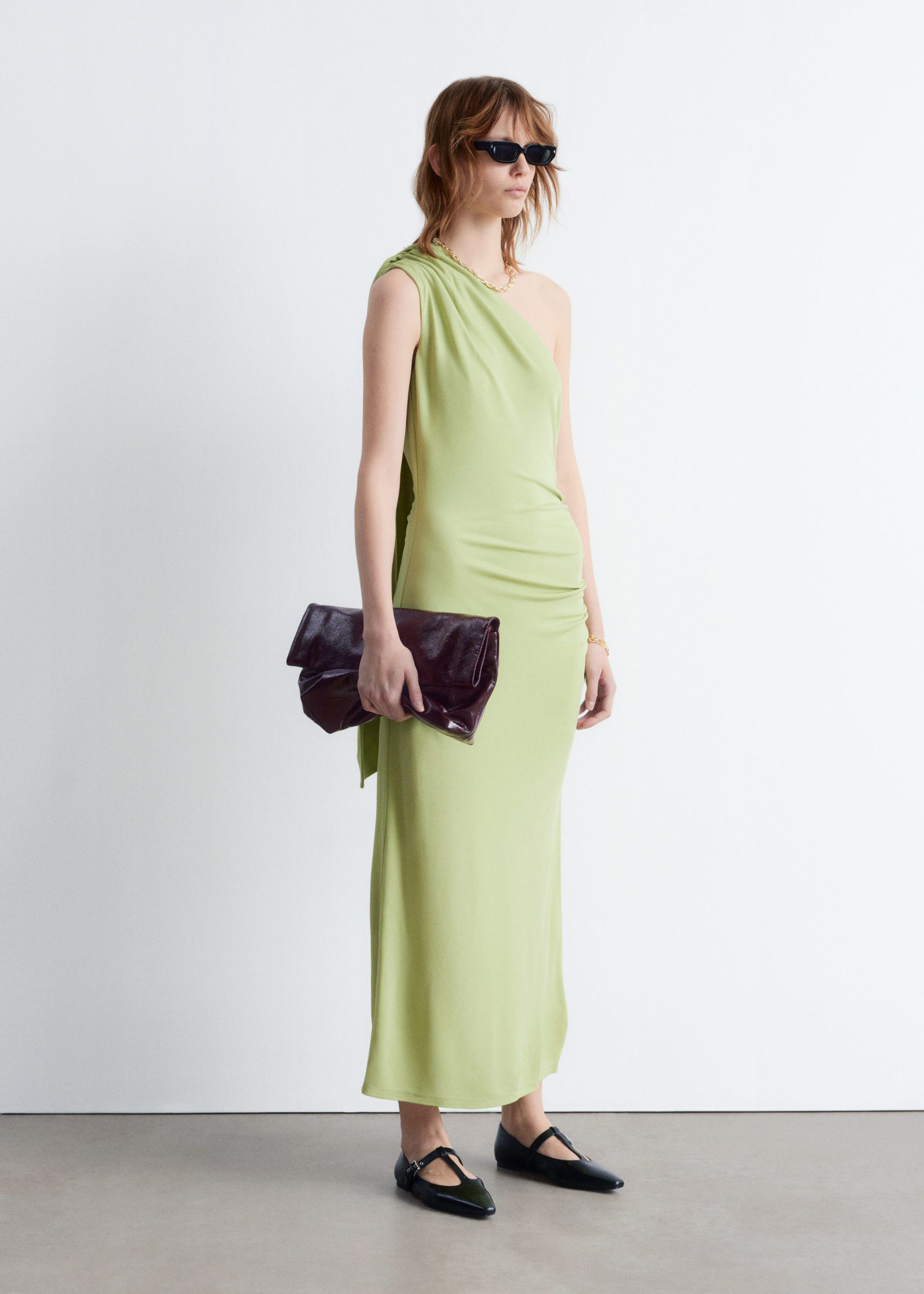 This midi dress is crafted from a soft and stretchy jersey fabric that hugs the body in a slim-fitting silhouette. Cut in a one-shoulder design, it features a built-in scarf-detail that drapes around the neck and cascade down the back. Accented by delicate ruching around the shoulder and waist, and an open slit at the hem. Style with strappy heels and a clutch.