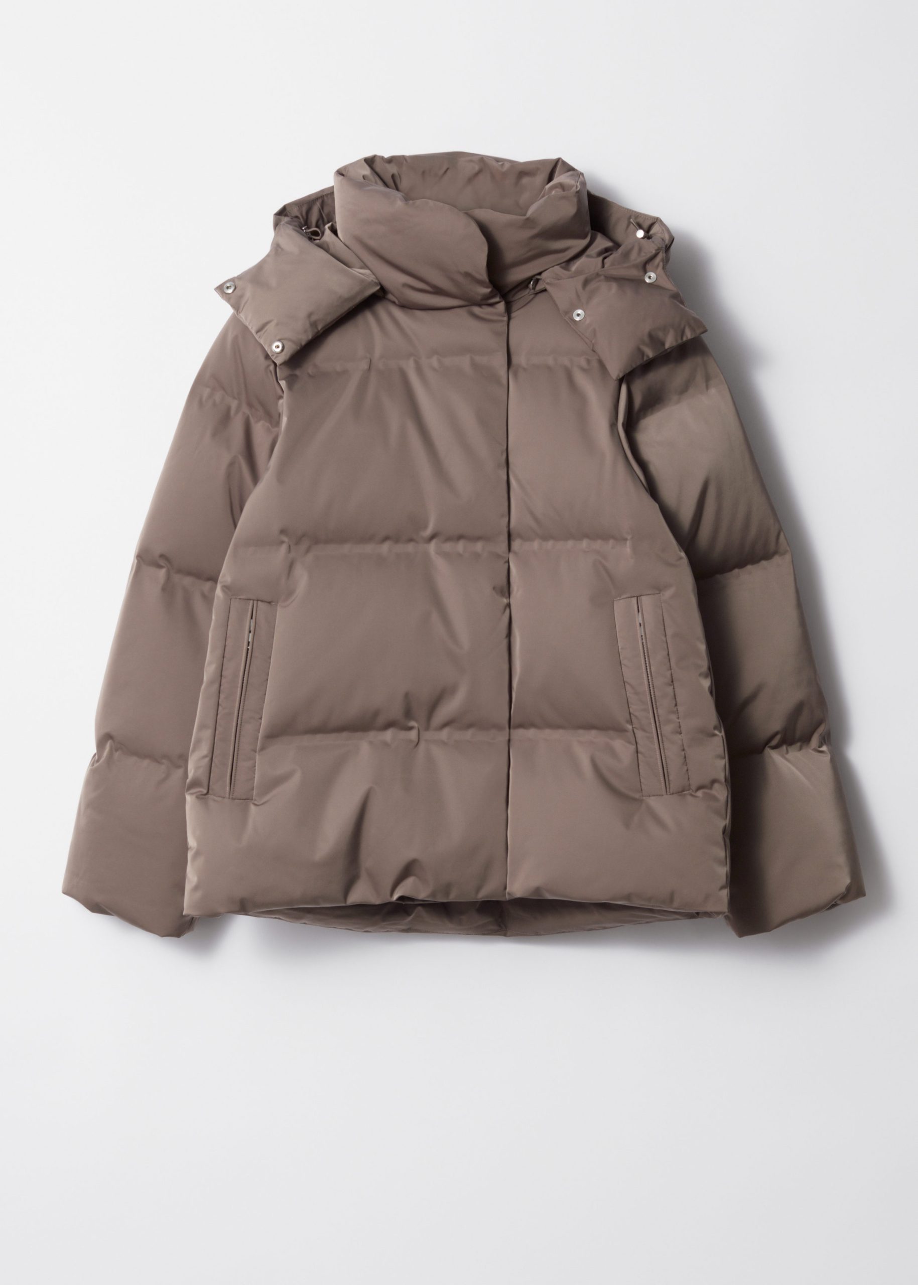 Padded down jacket finished with a detachable hood.