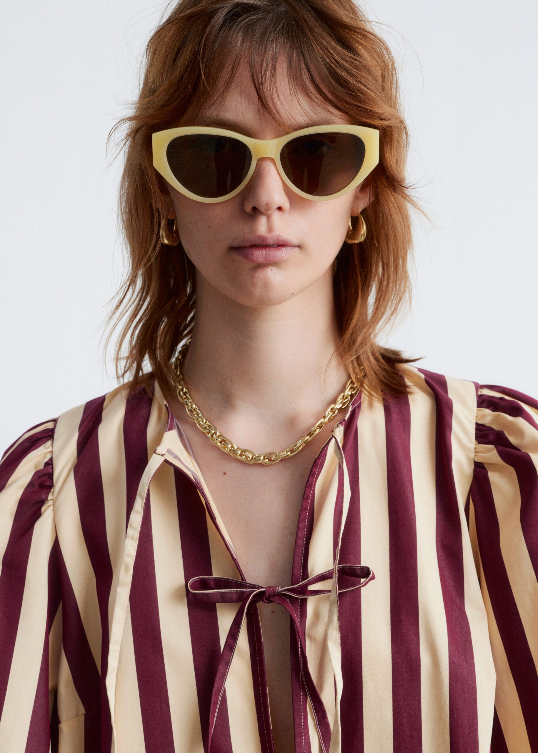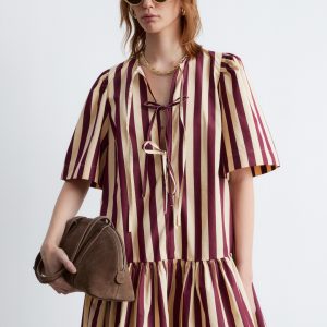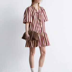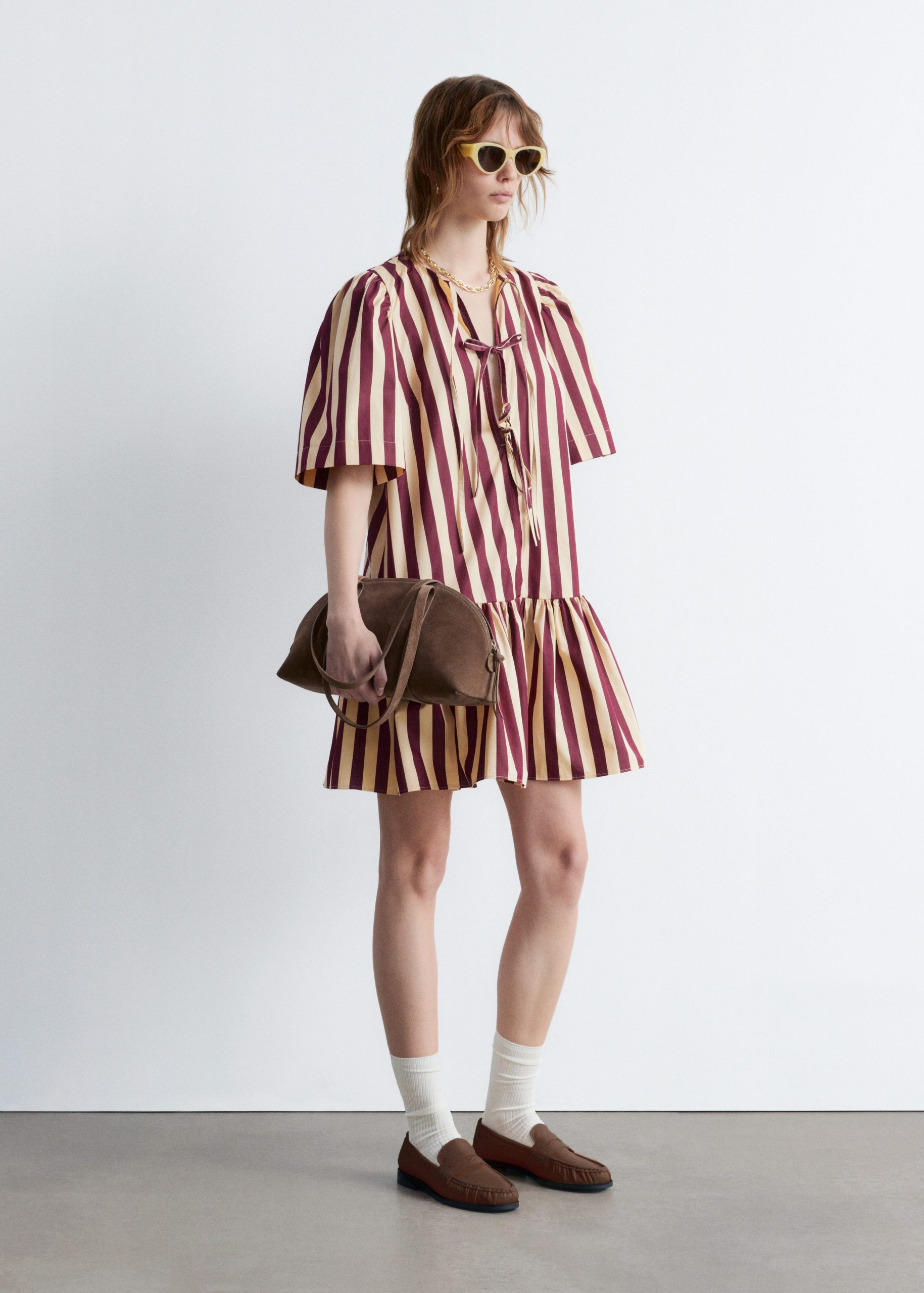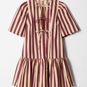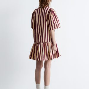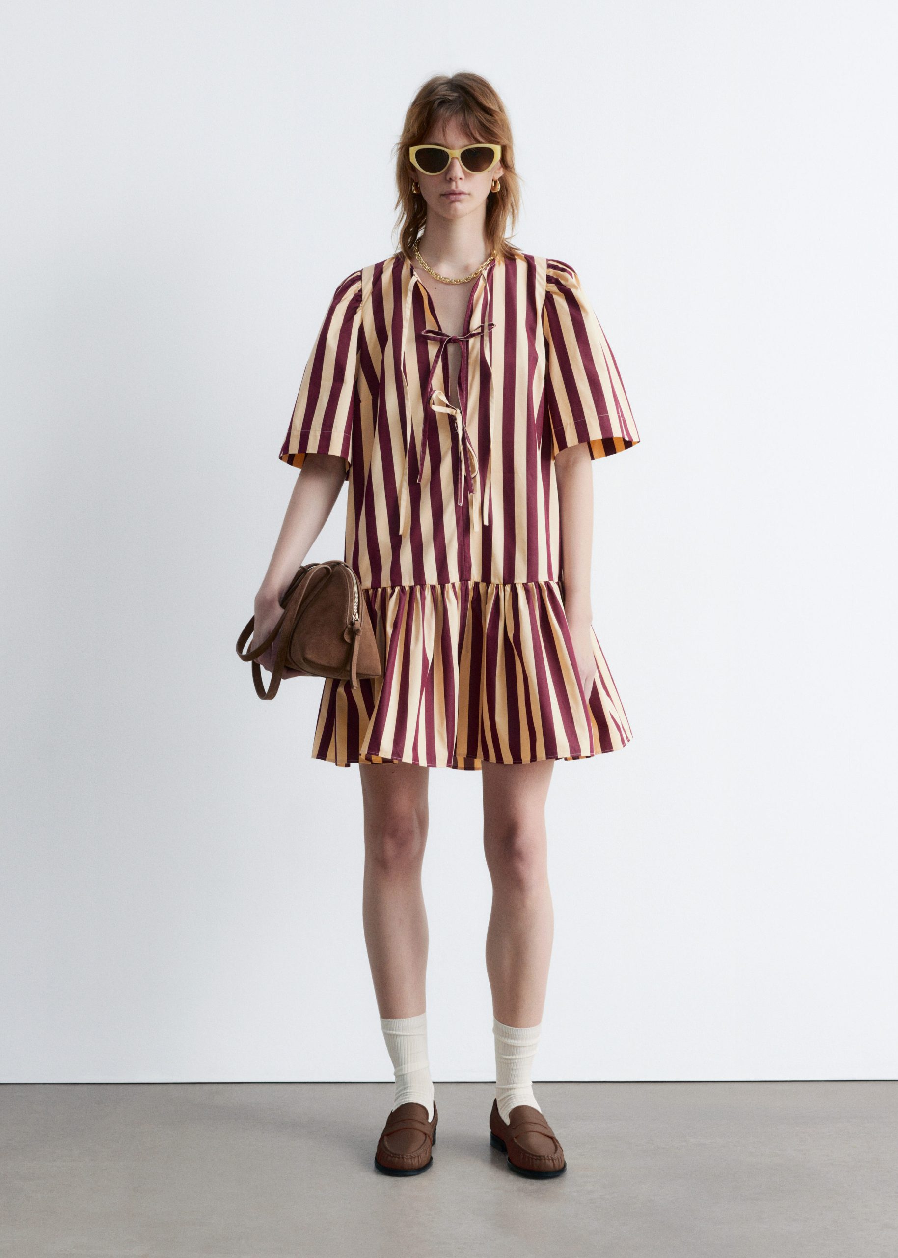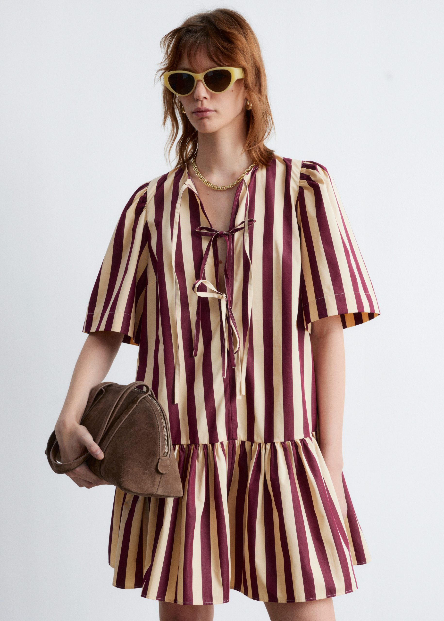 This mini dress is made from cotton poplin, offering a crisp, lightweight feel. Cut in a an A-line silhouette with short, voluminous sleeves, and a frilled peplum hem, adding movement and a playful, feminine touch. Finished with an open neckline secured by three front tie closures.Â