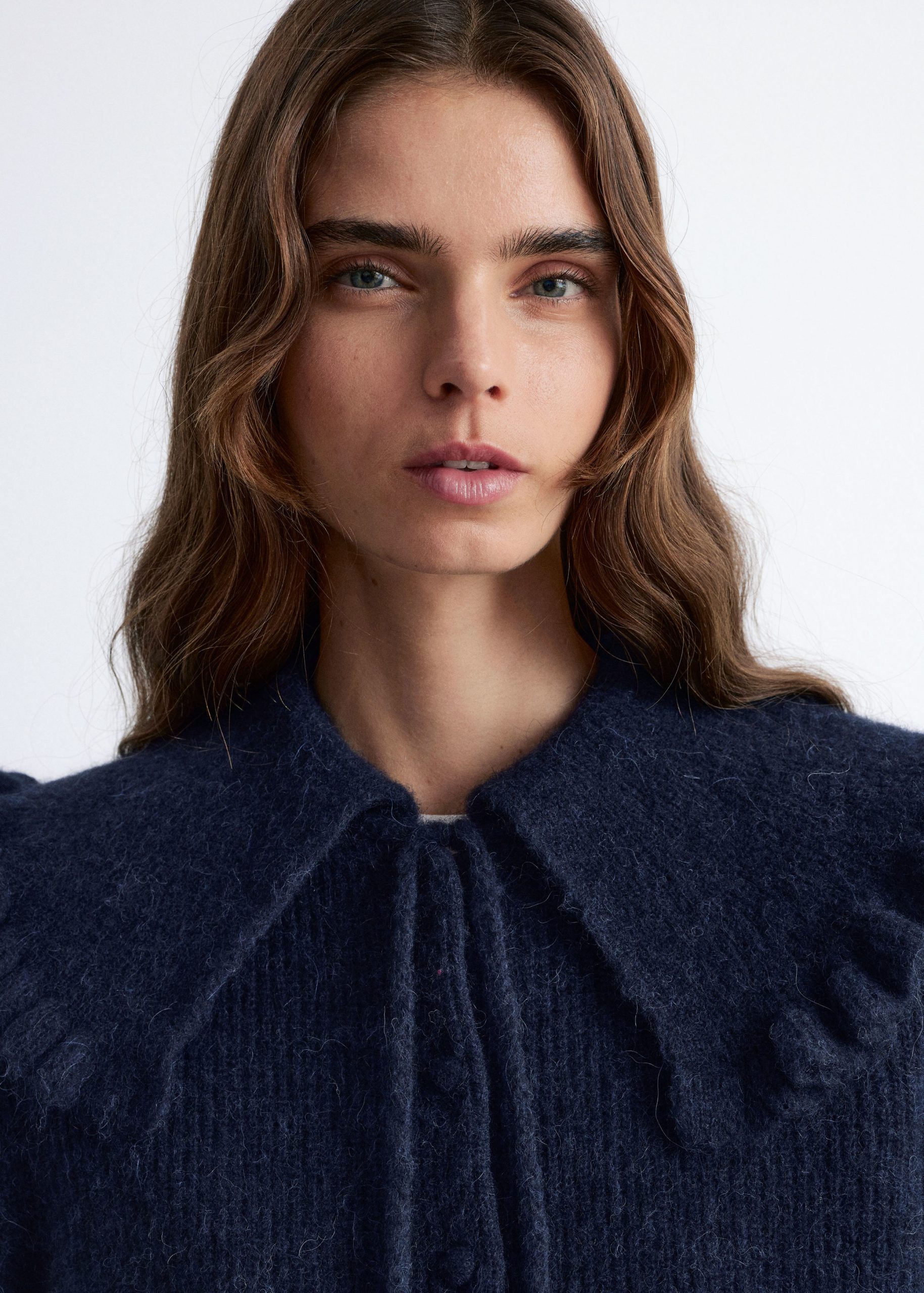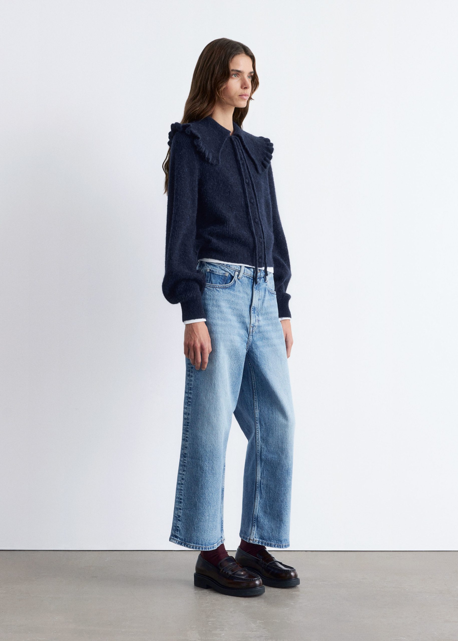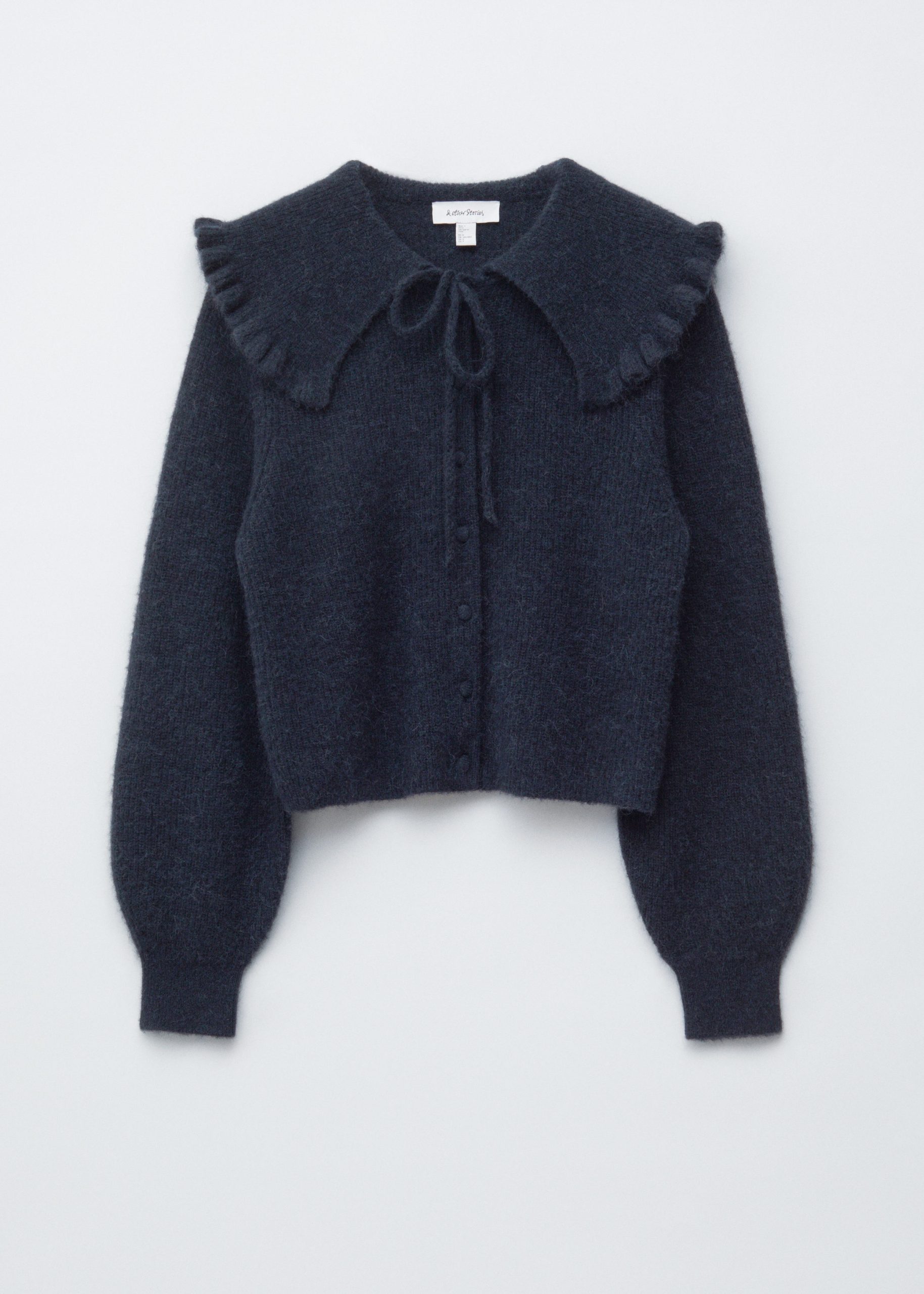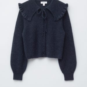 This cardigan is knitted from a soft alpaca and merino wool blend with a brushed, ribbed texture. Designed in a straight, cropped silhouette, it features long balloon sleeves and a statement Peter Pan collar with a frilled edge, secured by tie closures. Finished with tonal knitted buttons down the front.