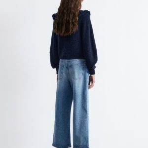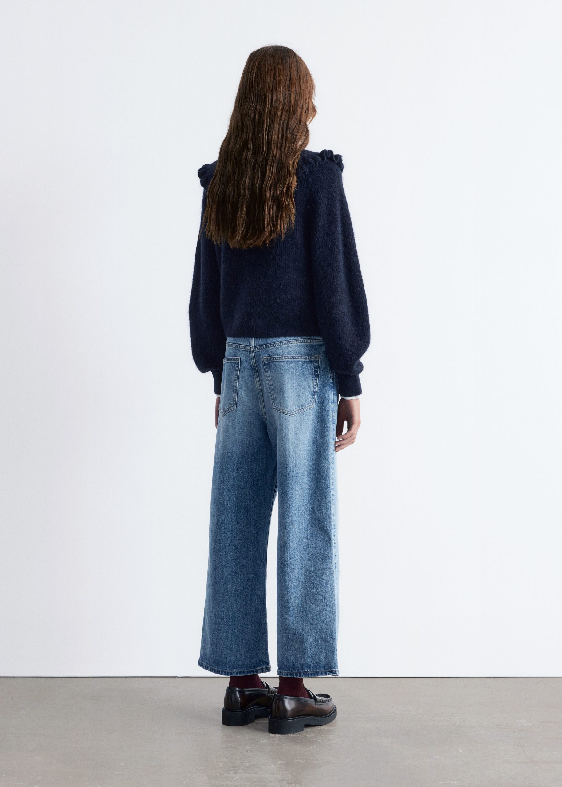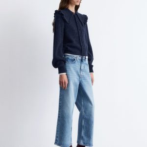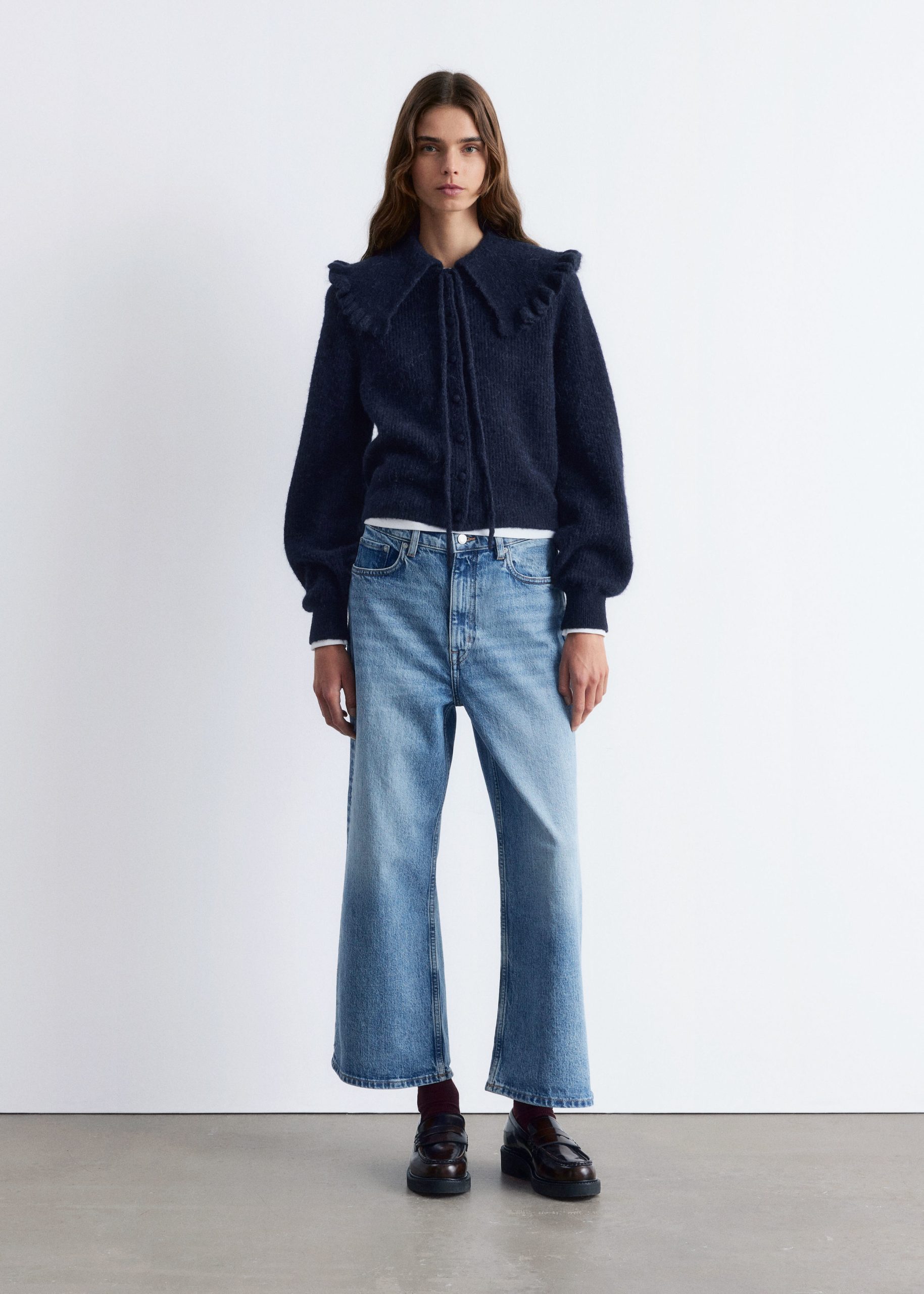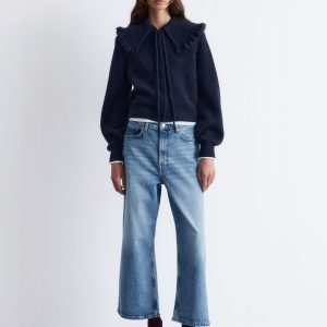 This cardigan is knitted from a soft alpaca and merino wool blend with a brushed, ribbed texture. Designed in a straight, cropped silhouette, it features long balloon sleeves and a statement Peter Pan collar with a frilled edge, secured by tie closures. Finished with tonal knitted buttons down the front.