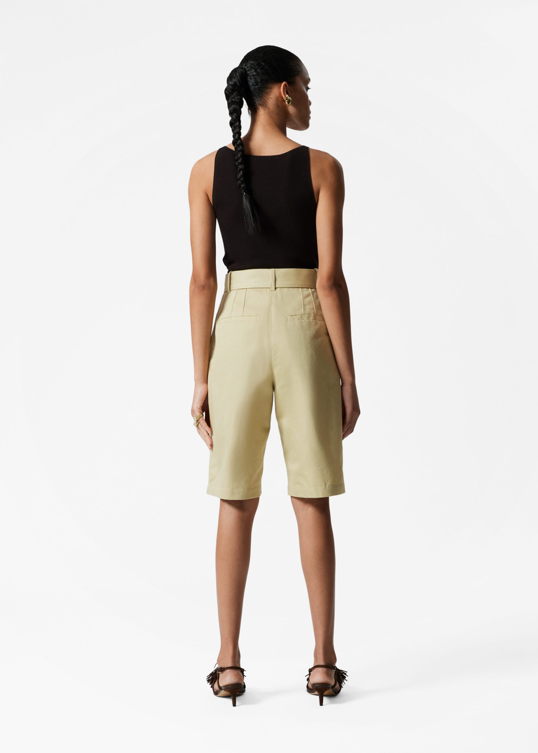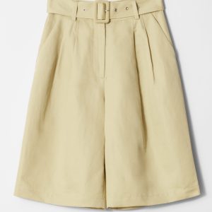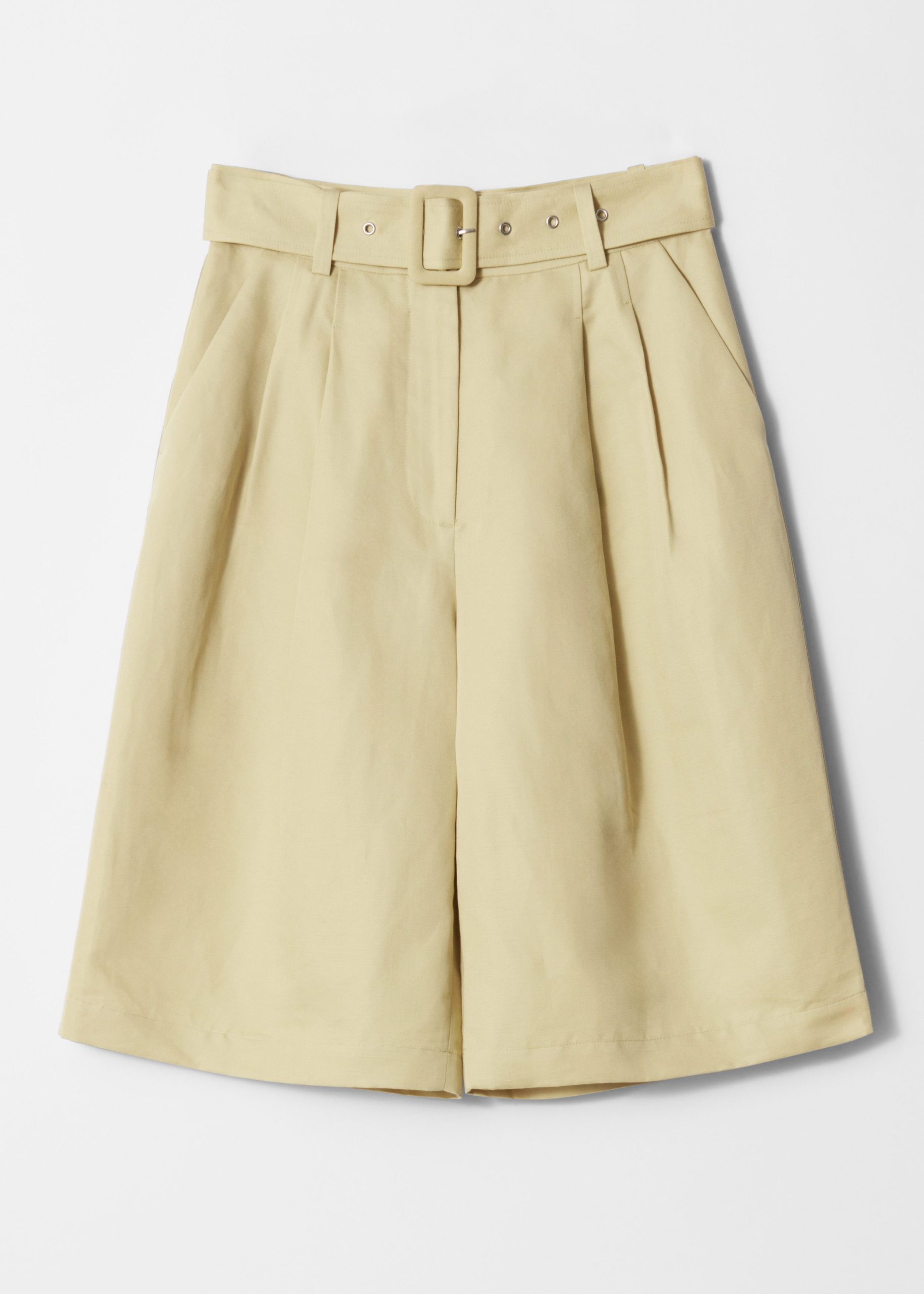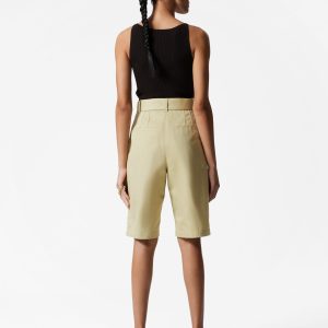 High-waisted Bermuda shorts designed with sharp press-creases, and a wide eyelet belt. Featuring slanted side seam pockets and duo welt pockets at the back.