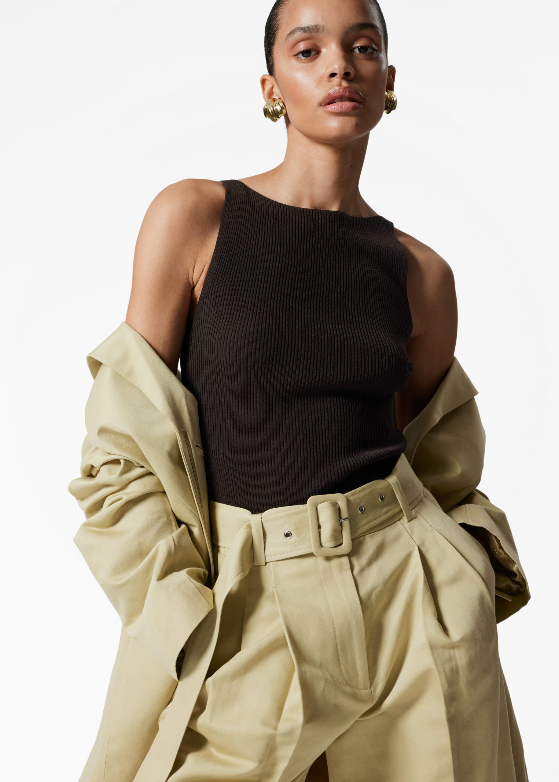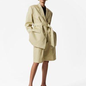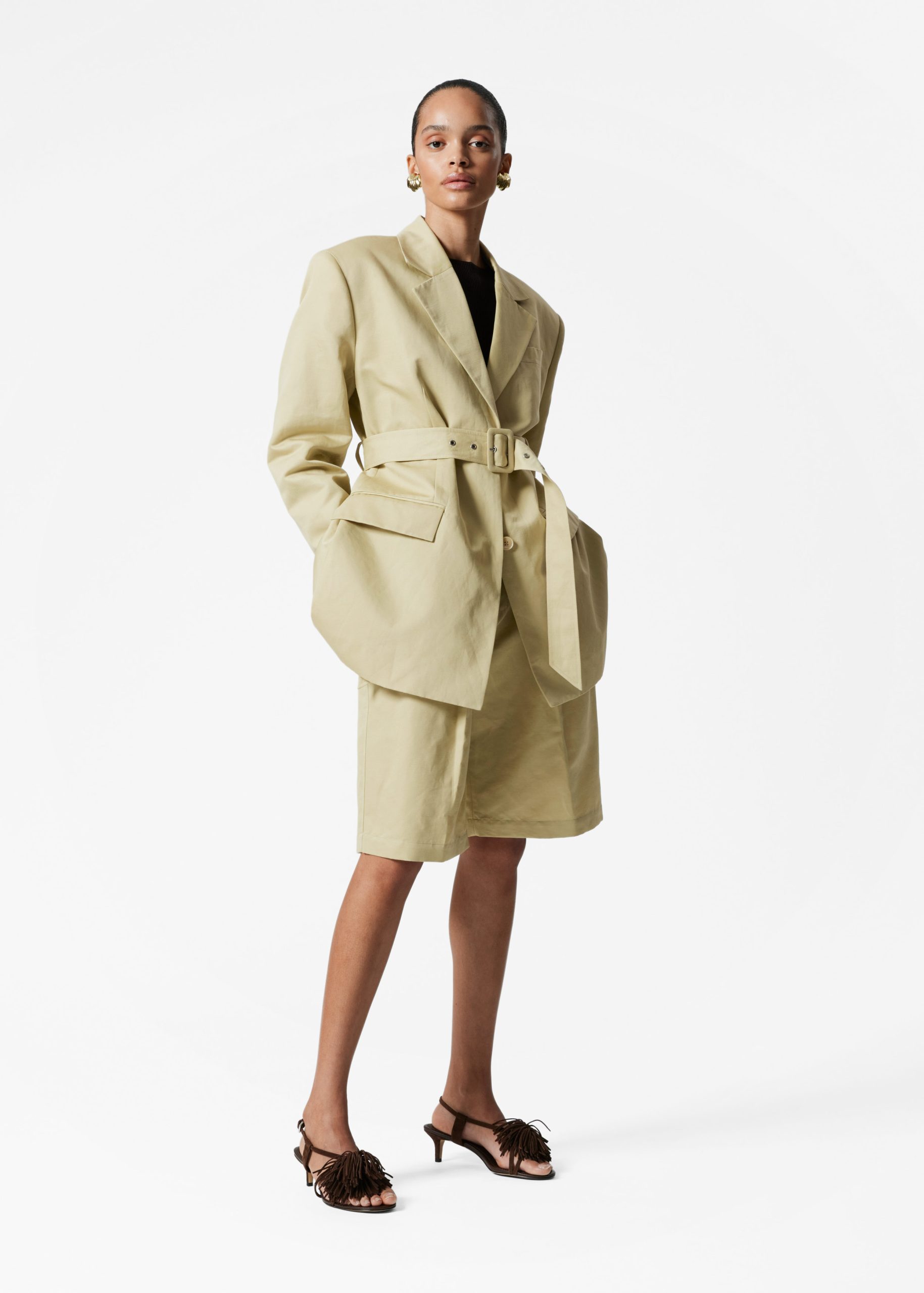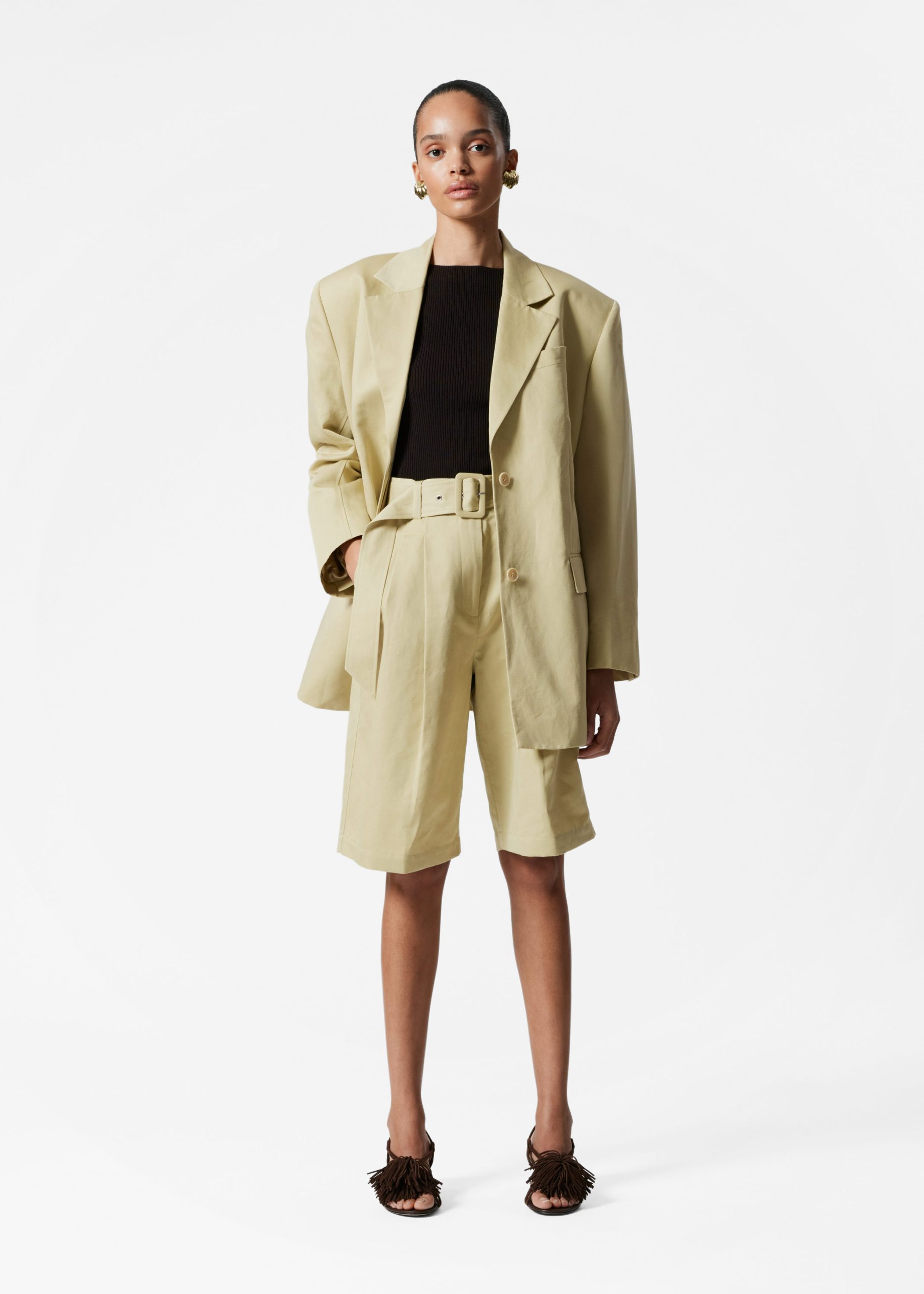 High-waisted Bermuda shorts designed with sharp press-creases, and a wide eyelet belt. Featuring slanted side seam pockets and duo welt pockets at the back.