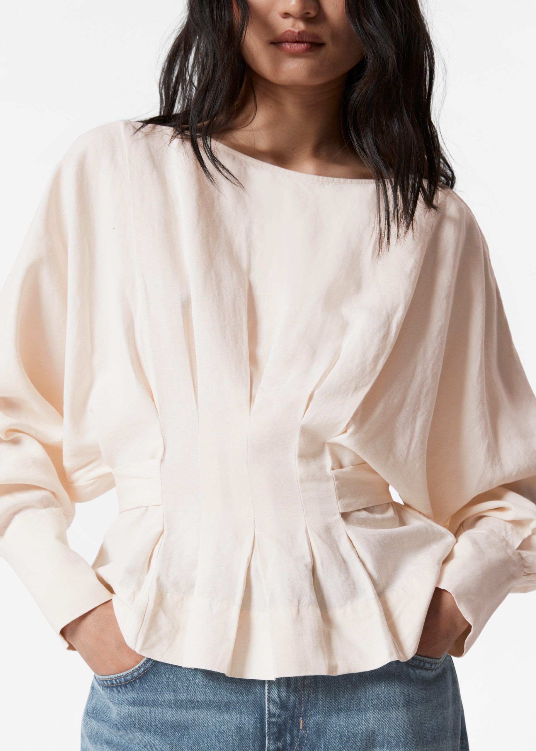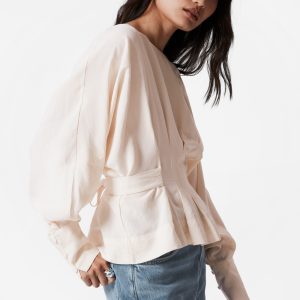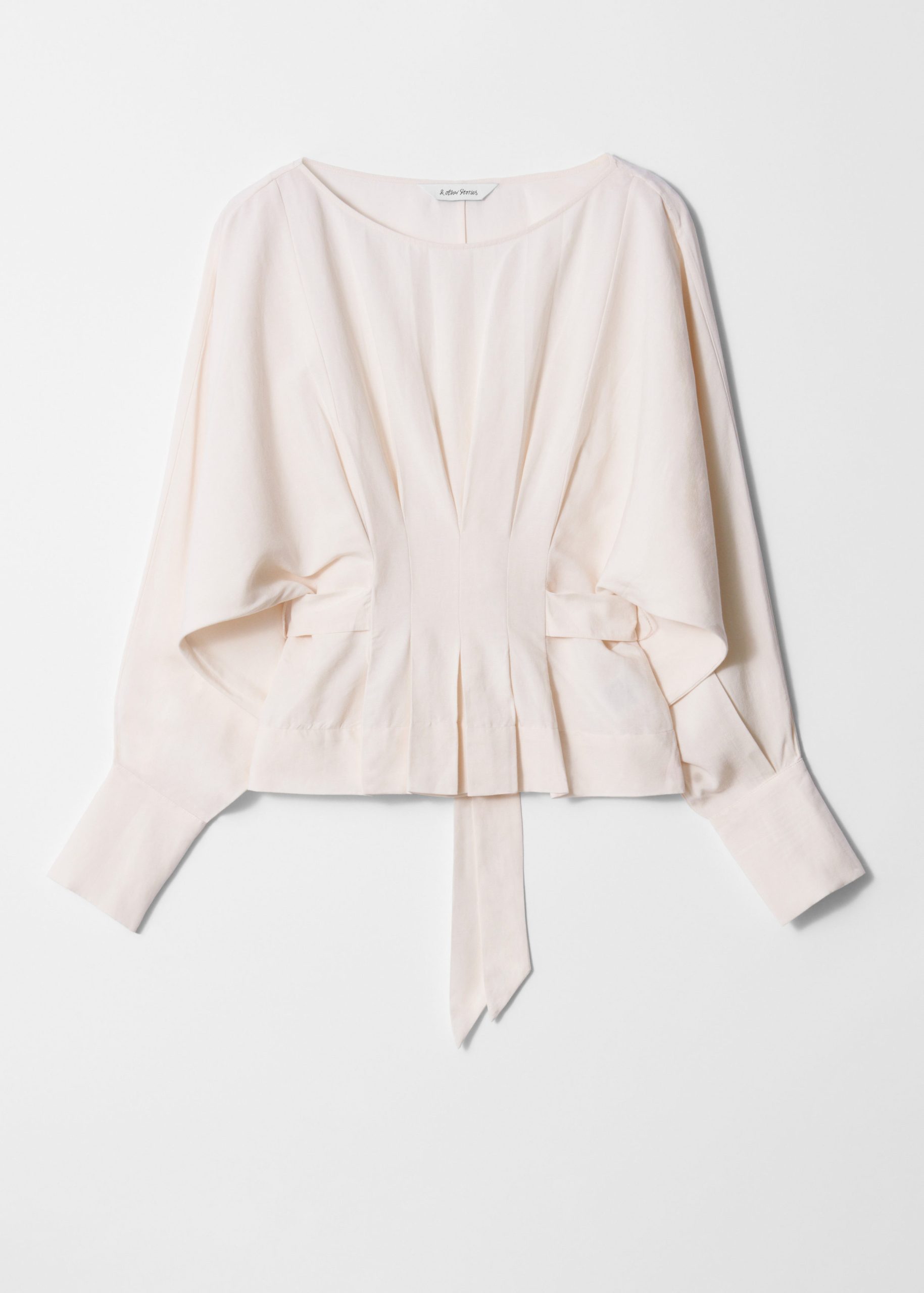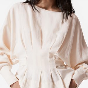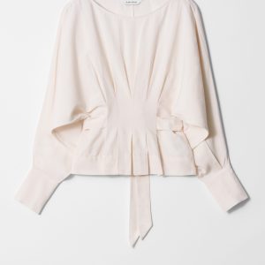 Boatneck blouse designed with decorative pleat detailing that falls into a fitted peplum waist with a self-tie closure at the back. Featuring long, voluminous sleeves with wide cuffs traced with buttons.