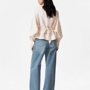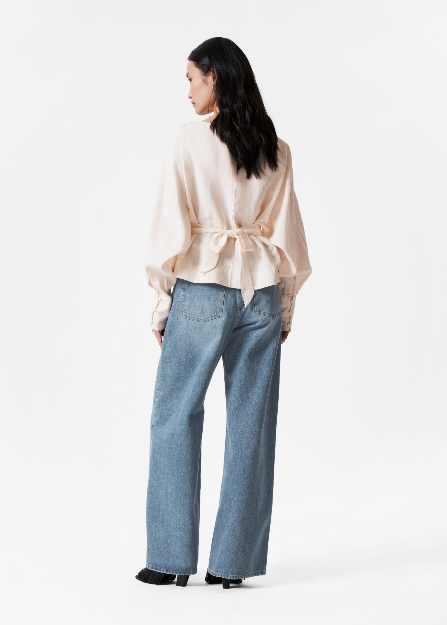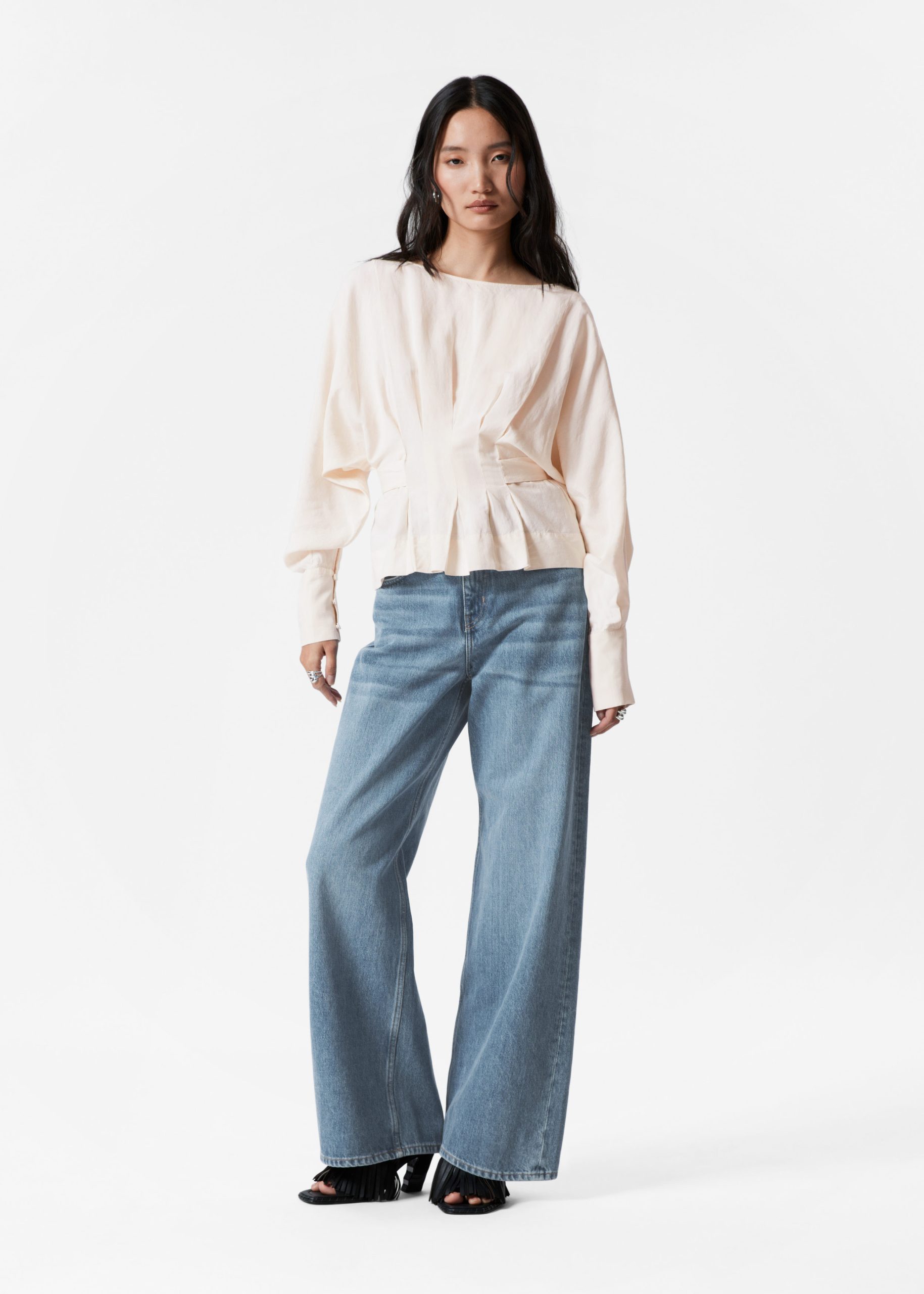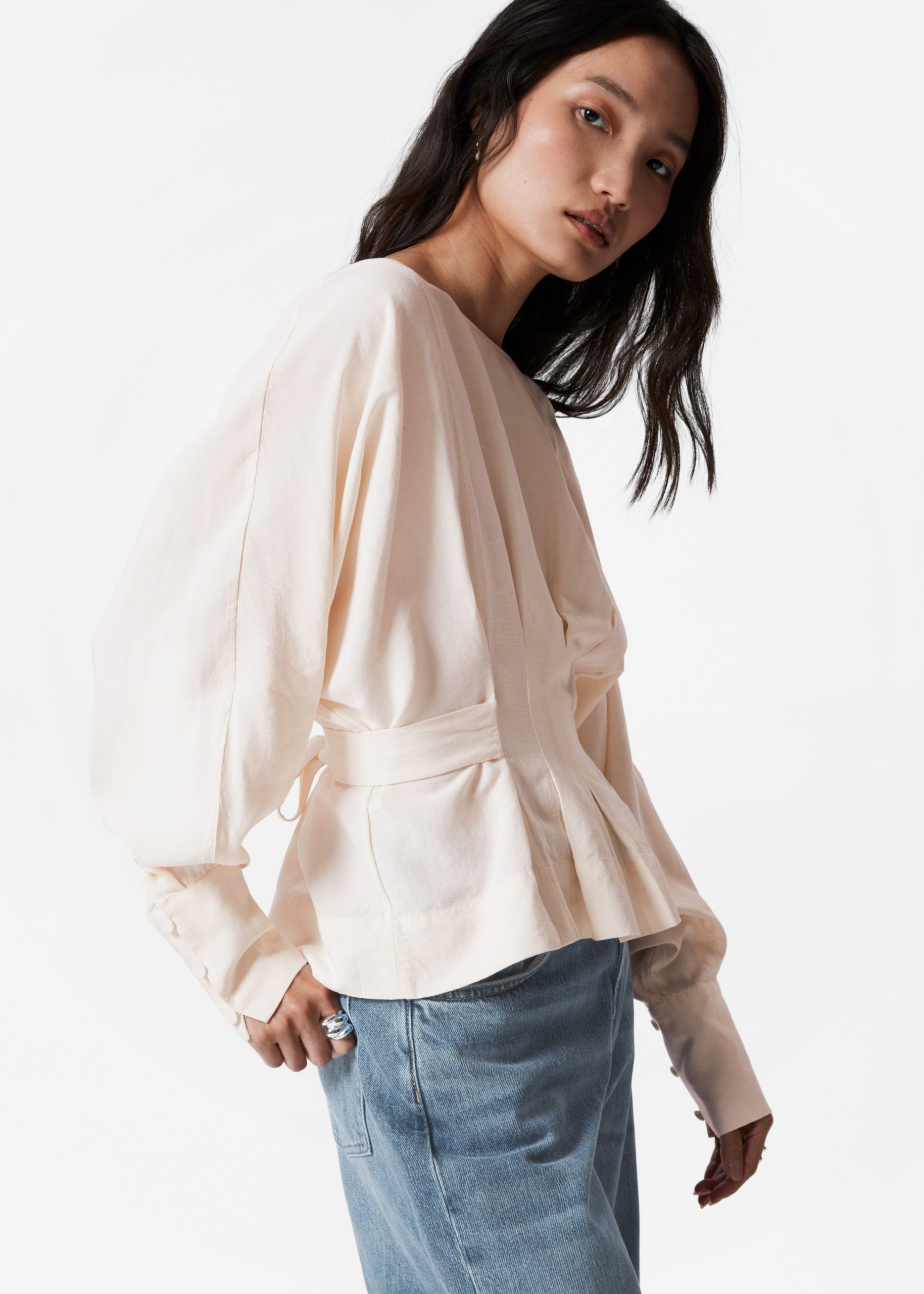 Boatneck blouse designed with decorative pleat detailing that falls into a fitted peplum waist with a self-tie closure at the back. Featuring long, voluminous sleeves with wide cuffs traced with buttons.