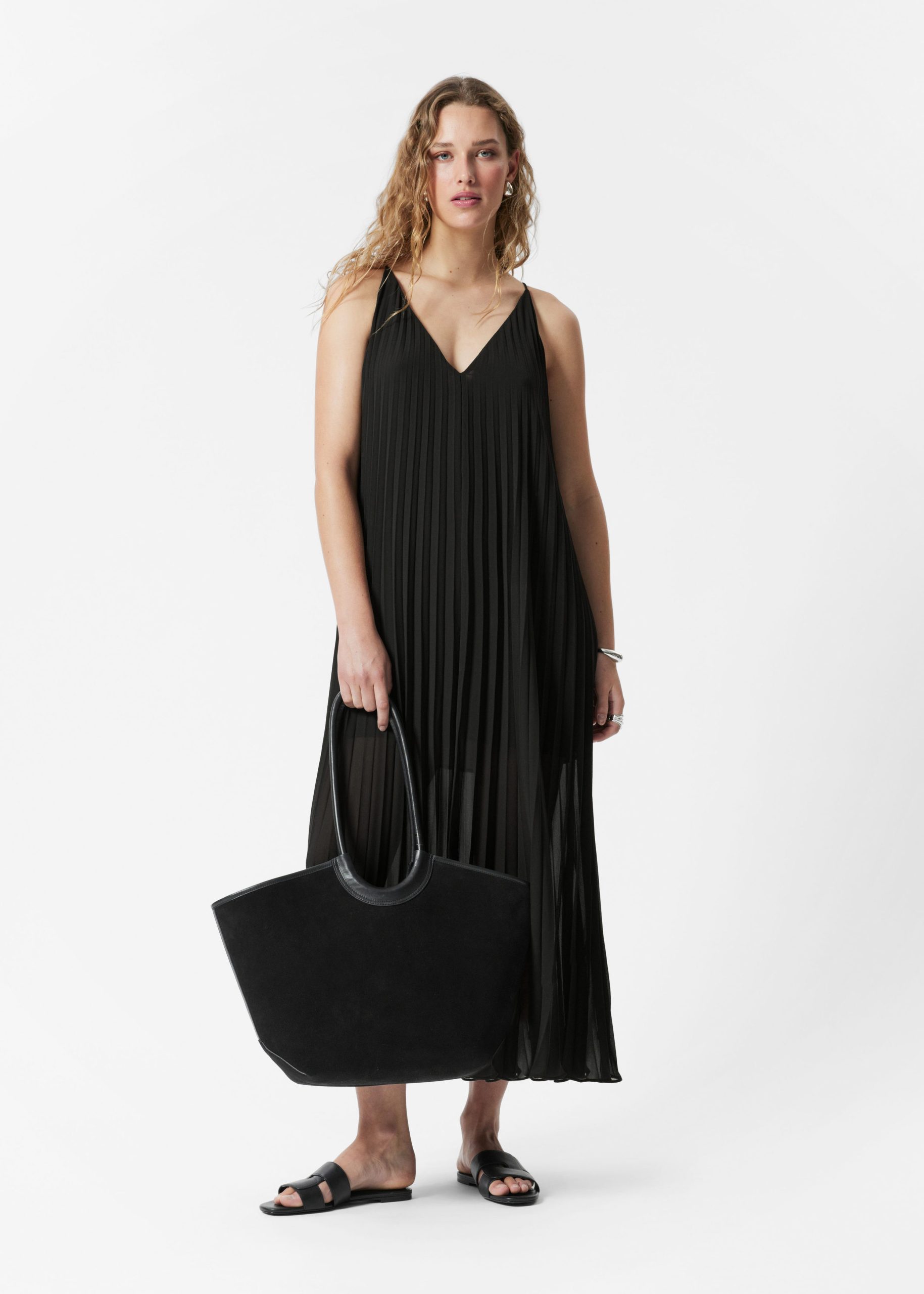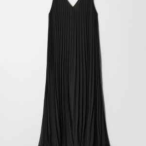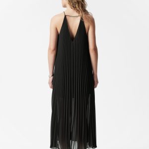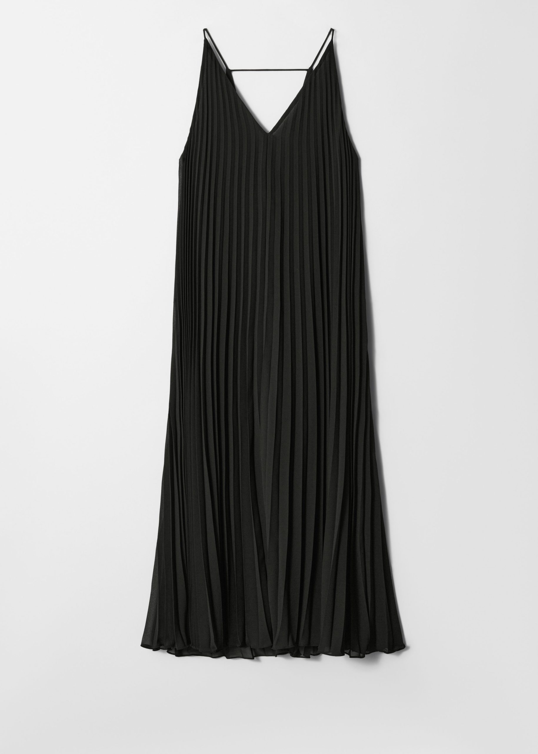Maxi dress crafted from an airy chiffon fabric. Designed in a flowy, A-line silhouette with thin shoulder straps and allover decorative pleats. Featuring a deep v-neck at the front and back, accented by a delicate strap detail at the back.