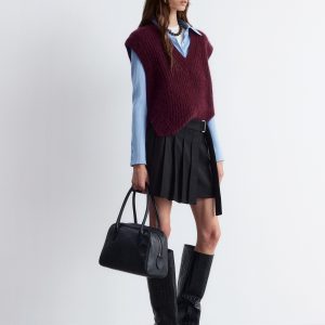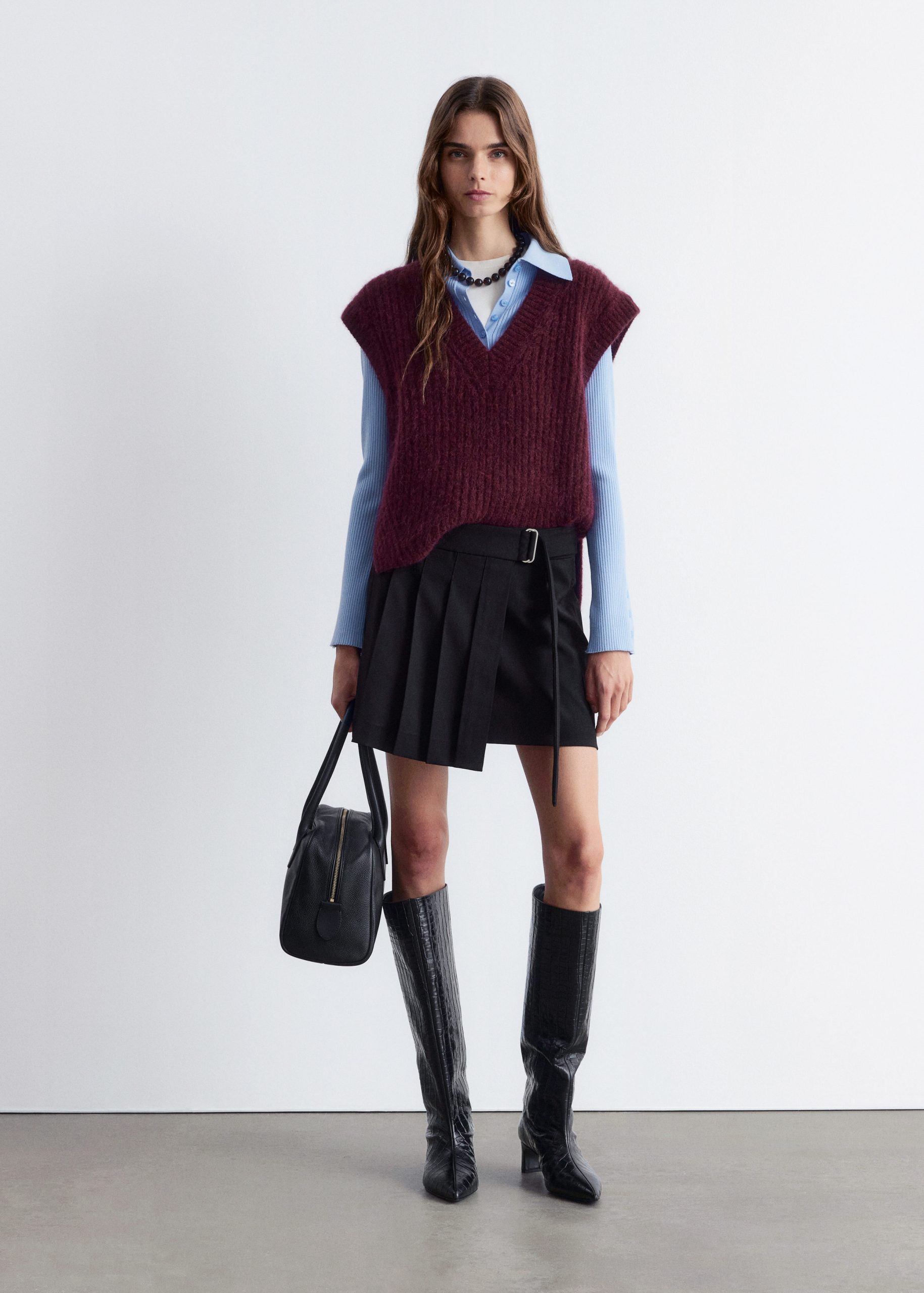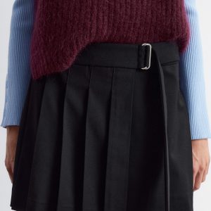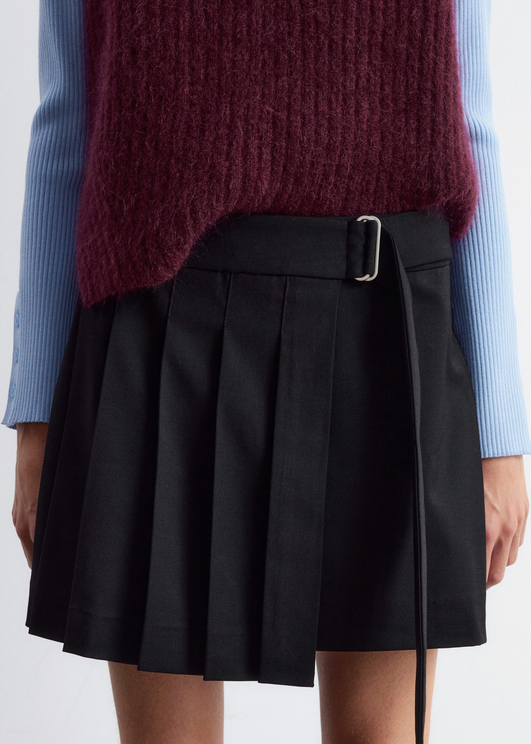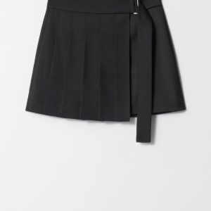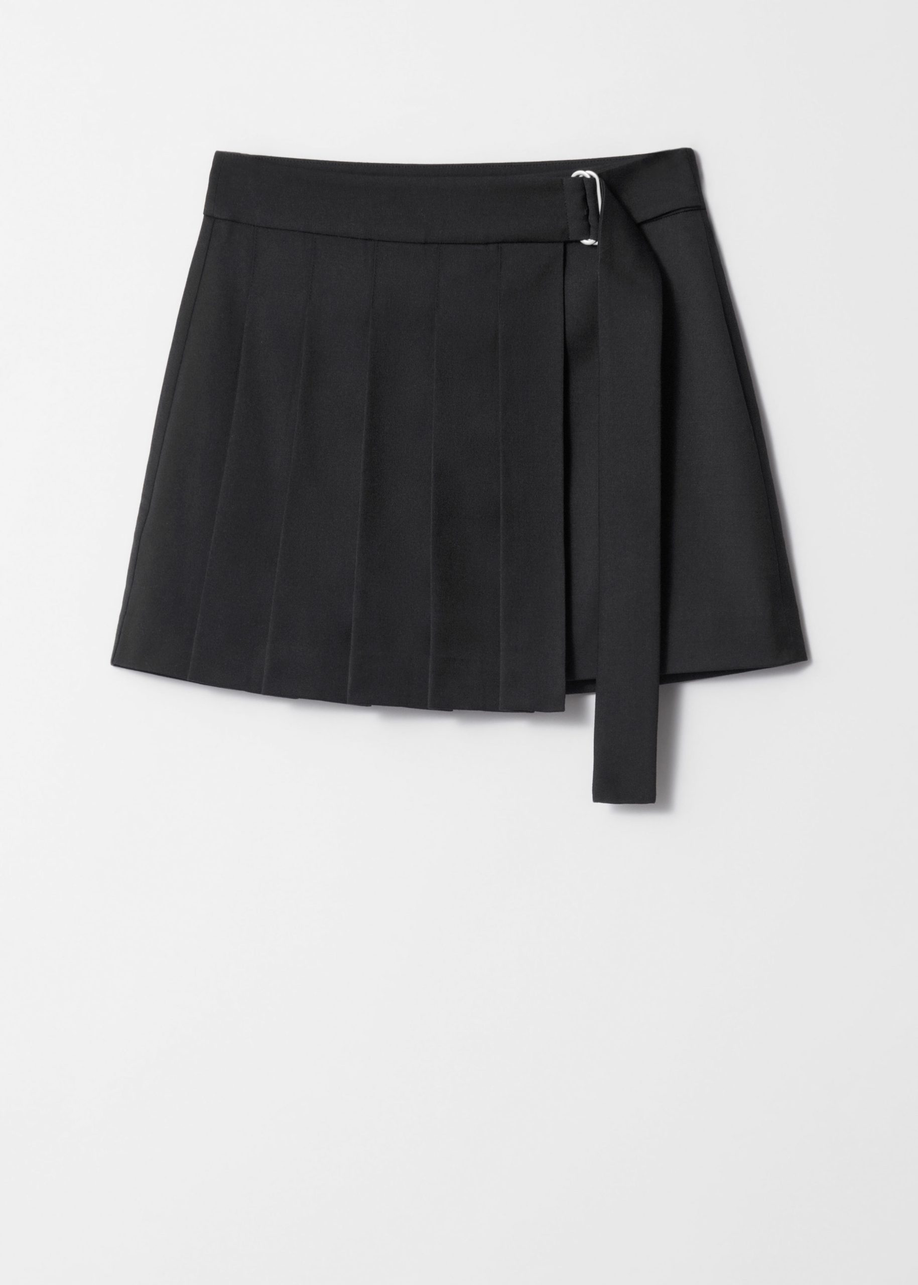 Pleated mini skirt with a slight asymmetric hemline, and a wrap waist featuring a strap tie belt with metallic buckle.