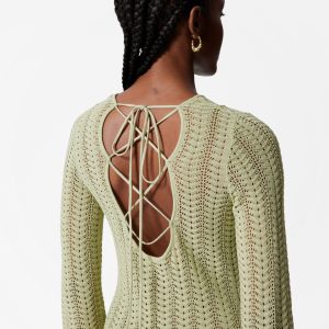 Midi dress knitted in a soft cotton-blend with a delicate pointelle finish. Featuring a round neck, long sleeves with flared cuffs, and a low-cut back adorned with lace-up ties.
