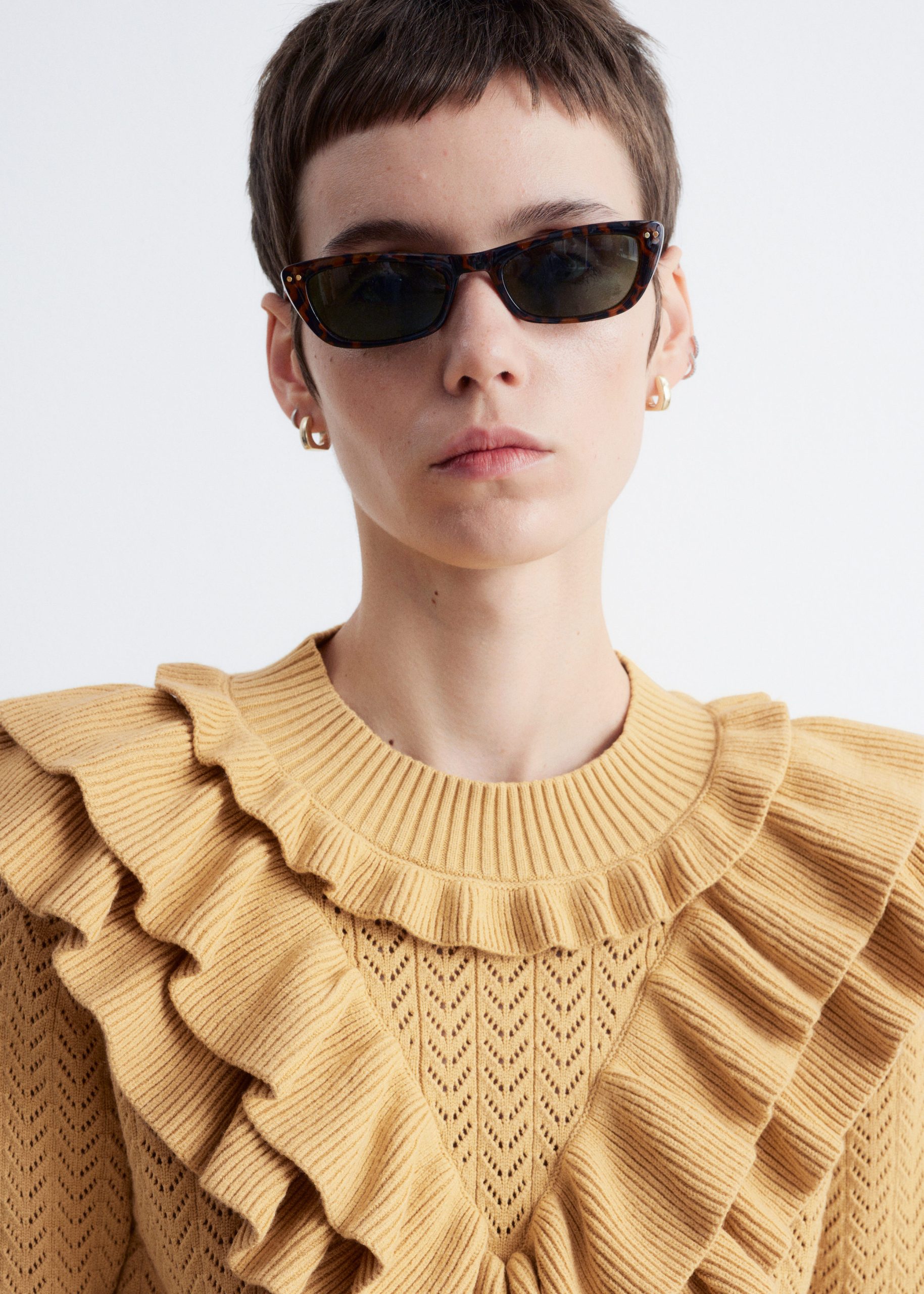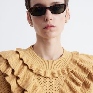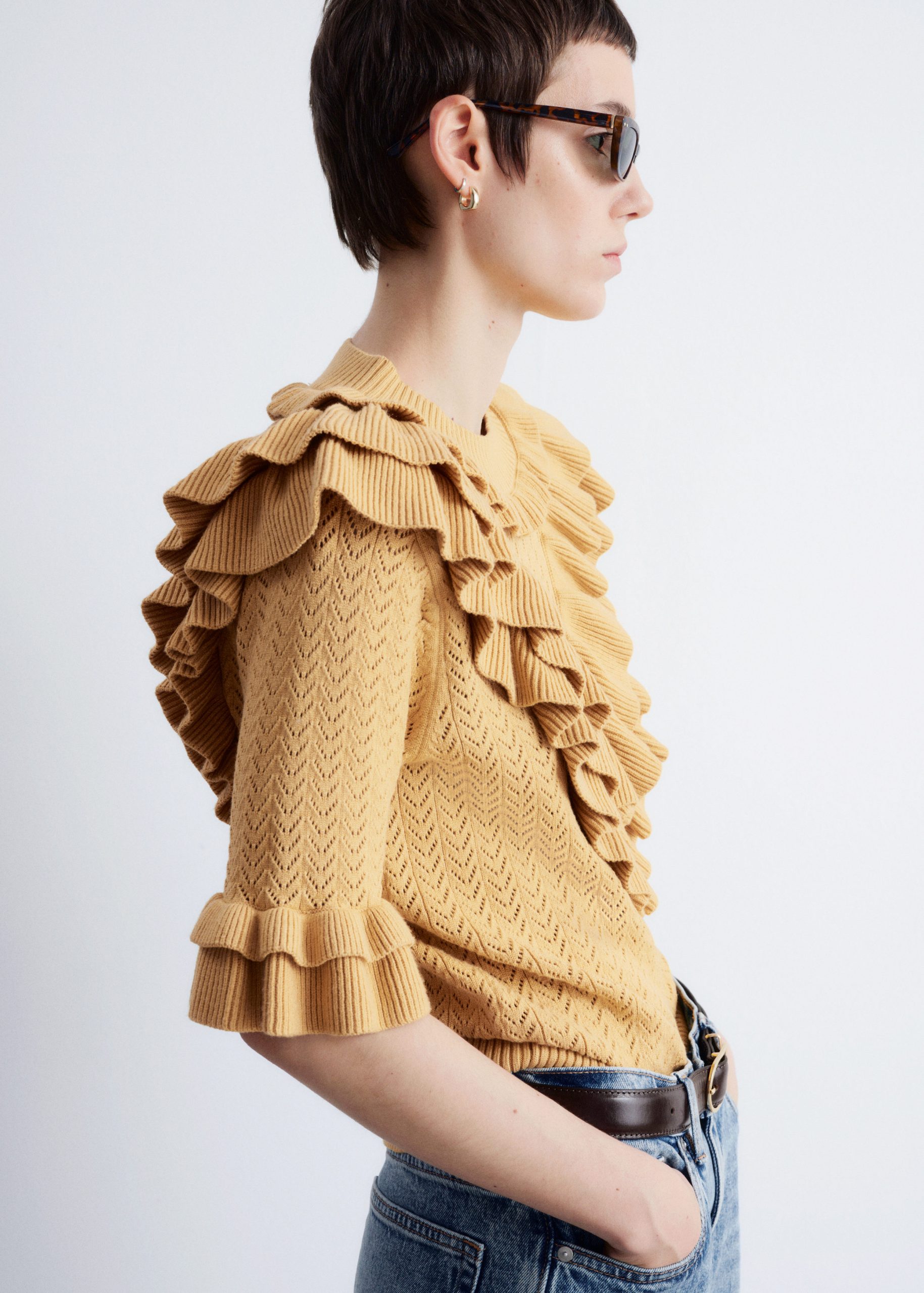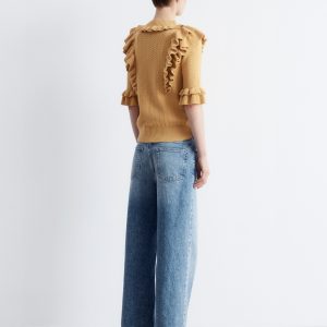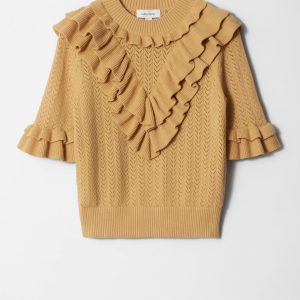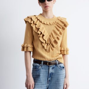 This top is crafted from a soft pointelle-knit fabric. Designed with a round neck, short sleeves, and layered ruffles that trace the neckline, sleeves, and a dramatic v-shaped front panel. Finished with a ribbed neckline and hem. Style with tailored trousers or high-waist denim for contrast.
