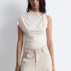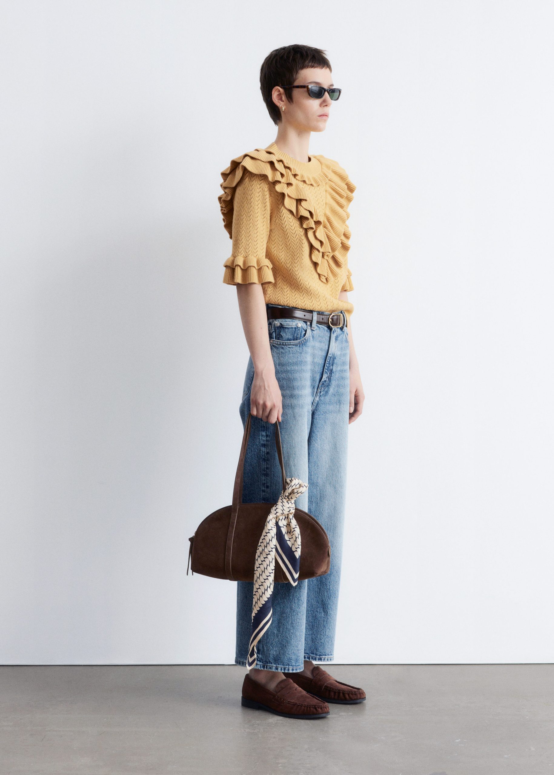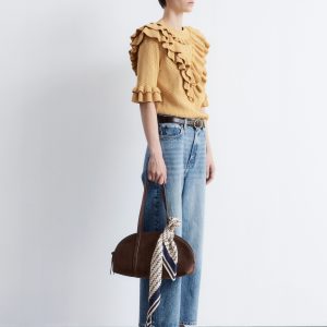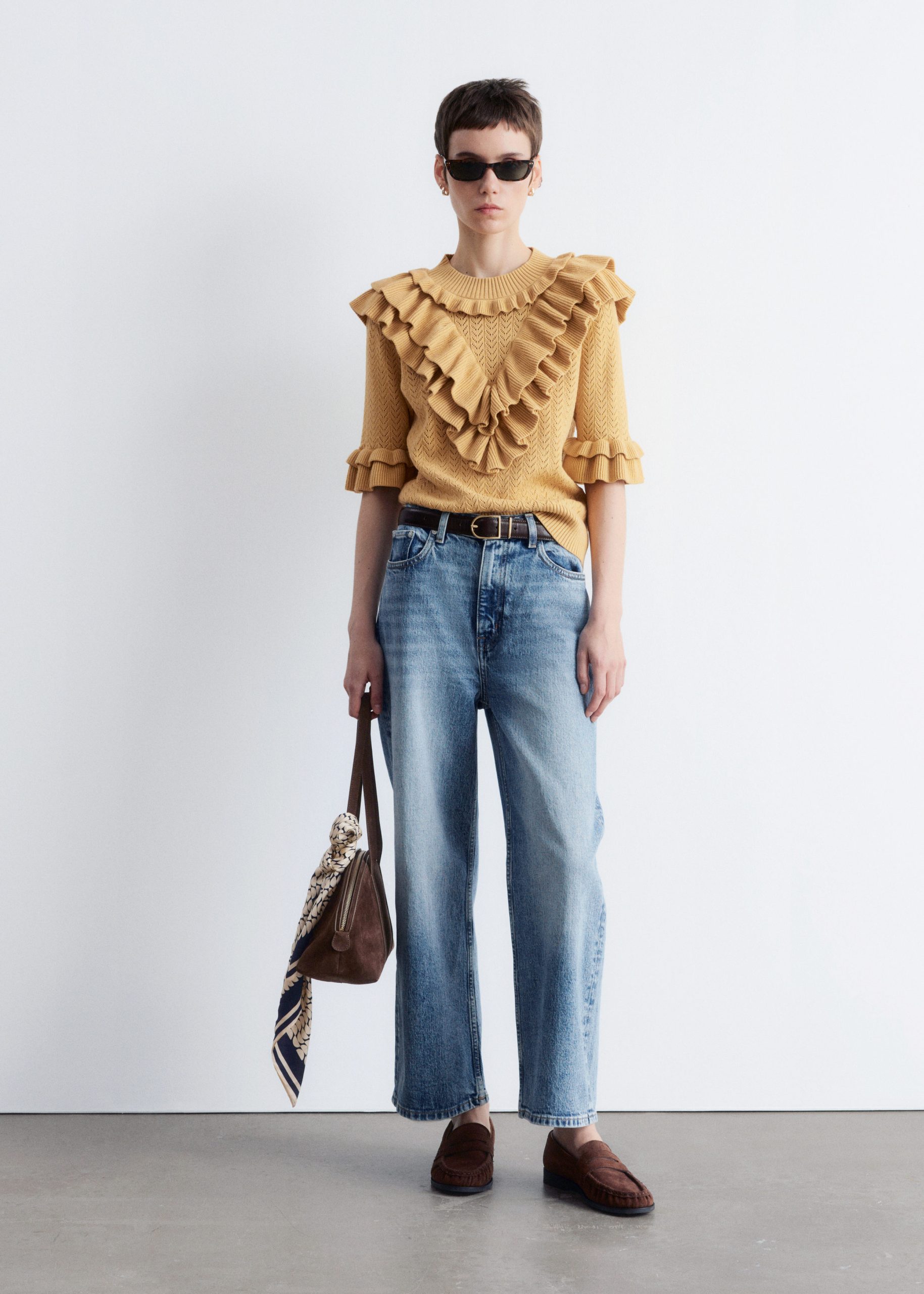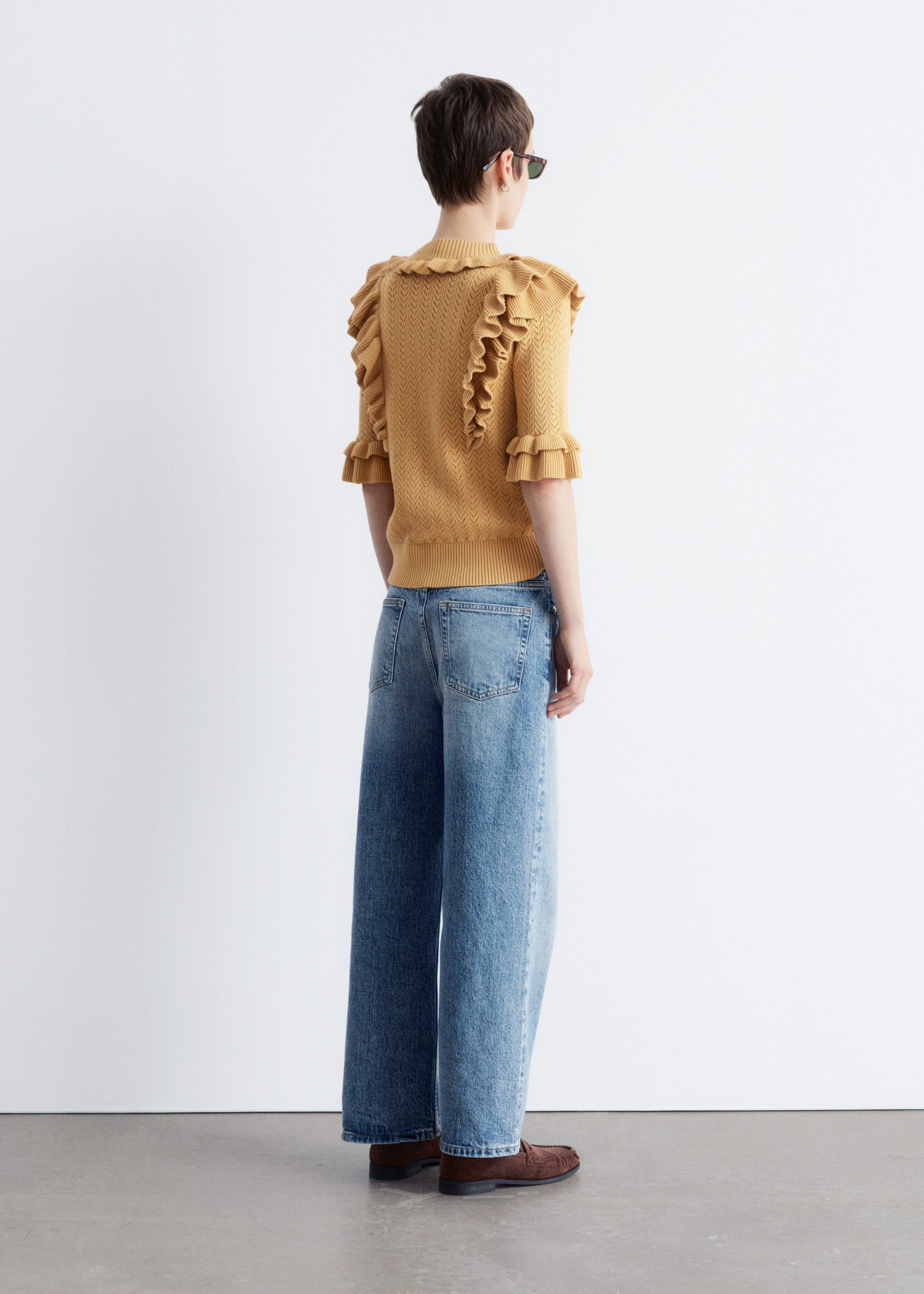 This top is crafted from a soft pointelle-knit fabric. Designed with a round neck, short sleeves, and layered ruffles that trace the neckline, sleeves, and a dramatic v-shaped front panel. Finished with a ribbed neckline and hem. Style with tailored trousers or high-waist denim for contrast.