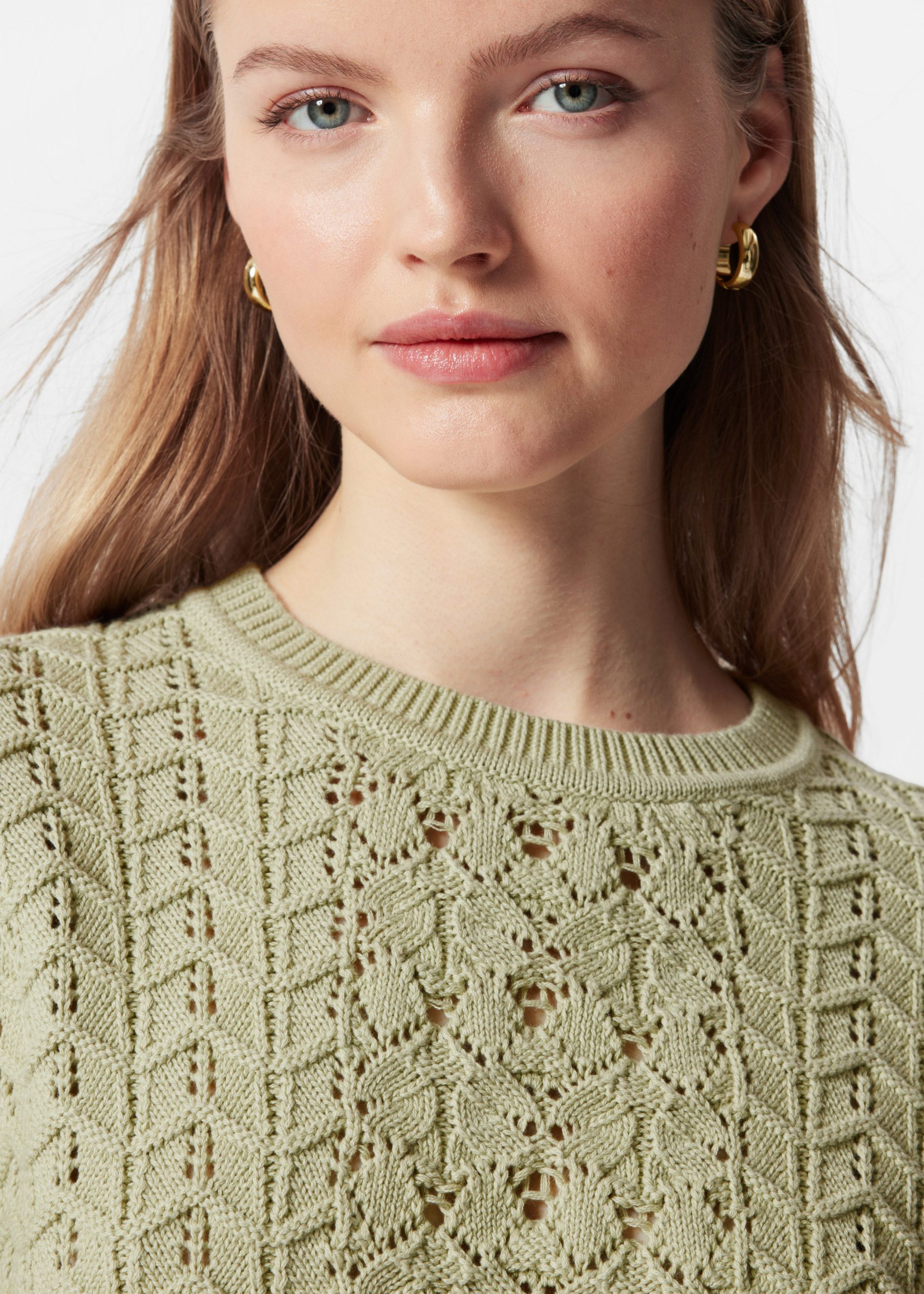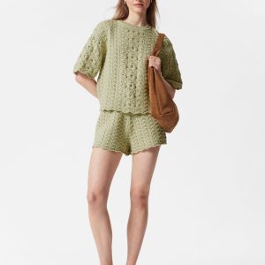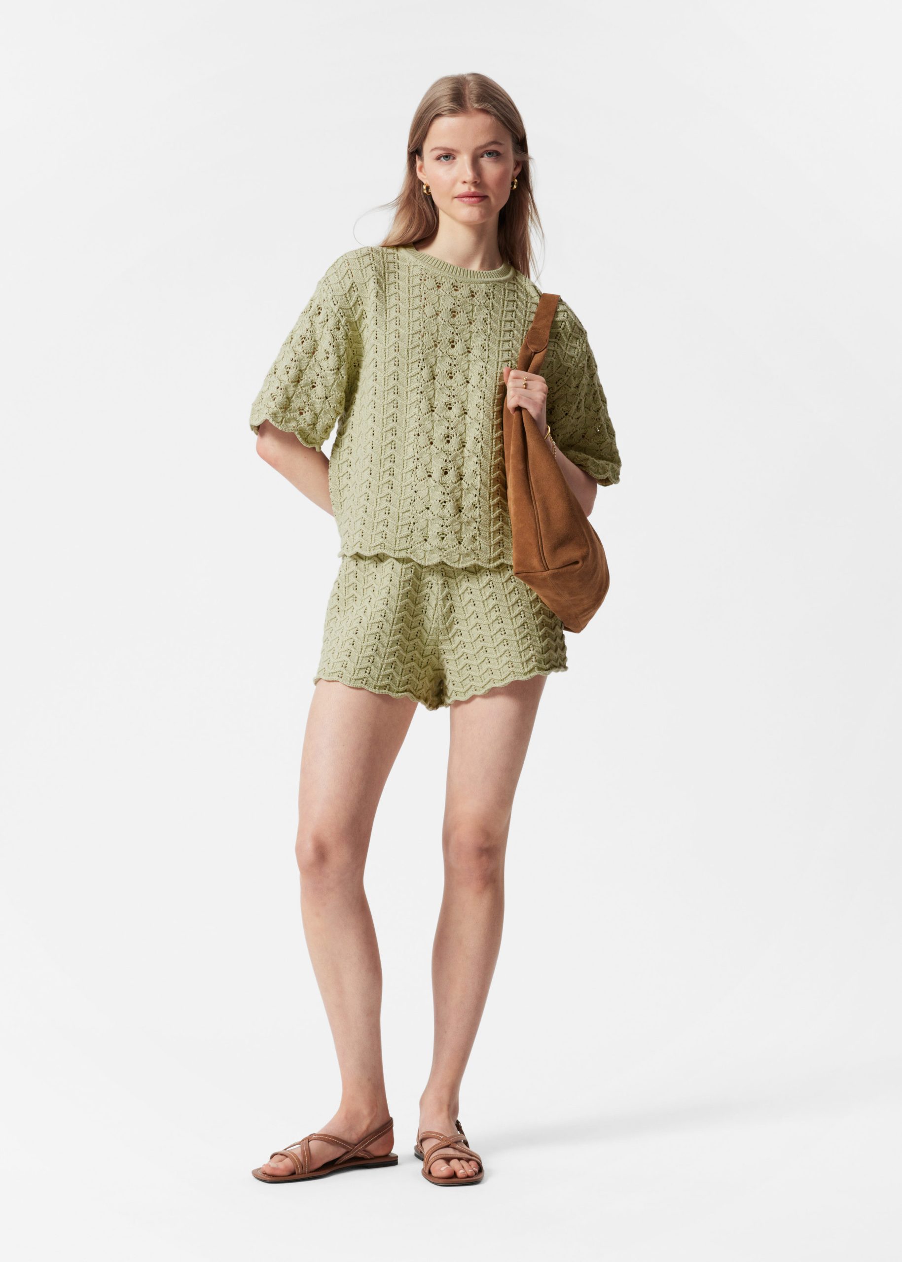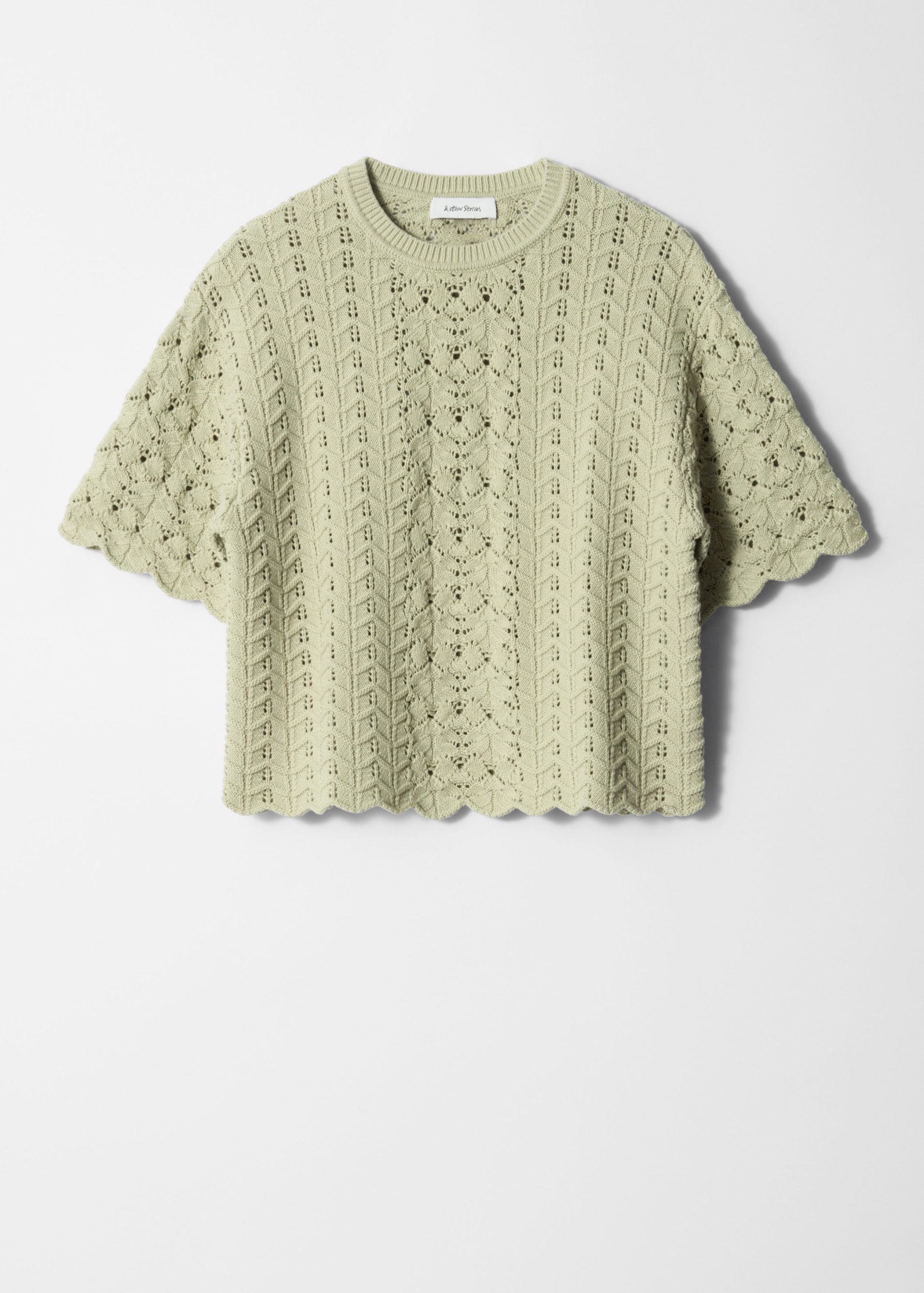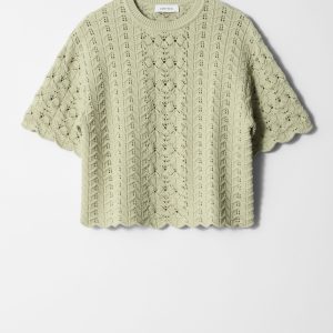 T-shirt crafted from a soft cotton fabric in a pointelle-knit structure. Cut in a classic, straight silhouette featuring a ribbed neckline and decorative scalloped edges. Pair with the matching pointelle-knit shorts for an effortless co-ord look.