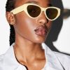 These sunglasses feature oval, retro-inspired cat-eye frames that widen towards the sides, seamlessly blending into bold, wide temples. Crafted from acetate and fitted with tonal polarized lenses, they offer stylish protection against the sun’s rays.