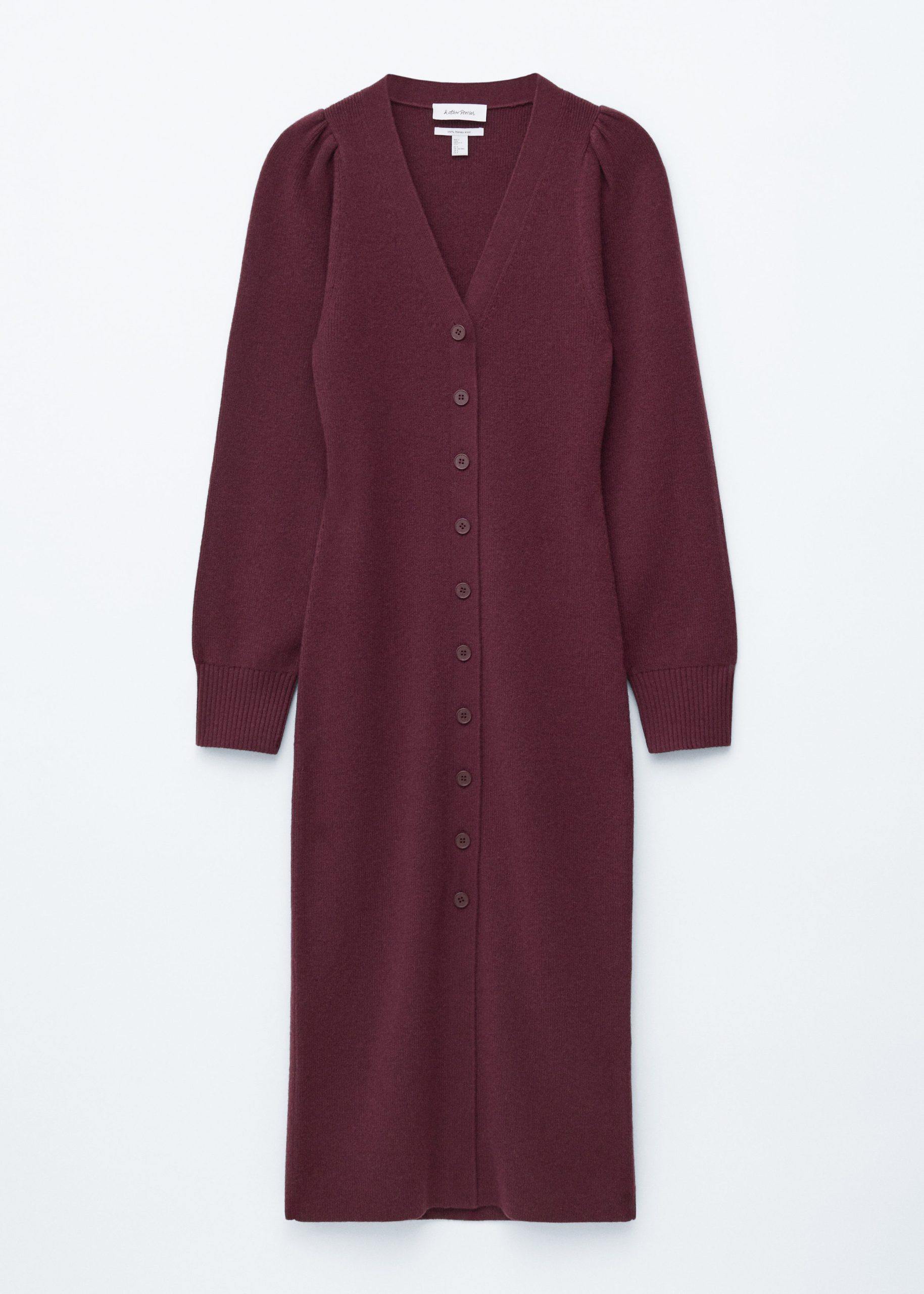 This maxi dress is knitted from 100% wool for a warm, soft-hand feel. Cut in a slim-fit silhouette, it features long puff-sleeves with ribbed cuffs and a deep v-neckline. Traced with buttons down the front.