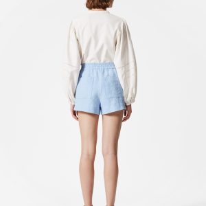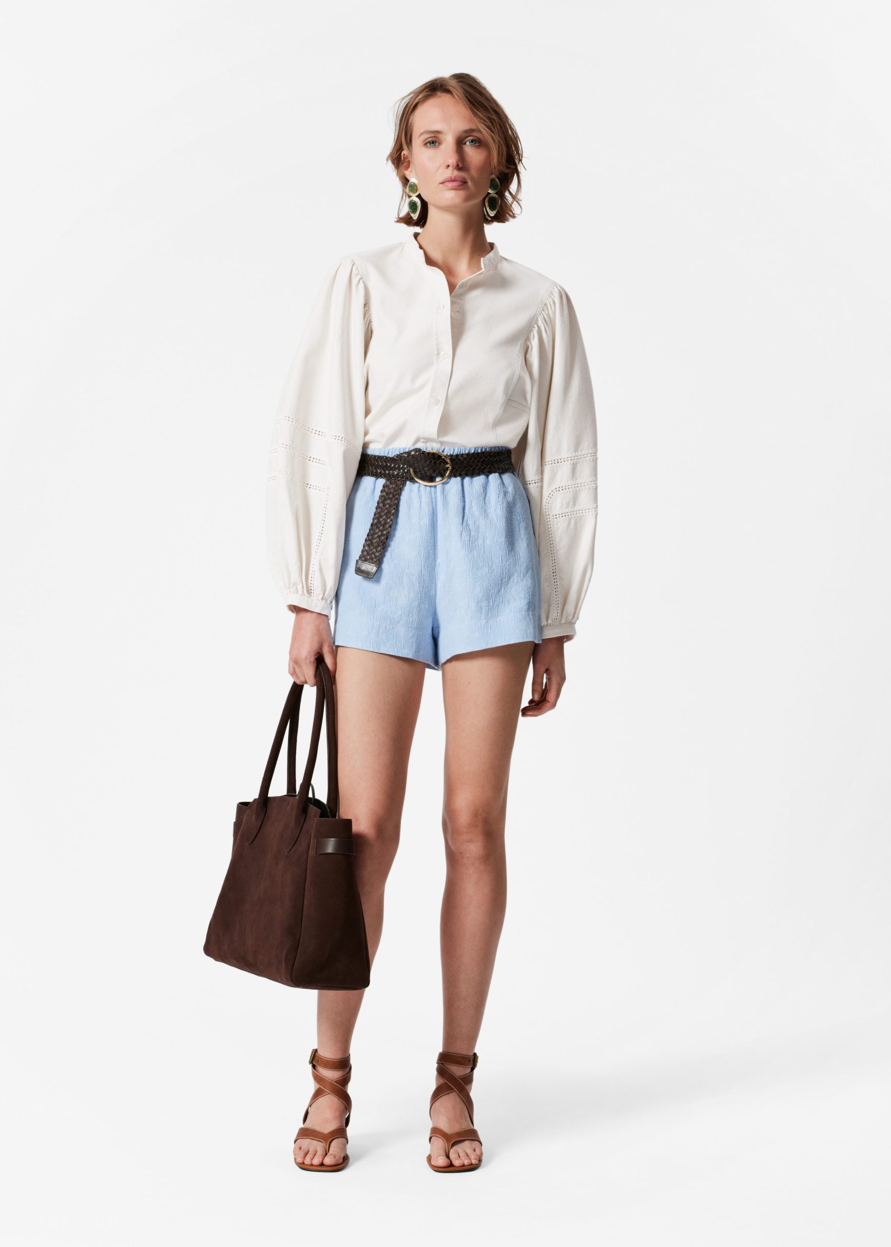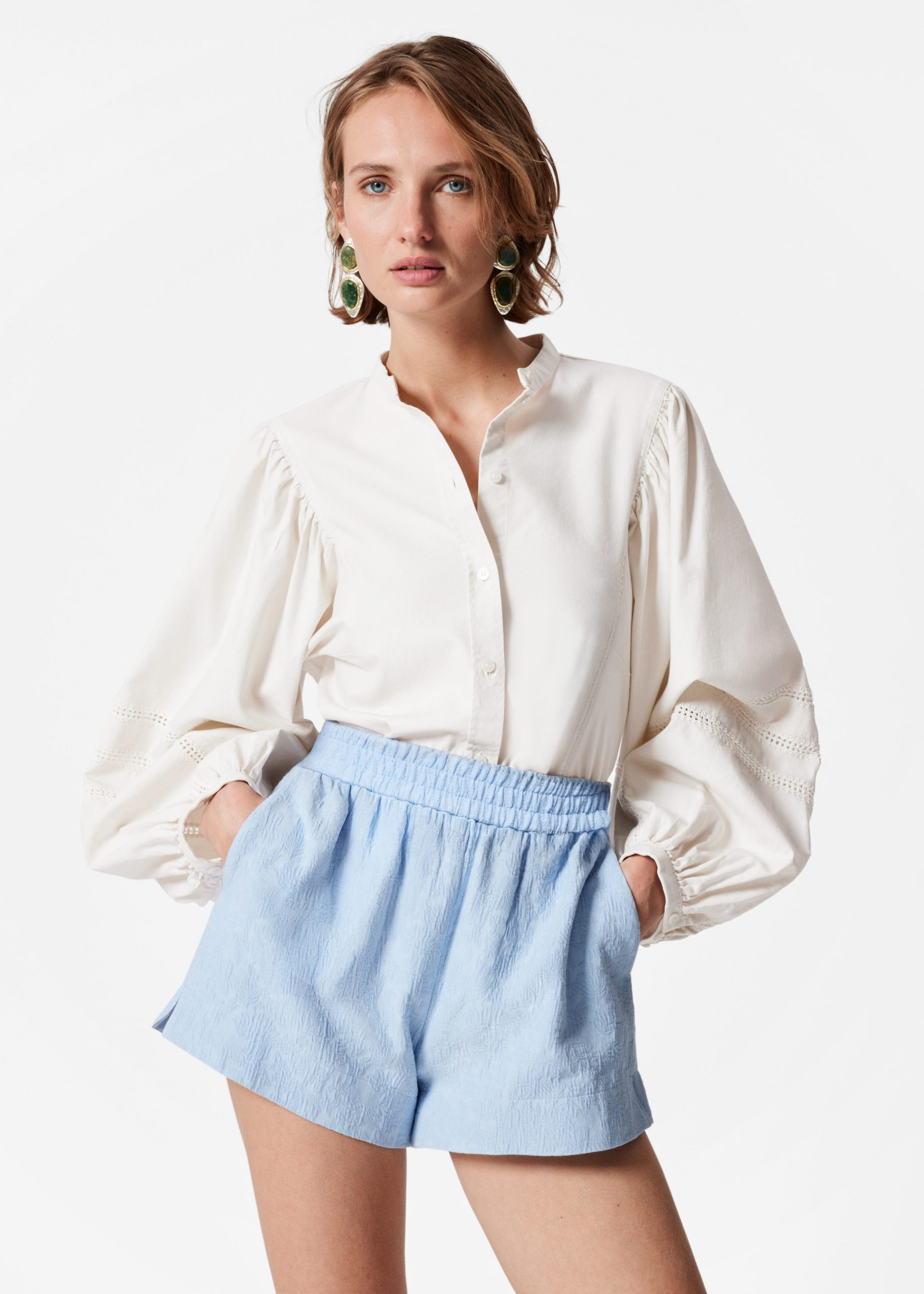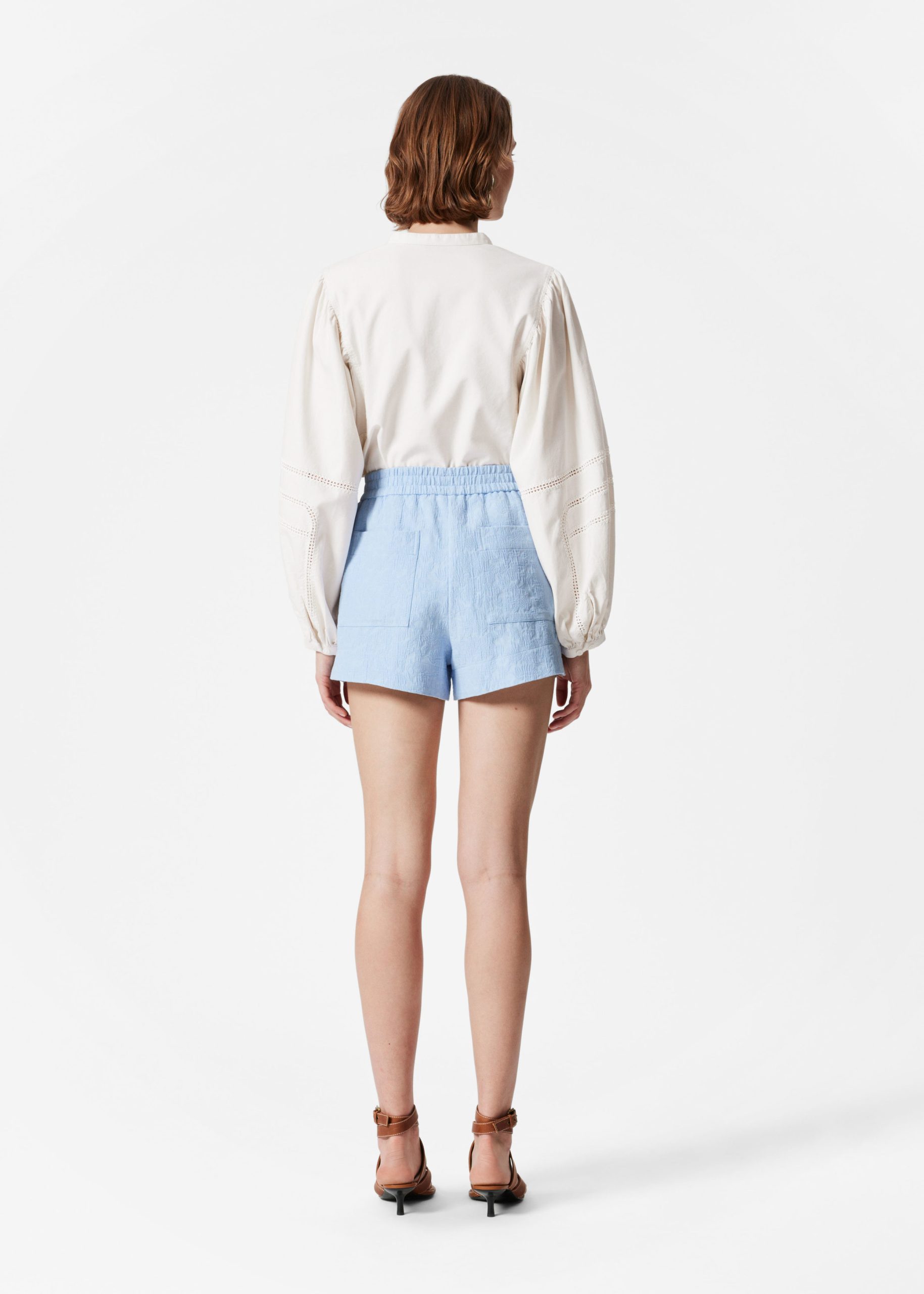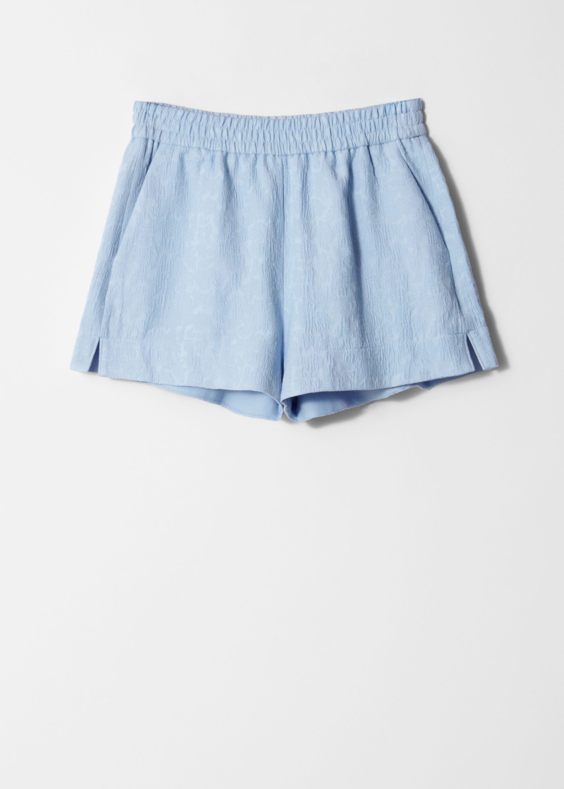 Shorts crafted from a cotton-blend with a textured jacquard finish. Designed in a relaxed silhouette with a high waist featuring a smocked, elastic waistband for an easy pull-on effect. Finished with subtle side slits at the hem, slash pockets in the side seams, and dual patch pockets at the back.