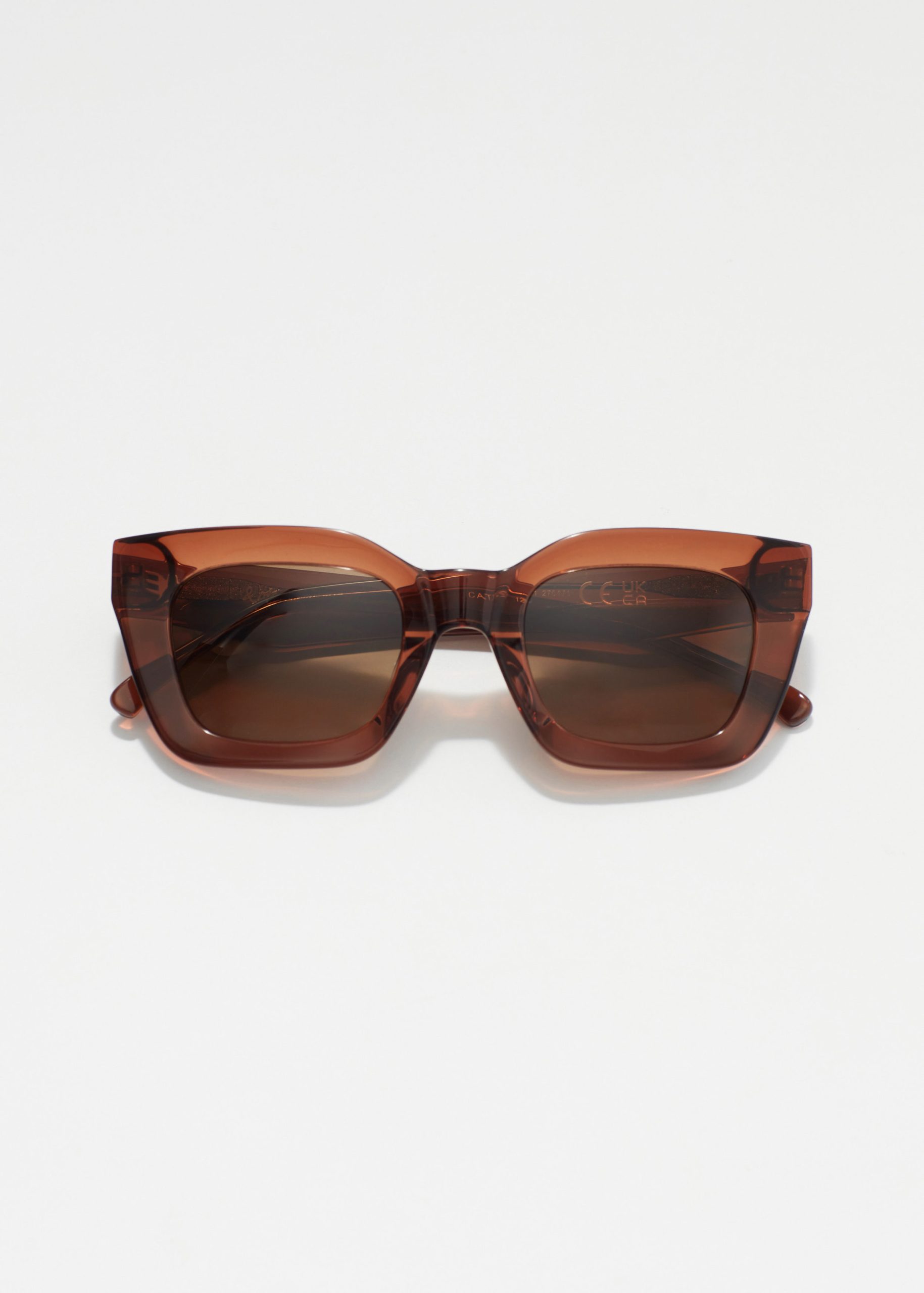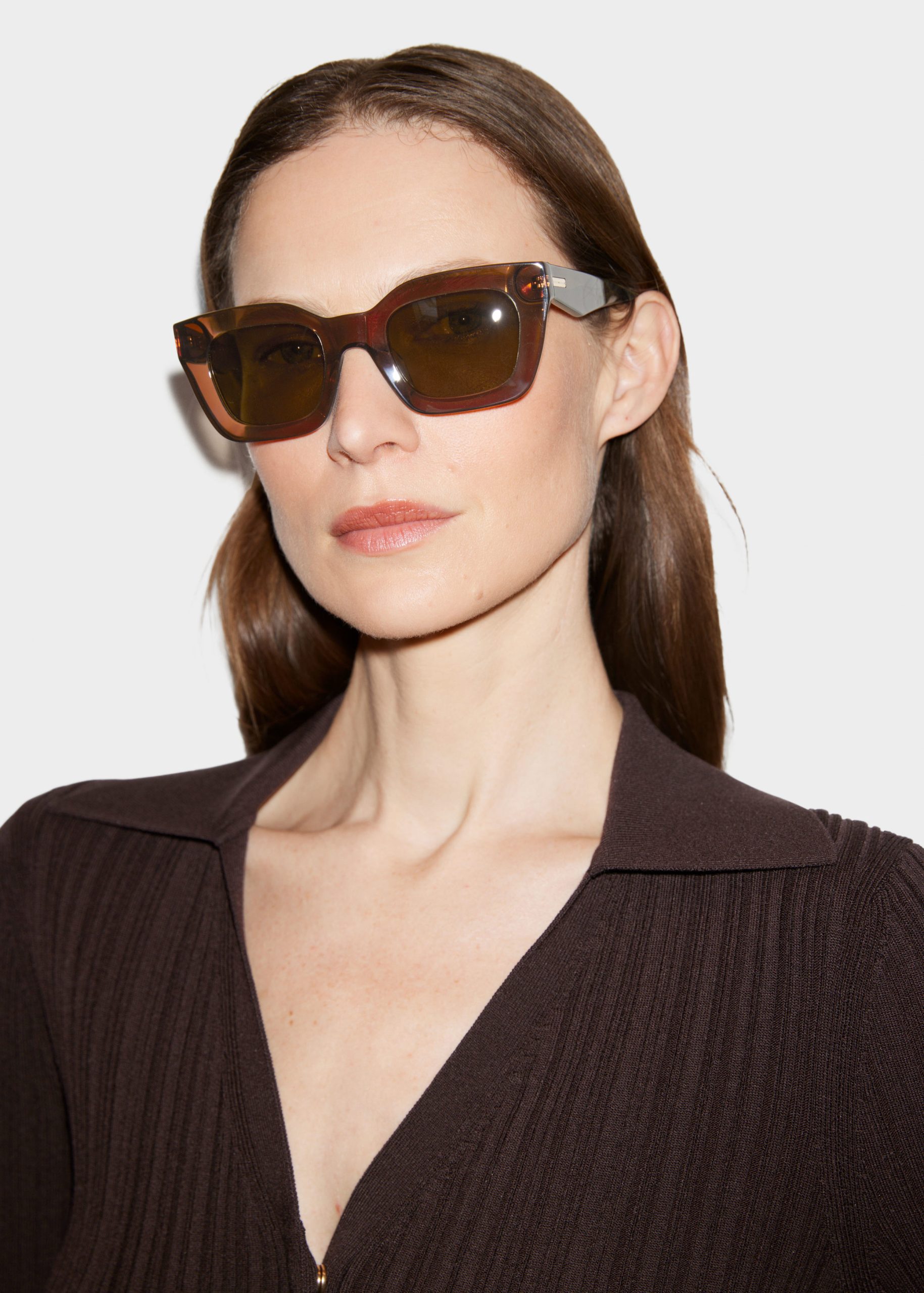 These sunglasses feature rectangular frames inspired by vintage classics, with a tad more chunkiness for a bold look. Their angular temples break up the boldness, adding a touch of lightness to the design. Crafted from acetate and fitted with tonal lenses, they offer stylish protection against the sun’s rays.