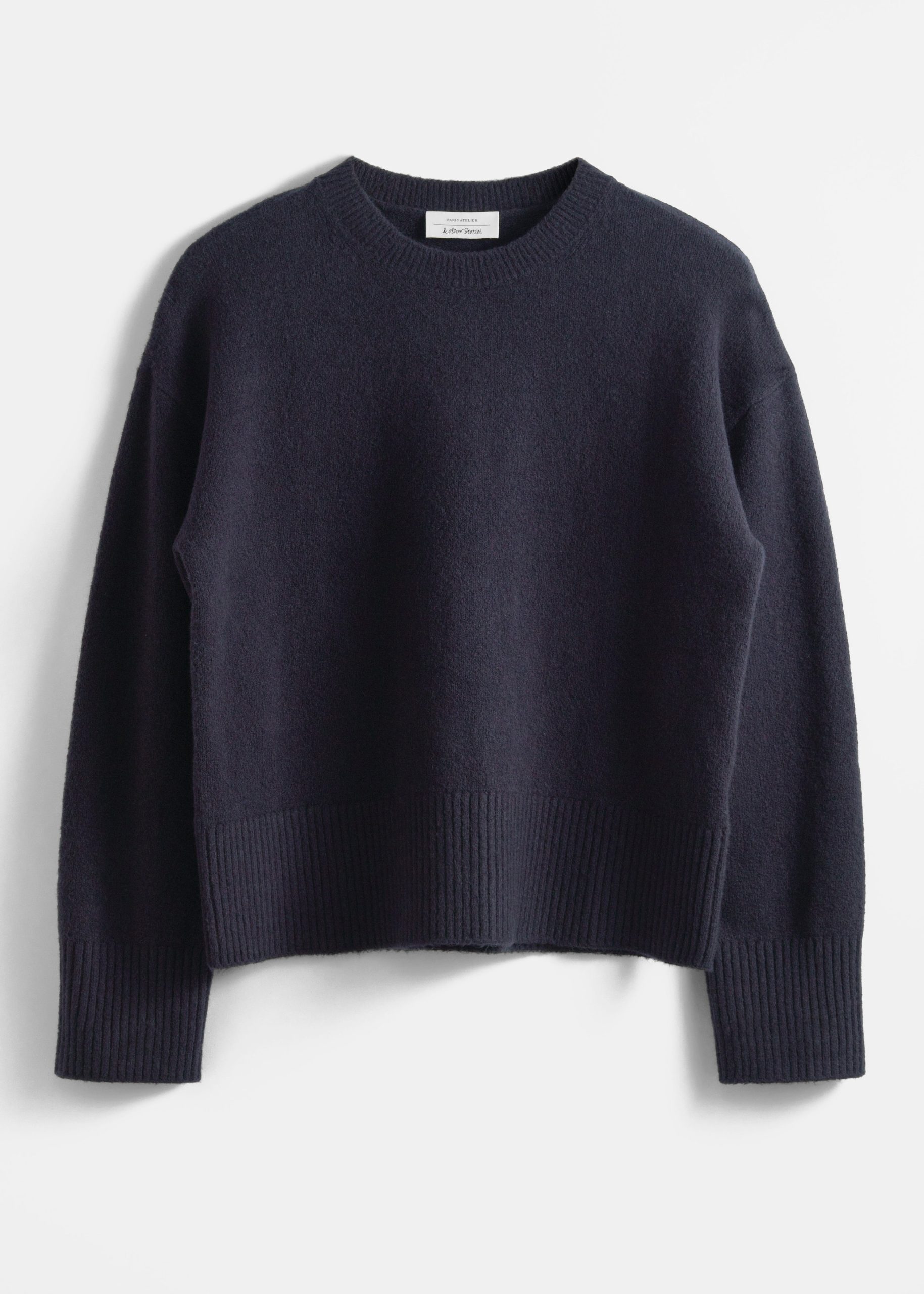 Long-sleeve knit sweater with a relaxed silhouette. Finished with a ribbed neckline, cuffs and hemline