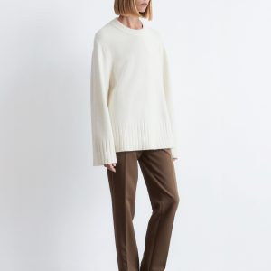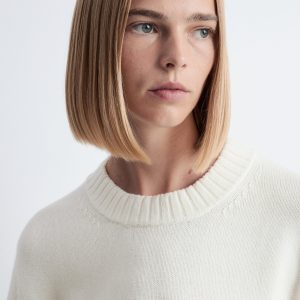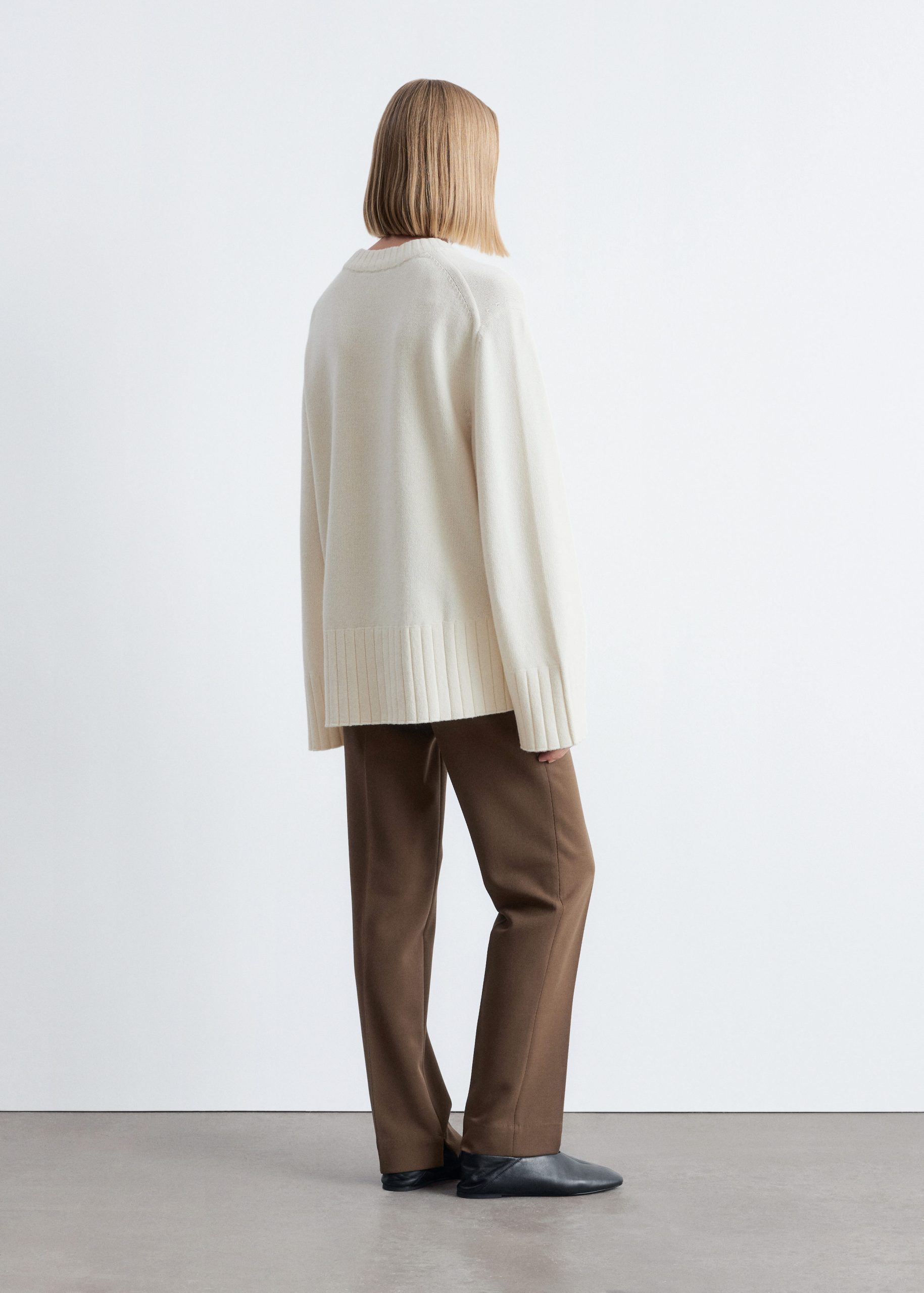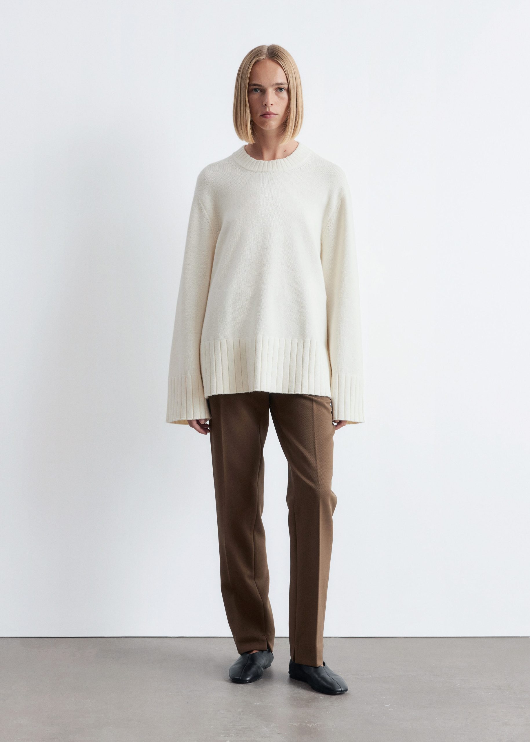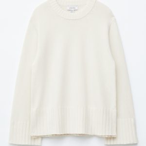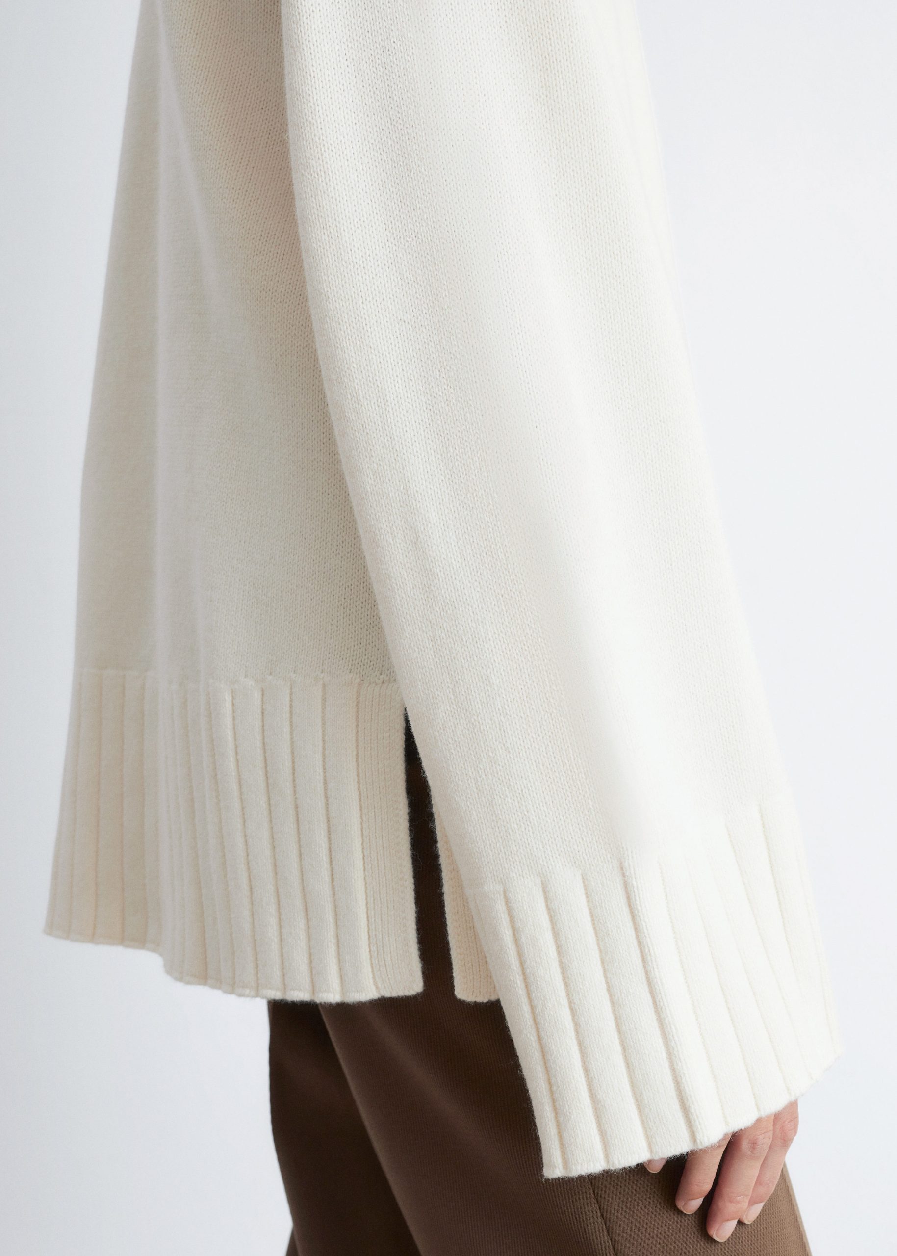 This sweater is knitted from a merino wool-cotton blend. Designed with a loose silhouette, it features wide rib detailing around the neckline, cuffs and hem, along with subtle side slits at the hem.Â